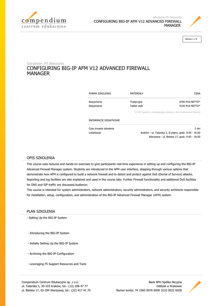 Szkolenie F5 Networks CONFIGURING BIG-IP AFM V12 ADVANCED FIREWALL MANAGER Strona 1 z 9 Szkolenie: F5 Networks CONFIGURING BIG-IP AFM V12 ADVANCED FIREWALL MANAGER FORMA SZKOLENIA MATERIAŁY CENA Stacjonarne Tradycyjne 8700 PLN NETTO* Stacjonarne Tablet ctab 9100 PLN NETTO* *(+VAT zgodnie z obowiązującą stawką w dniu wystawienia faktury) INFORMACJE DODATKOWE Czas trwania szkolenia Lokalizacje 2 dni Kraków - ul. Tatarska 5, II piętro, godz. 9:00 - 16:00 Warszawa - ul. Bielska 17, godz. 9:00 - 16:00 OPIS SZKOLENIA This course uses lectures and hands-on exercises to give participants real-time experience in setting up and configuring the BIG-IP Advanced Firewall Manager system. Students are introduced to the AFM user interface, stepping through various options that demonstrate how AFM is configured to build a network firewall and to detect and protect against DoS (Denial of Service) attacks. Reporting and log facilities are also explained and used in the course labs. Further Firewall functionality and additional DoS facilities for DNS and SIP traffic are discussed.Audience: This course is intended for system administrators, network administrators, security administrators, and security architects responsible for installation, setup, configuration, and administration of the BIG-IP Advanced Firewall Manager (AFM) system. PLAN SZKOLENIA - Setting Up the BIG-IP System - Introducing the BIG-IP System - Initially Setting Up the BIG-IP System - Archiving the BIG-IP Configuration - Leveraging F5 Support Resources and Tools Compendium Centrum Edukacyjne sp. z o.o. ul. Tatarska 5, 30-103 Kraków, tel.: (12) 298 47 77 ul. Bielska 17, 02-394 Warszawa, tel.: (22) 417 41 70 Bank BPH Spółka Akcyjna Oddział w Krakowie Numer konta: 74 1060 0076 0000 3210 0022 6028 Szkolenie F5 Networks CONFIGURING BIG-IP AFM V12 ADVANCED FIREWALL MANAGER Strona 2 z 9 - AFM Overview and Network Firewall - AFM Overview - AFM Release History - AFM Availability - What do you see? - Terminology - Network Firewall - AFM Contexts - AFM Modes - AFM Packet Processing - AFM Rules and Direction - Rules Contexts and Processing - Configuring Network Firewall - Network Firewall Rules - Geolocation - Redundant and Conflicting Rules - Stale Rules - Lists and Schedules - Rule Lists Compendium Centrum Edukacyjne sp. z o.o. ul. Tatarska 5, 30-103 Kraków, tel.: (12) 298 47 77 ul. Bielska 17, 02-394 Warszawa, tel.: (22) 417 41 70 Bank BPH Spółka Akcyjna Oddział w Krakowie Numer konta: 74 1060 0076 0000 3210 0022 6028 Szkolenie F5 Networks CONFIGURING BIG-IP AFM V12 ADVANCED FIREWALL MANAGER Strona 3 z 9 - Address Lists - Port Lists - Schedules - Policies - Policy Status and Firewall Policy Management - Inline Rule Editor - Logs - Event Logs - Logging Profiles - Log Throttling - Traffic Flow Statistics - Logging and Logging Profiles - BIG-IP Logging Mechanisms - Publisher - Log Destination - Custom Search - Logging Global Rule Events - Log Configuration Changes - QKView - Other Log Files Compendium Centrum Edukacyjne sp. z o.o. ul. Tatarska 5, 30-103 Kraków, tel.: (12) 298 47 77 ul. Bielska 17, 02-394 Warszawa, tel.: (22) 417 41 70 Bank BPH Spółka Akcyjna Oddział w Krakowie Numer konta: 74 1060 0076 0000 3210 0022 6028 Szkolenie F5 Networks CONFIGURING BIG-IP AFM V12 ADVANCED FIREWALL MANAGER Strona 4 z 9 - SNMP MIB - SNMP Traps - IP Intelligence - Overview - Architecture - Feature 1 Dynamic Black and White Lists - Black List Categories - Feed Lists - IP Intelligence Policies - IP Intelligence Log Profile - IP Intelligence Reporting - Troubleshooting IP Intelligence Lists - Feature 2 IP Intelligence Database - Licensing - Installation - Configuration - Troubleshooting - IP Intelligence Compendium Centrum Edukacyjne sp. z o.o. ul. Tatarska 5, 30-103 Kraków, tel.: (12) 298 47 77 ul. Bielska 17, 02-394 Warszawa, tel.: (22) 417 41 70 Bank BPH Spółka Akcyjna Oddział w Krakowie Numer konta: 74 1060 0076 0000 3210 0022 6028 Szkolenie F5 Networks CONFIGURING BIG-IP AFM V12 ADVANCED FIREWALL MANAGER Strona 5 z 9 - Device DoS - Policies - Policy Status and Firewall Policy Management - Inline Rule Editor - Reports - Reports - Reporting - General Reporting Facilities - Charts - Details - Report Export - Network Screens - DoS Screens - Settings - Overview - Summary - Widgets - Time Periods, Settings, Export, and Delete Options - Firewall Manager Compendium Centrum Edukacyjne sp. z o.o. ul. Tatarska 5, 30-103 Kraków, tel.: (12) 298 47 77 ul. Bielska 17, 02-394 Warszawa, tel.: (22) 417 41 70 Bank BPH Spółka Akcyjna Oddział w Krakowie Numer konta: 74 1060 0076 0000 3210 0022 6028 Szkolenie F5 Networks CONFIGURING BIG-IP AFM V12 ADVANCED FIREWALL MANAGER Strona 6 z 9 - DoS White Lists - White Lists - Configuration - tmsh - DoS Sweep Flood Protection - Sweep Flood - Configuration - IP Intelligence Shun - IP Intelligence Shun - Manual - Dynamic - IP Intelligence Policy - tmsh - Troubleshooting Compendium Centrum Edukacyjne sp. z o.o. ul. Tatarska 5, 30-103 Kraków, tel.: (12) 298 47 77 ul. Bielska 17, 02-394 Warszawa, tel.: (22) 417 41 70 Bank BPH Spółka Akcyjna Oddział w Krakowie Numer konta: 74 1060 0076 0000 3210 0022 6028 Szkolenie F5 Networks CONFIGURING BIG-IP AFM V12 ADVANCED FIREWALL MANAGER Strona 7 z 9 - DNS Firewall - DNS Firewall - DNS Query - DNS Opcodes - Troubleshooting - DNS DoS - DNS DoS - DoS Protection Profile - Device DoS - SIP DoS - Session Initiation Protocol (SIP) - Transactions and Dialogs - SIP DoS - DoS Protection Profile - Device DoS - SIP iRules Compendium Centrum Edukacyjne sp. z o.o. ul. Tatarska 5, 30-103 Kraków, tel.: (12) 298 47 77 ul. Bielska 17, 02-394 Warszawa, tel.: (22) 417 41 70 Bank BPH Spółka Akcyjna Oddział w Krakowie Numer konta: 74 1060 0076 0000 3210 0022 6028 Szkolenie F5 Networks CONFIGURING BIG-IP AFM V12 ADVANCED FIREWALL MANAGER Strona 8 z 9 - Network Firewall iRules - Network Firewall iRules - iRule Events - Use Cases - Recommended Practice - More Information - DoS iRules - DoS iRule