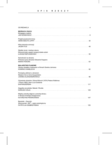 S P I S R Z E C Z Y OD REDAKCJI . . . . . . . . . . . . . . . . . . . . . . . . . . . . . . . . . . . . . . . . . . . . . . 4 BEZRUCH I RUCH Mrugaja˛ca materia JAN GONDOWICZ . . . . . . . . . . . . . . . . . . . . . . . . . . . . . . . . . . . . . . . . . . . . 6 Projekt powierzchni kina AKIRA MIZUTA LIPPIT . . . . . . . . . . . . . . . . . . . . . . . . . . . . . . . . . . . . . . . . . 30 Kilka obrazów animacji JACEK FLIG . . . . . . . . . . . . . . . . . . . . . . . . . . . . . . . . . . . . . . . . . . . . . . 48 Słodkie życie i martwa natura. Milczenie jako aspekt recepcji dzieła sztuki ŁUKASZ KIEPUSZEWSKI . . . . . . . . . . . . . . . . . . . . . . . . . . . . . . . . . . . . . . . 55 Samotność na ekranie. Filmowe życie obrazów Edwarda Hoppera MARIA POKORA . . . . . . . . . . . . . . . . . . . . . . . . . . . . . . . . . . . . . . . . . . . . 63 MALARSTWO FILMOWE Obrazy światłem malowane w filmach Dereka Jarmana KONRAD CHMIELECKI . . . . . . . . . . . . . . . . . . . . . . . . . . . . . . . . . . . . . . . . 82 Pomie˛dzy płótnem a ekranem. Śladami Goi w kinie hiszpańskim JOANNA ALEKSANDROWICZ . . . . . . . . . . . . . . . . . . . . . . . . . . . . . . . . . . . . . 96 Ożywianie obrazów: Edvard Munch (1974) Petera Watkinsa i Pasja (1982) Jean-Luca Godarda EWA MAZIERSKA . . . . . . . . . . . . . . . . . . . . . . . . . . . . . . . . . . . . . . . . . . 117 Zagadka arcydzieła. Balzak i Rivette DARIUSZ CZAJA . . . . . . . . . . . . . . . . . . . . . . . . . . . . . . . . . . . . . . . . . . . 129 Mie˛dzy prawda˛ zdje˛cia a prawda˛ obrazu. O filmach Andrieja Zwiagincewa KATARZYNA FRANKOWSKA . . . . . . . . . . . . . . . . . . . . . . . . . . . . . . . . . . . . 147 Barański – Dwurnik. Warzywniak, 360o – zapis socjologiczny PATRYCJA CEMBRZYŃSKA . . . . . . . . . . . . . . . . . . . . . . . . . . . . . . . . . . . . 155 S P I S R Z E C Z Y SZTUKA DALEKIEGO WSCHODU Malowanie ruchem. Znaczenie obrazu w filmach Akiry Kurosawy PIOTR SAWICKI . . . . . . . . . . . . . . . . . . . . . . . . . . . . . . . . . . . . . . . . . . . 170 Kilka uwag o przestrzeni w filmie japońskim KRZYSZTOF LOSKA . . . . . . . . . . . . . . . . . . . . . . . . . . . . . . . . . . . . . . . . . 190 Elegia dla ruchów kontestacyjnych w obrazach Przepływaja˛cego Świata (UKIYO-E) BARTOSZ ZAJA˛C . . . . . . . . . . . . . . . . . . . . . . . . . . . . . . . . . . . . . . . . . . 198 Inspiracje plastyczne we wczesnej twórczości Zhanga Yimou ALICJA HELMAN . . . . . . . . . . . . . . . . . . . . . . . . . . . . . . . . . . . . . . . . . . . 210 OKIEM I UCHEM Debata kuchenna. Historia jednego nagrania i jednego zdje˛cia MARCIN GIŻYCKI . . . . . . . . . . . . . . . . . . . . . . . . . . . . . . . . . . . . . . . . . . 221 POŻEGNANIA Zbigniew Czeczot-Gawrak (1911-2009) RAFAŁ MARSZAŁEK . . . . . . . . . . . . . . . . . . . . . . . . . . . . . . . . . . . . . . . . . 225 KSIA˛ŻKI O FILMIE Gabinet luster Krzysztofa Kieślowskiego MAGDALENA KEMPNA . . . . . . . . . . . . . . . . . . . . . . . . . . . . . . . . . . . . . . . 227 Filmowe oblicza kontestacji MIROSŁAW PRZYLIPIAK . . . . . . . . . . . . . . . . . . . . . . . . . . . . . . . . . . . . . . 231 NOTY O AUTORACH . . . . . . . . . . . . . . . . . . . . . . . . . . . . . . . . . . . . . . . . 237 SUMMARY . . . . . . . . . . . . . . . . . . . . . . . . . . . . . . . . . . . . . . . . . . . . . . 238 TABLE DES MATIÈRES . . . . . . . . . . . . . . . . . . . . . . . . . . . . . . . . . . . . . . . 240