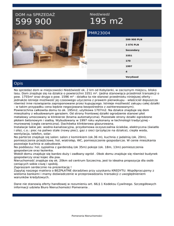 DOM na SPRZEDAŻ 599 900 Niedźwiedź 195 m2 PMR23004 599 900 PLN 3 076 PLN Secondary 3351 170 1997 4 VeryGood Opis Na sprzedaż dom w miejscowości Niedźwiedź ok. 2 km od Kobylanki, w zacisznym miejscu, blisko lasu. Dom znajduje się na działce o powierzchni 3351 m². (jedna stanowiąca przedmiot transakcji o pow. 1755m² oraz druga o pow. 1596 m² - działka ta nie stanowi przedmiotu niniejszej oferty jednakże istnieje możliwość jej czasowego użyczenia z prawem pierwokupu - właściciel dopuszcza również inne rozwiązania zaproponowane przez kupującego. Istnieje możliwość zakupu całej działki - w takim przypadku cena będzie negocjowana bezpośrednio z zainteresowanym). Powierzchnia całkowita domu to ok. 195m2, użytkowa 1707m2. Na działce znajduje się dom mieszkalny z wbudowanym garażem. Od strony frontowej działki ogrodzenie stanowi płot metalowy umocowany w klinkierze (brama automatyczna). Pozostałe strony działki ogrodzone płotem betonowym i siatką. Wybudowany w 1997 roku wykonany w technologii tradycyjnej murowanej (cegła ceramiczna). Dachówka klinkierowa glazurowana. Instalacje takie jak: wodno-kanalizacyjna, przydomowa oczyszczalnia ścieków, elektryczna (światło i siła), c.o.: piec na paliwo stałe (nowy piec), gaz z sieci (przyłącze na działce), ciepła woda, wentylacja, telefon, solar. Na parterze znajduje się salon: salon z kominkiem (ok.36 m), kuchnia z jadalnią (ok. 20m), pomieszczenie przejściowe, hol, wiatrołap, WC, pomieszczenie gospodarcze. W cenie mieszkania pozostaje kuchnia w zabudowie. Na poddaszu: hol, sypialnia z garderobą (ok 35m) pokoje (ok. 18m, 13m) pomieszczenia gospodarcze oraz łazienka. Wokół domu znajduje się bardzo duży i zadbany ogród . Obok domu znajduje się również budynek gospodarczy oraz kojec dla psa. Nieruchomość znajduje się ok. 20km od centrum Szczecina, jest to idealna propozycja dla osób ceniących sobie ciszę i spokój. Zapraszam serdecznie na prezentację ! Zapytaj naszego maklera o BEZPŁATNE doradztwo przy uzyskaniu KREDYTU. Współpracujemy z wieloma bankami i mamy doświadczenie w przeprowadzaniu transakcji z uwzględnieniem warunków kredytowych. Dane nie stanowią oferty handlowej w rozumieniu art. 66,§ 1 Kodeksu Cywilnego. Szczegółowych informacji udziela Biuro Nieruchomości Pomerania . Pomerania Nieruchomości Wojciech Hodyl tel. 534210021, 913508888 email: [email protected] Pomerania Nieruchomości Powered by TCPDF (www.tcpdf.org)