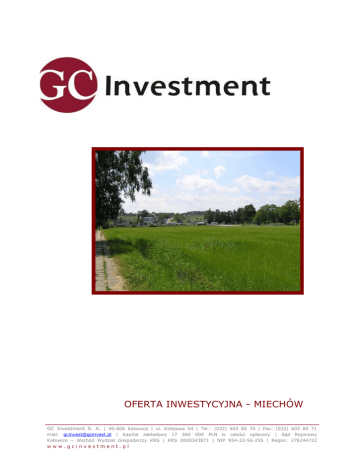 OFERTA INWESTYCYJNA - MIECHÓW GC Investment S. A. | 40-606 Katowice | ul. Kolejowa 54 | Tel.: (032) 603 85 70 | Fax: (032) 603 85 71 mail: [email protected] | Kapitał zakładowy 17 560 000 PLN w całości opłacony | Sąd Rejonowy Katowice – Wschód Wydział Gospodarczy KRS | KRS 0000343871 | NIP 954-22-56-255 | Regon: 276244722 www.gcinvestment.pl Strona: 2 z 6 1. NIERUCHOMOŚĆ a) Powierzchnia – 1 ha b) Lokalizacja 40 km od Krakowa Skomunikowana z drogą krajową E7, dostępną od ulicy Konopnickiej oraz Racławickiej c) Otoczenie Zakłady przemysłowe i usługowe Budynki jednorodzinne i wielorodzinne w zabudowie mieszkaniowej Szkoła, komisariat policji Stacja benzynowa oraz stacja kontroli pojazdów w sąsiedztwie Obiekty handlowe d) Przeznaczenie Oferowana nieruchomość Przestrzennego. nie posiada miejscowego Planu Zagospodarowania Oferowany teren inwestycji doskonale nadaje się pod: Hotel lub motel, Retail Park, Obiekt biurowy Obszar inwestycji GC Investment S.A. | 40-606 Katowice | ul. Kolejowa 54 | Tel.: (032) 603 85 70 | Fax: (032) 603 85 71 mail: [email protected] | NIP 954-22-56-255 | Regon: 276244722 | Kapitał zakładowy 17 560 000 PLN (w całości opłacony) | Rejestr. Sąd Rejonowy Katowice – Wschód Wydział Gospodarczy KRS | KRS 0000343871 www.gcinvestment.pl Strona: 3 z 6 2. MIASTO – MIECHÓW Powiat miechowski usytuowany jest w północnej części Małopolski, niecałe 40 km od aglomeracji krakowskiej i 80 km od Kielc. Graniczy z siedmioma powiatami z terenu trzech województw. Jednostkę samorządową tworzy siedem gmin: miejsko-wiejska (Miechów) i sześć wiejskich (Charsznica, Gołcza, Kozłów, Książ Wielki, Racławice i Słaboszów). W skład powiatu wchodzi 150 miejscowości. Powierzchnia powiatu wynosi 676 km2. Ludność powiatu liczy prawie 51 tys. osób, w tym prawie 12 tys., mieszka w Miechowie. Użytki rolne stanowią 79% obszaru powiatu, który charakteryzuje się 3. AGLOMERACJA KRAKOWSKA Aglomeracja krakowska – inaczej Krakowski Obszar Metropolitalny zajmuje powierzchnię 51 gmin, zamieszkiwanych przez ok. 1,45 miliona ludzi. Zajmuje powierzchnię 4069 km². GC Investment S.A. | 40-606 Katowice | ul. Kolejowa 54 | Tel.: (032) 603 85 70 | Fax: (032) 603 85 71 mail: [email protected] | NIP 954-22-56-255 | Regon: 276244722 | Kapitał zakładowy 17 560 000 PLN (w całości opłacony) | Rejestr. Sąd Rejonowy Katowice – Wschód Wydział Gospodarczy KRS | KRS 0000343871 www.gcinvestment.pl Strona: 4 z 6 4. KONTAKT Maciej Górny Paweł Róg Kierownik Działu Pozyskiwania i sprzedaży nieruchomości Specjalista ds. pozyskiwania sprzedaży nieruchomości Mail: [email protected] Mail: [email protected] Tel.: (032) 603 Fax.: (032) 603 GSM: 668 872 432 74 85 16 71 www.gcinvestment.pl Tel.: (032) 603 Fax.: (032) 603 GSM: 668 872 439 74 85 i 16 71 www.gcinvestment.pl 5. O FIRMIE GC INVESTMENT: GC INVESTMENT S. A. z siedzibą w Katowicach działa od 1996 r. Początkowo zajmowała się pozyskiwaniem nieruchomości i gospodarczym ich wykorzystaniem na własny rachunek. Z czasem Spółka rozwinęła swoją działalność o poszukiwanie terenów inwestycyjnych dla inwestorów zewnętrznych i obsługę procesu inwestycyjnego, korzystając przy wykonawstwie z usług Zakładu Remontowo-Budowlanego „GOLI GLASS” i innych firm zewnętrznych. Po połączeniu Spółka dysponuje potencjałem, który pozwala jej samodzielnie i fachowo obsłużyć cały proces inwestycyjny bądź jego dowolny etap zależnie od potrzeb inwestora. Kompleksowość naszej oferty polega na: 1. Zaplanowaniu (wypracowanie koncepcji oraz planu inwestycji) 2. Przygotowaniu (przygotowanie dokumentów formalnych-prawnych, przygotowanie projektu architektonicznego, budowlanego, wykonawczego) 3. Realizacji inwestycji (prace budowlane oraz kontrola realizacji inwestycji) Nad każdym projektem pracuje 5 wyspecjalizowanych działów: Dział Pozyskiwania i sprzedaży nieruchomości zajmuje się wyszukiwaniem nieruchomości i analizą możliwości ich gospodarczego wykorzystania oraz poszukiwaniem inwestorów, odpowiedzialny jest również za sprzedaż oraz komercjalizację projektów GC Investment GC Investment S.A. | 40-606 Katowice | ul. Kolejowa 54 | Tel.: (032) 603 85 70 | Fax: (032) 603 85 71 mail: [email protected] | NIP 954-22-56-255 | Regon: 276244722 | Kapitał zakładowy 17 560 000 PLN (w całości opłacony) | Rejestr. Sąd Rejonowy Katowice – Wschód Wydział Gospodarczy KRS | KRS 0000343871 www.gcinvestment.pl Strona: 5 z 6 Pracownia architektoniczna kreuje koncepcję wizualną projektu oraz prowadzi wszelkie działania do uzyskania pozwolenia na budowę, Dział Marketingu i PR bierze udział w tworzeniu koncepcji projektu oraz w "opakowaniu" produktu i wsparciu sprzedaży, Dział Organizacyjno-prawny zapewnia optymalny dobór zasobów i nadzór nad aspektami formalno-prawnymi oraz finansowymi, Dział Realizacji inwestycji zajmuje się fizycznym wykonawstwem projektu, Firma GC Investment S. A. należy do organizacji: Do tej pory samodzielnie bądź we współpracy z innymi firmami zrealizowaliśmy następujące projekty inwestycyjne: Obiekty handlowe: Zleceniodawca E.Leclerc Kaufland Miejsce (miasto) Katowice, Tychy Tychy, Chorzów, Tarnowskie Góry, Katowice, Tarnowskie Góry, Olkusz Lidl Gliwice ul. Poezji oraz ul. Toszecka Zabrze Biedronka Netto Bytom ul. Łużycka oraz ul. Frendzla Rybnik, Ruda Śląska, Bielsko Biała Sosnowiec, Bytom GC Investment S.A. | 40-606 Katowice | ul. Kolejowa 54 | Tel.: (032) 603 85 70 | Fax: (032) 603 85 71 mail: [email protected] | NIP 954-22-56-255 | Regon: 276244722 | Kapitał zakładowy 17 560 000 PLN (w całości opłacony) | Rejestr. Sąd Rejonowy Katowice – Wschód Wydział Gospodarczy KRS | KRS 0000343871 www.gcinvestment.pl Strona: 6 z 6 Stacje benzynowe: Zleceniodawca st1 Statoil Shell Miejsce (miasto) Olkusz Rybnik Gliwice Tarnowskie Góry Salony samochodowe: Zleceniodawca Miejsce (miasto) Toyota Katowice, Częstochowa Lexus Katowice Fo