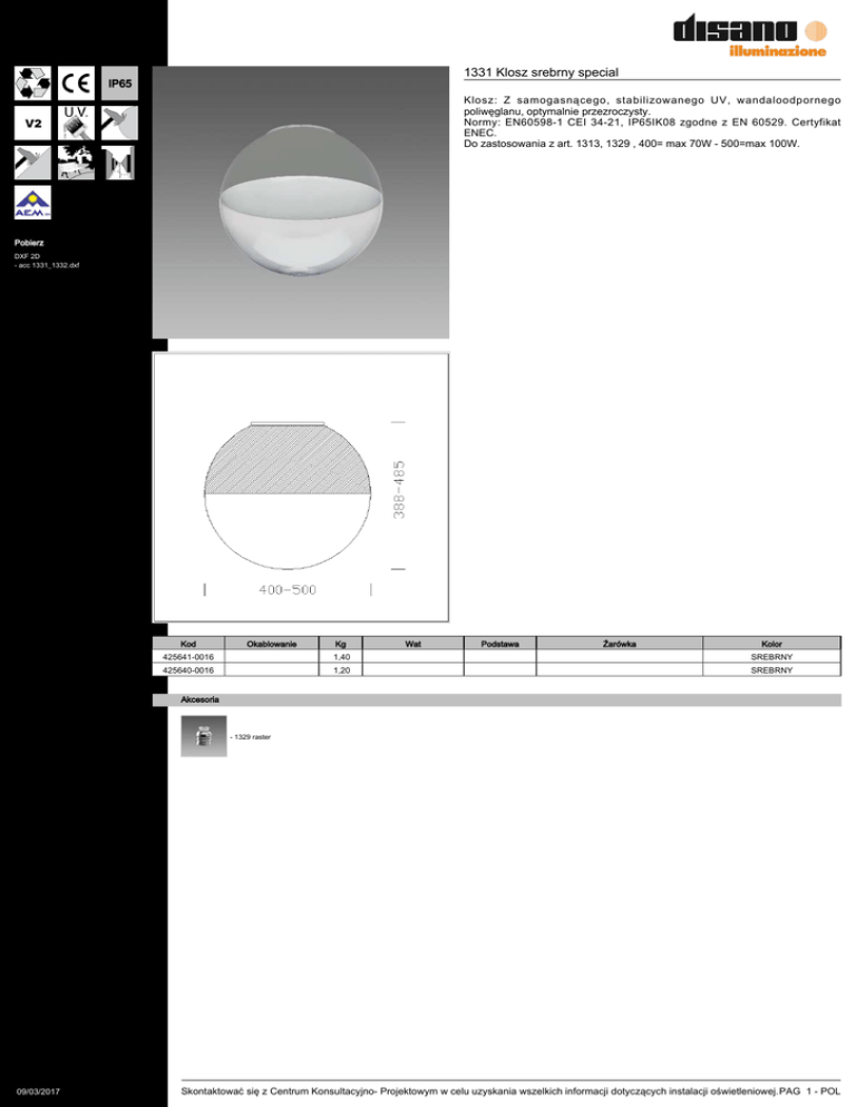 1331 Klosz srebrny special Klosz: Z samogasnącego, stabilizowanego UV, wandaloodpornego poliwęglanu, optymalnie przezroczysty. Normy: EN60598-1 CEI 34-21, IP65IK08 zgodne z EN 60529. Certyfikat ENEC. Do zastosowania z art. 1313, 1329 , 400= max 70W - 500=max 100W. Pobierz DXF 2D - acc 1331_1332.dxf Kod Okablowanie Kg Wat Podstawa Źarówka Kolor 425641-0016 1,40 SREBRNY 425640-0016 1,20 SREBRNY Akcesoria - 1329 raster 09/03/2017 Skontaktować się z Centrum Konsultacyjno- Projektowym w celu uzyskania wszelkich informacji dotyczących instalacji oświetleniowej. PAG 1 - POL