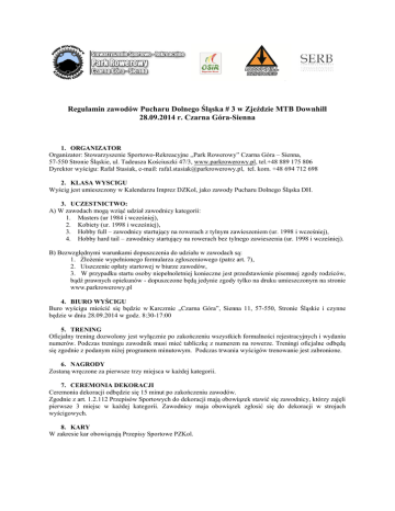 Regulamin zawodów Pucharu Dolnego Śląska # 3 w Zjeździe MTB Downhill 28.09.2014 r. Czarna Góra-Sienna 1. ORGANIZATOR Organizator: Stowarzyszenie Sportowo-Rekreacyjne ,,Park Rowerowy” Czarna Góra – Sienna, 57-550 Stronie Śląskie, ul. Tadeusza Kościuszki 47/3, www.parkrowerowy.pl, tel.+48 889 175 806 Dyrektor wyścigu: Rafał Stasiak, e-mail: [email protected], tel. kom. +48 694 712 698 2. KLASA WYSCIGU Wyścig jest umieszczony w Kalendarzu Imprez DZKol, jako zawody Pucharu Dolnego Śląska DH. 3. UCZESTNICTWO: A) W zawodach mogą wziąć udział zawodnicy kategorii: 1. Masters (ur 1984 i wcześniej), 2. Kobiety (ur. 1998 i wcześniej), 3. Hobby full – zawodnicy startujący na rowerach z tylnym zawieszeniem (ur. 1998 i wcześniej), 4. Hobby hard tail – zawodnicy startujący na rowerach bez tylnego zawieszenia (ur. 1998 i wcześniej). B) Bezwzględnymi warunkami dopuszczenia do udziału w zawodach są: 1. Złożenie wypełnionego formularza zgłoszeniowego (patrz art. 7), 2. Uiszczenie opłaty startowej w biurze zawodów, 3. W przypadku startu osoby niepełnoletniej konieczne jest przedstawienie pisemnej zgody rodziców, bądź prawnych opiekunów - dopuszczone będą jedynie zgody tylko na druku umieszczonym na stronie www.parkrowerowy.pl 4. BIURO WYŚCIGU Buro wyścigu mieścić się będzie w Karczmie „Czarna Góra”, Sienna 11, 57-550, Stronie Śląskie i czynne będzie w dniu 28.09.2014 w godz. 8:30-17:00 5. TRENING Oficjalny trening dozwolony jest wyłącznie po zakończeniu wszystkich formalności rejestracyjnych i wydaniu numerów. Podczas treningu zawodnik musi mieć tabliczkę z numerem na rowerze. Treningi oficjalne odbędą się zgodnie z podanym niżej programem minutowym. Podczas trwania wyścigów trenowanie jest zabronione. 6. NAGRODY Zostaną wręczone za pierwsze trzy miejsca w każdej kategorii. 7. CEREMONIA DEKORACJI Ceremonia dekoracji odbędzie się 15 minut po zakończeniu zawodów. Zgodnie z art. 1.2.112 Przepisów Sportowych do dekoracji mają obowiązek stawić się zawodnicy, którzy zajęli pierwsze 3 miejsc w każdej kategorii. Zawodnicy maja obowiązek zgłosić się do dekoracji w strojach wyścigowych. 8. KARY W zakresie kar obowiązują Przepisy Sportowe PZKol. 9. PROGRAM MINUTOWY: 28.09.2014 Dzień zawodów: godz. 8.30 – 11.00 – zapisy zawodników godz. 8.30 – odprawa służb zabezpieczających godz. 9.00 – 11.30 – treningi godz. 12.00 – 1 przejazd – kolejność startów: Kobiety, Masters, Hobby hard tail, Hobby Full godz. 14.00 – 2 przejazd – kolejność startów grup j/w godz. 16.00 – 16.30 – dekoracja zwycięzców 10. ZASADY FINANSOWANIA Opłata startowa: 1. Opłata startowa zawodów wynosi: a) Wszystkie kategorie 60zł b) Dla zapisanych przez internet do dnia 26.09.2014 opłata startowa 50zł (uiszczona w dniu zawodów w biurze) 2. Opłata upoważnia do korzystania z kolei linowej w dniu zawodów nieodpłatnie. 11. ZASADY BEZPIECZEŃSTWA Podczas zawodów stosowany będzie system chorągiewek: Zawodnik widzący powiewającą żółtą chorągiewkę ma obowiązek zatrzymać się lub wolno zjeżdżać w dół Zawodnik widzący powiewającą czerwona chorągiewkę ma obowiązek natychmiast zatrzymać się. Zatrzymani zawodnicy spokojnie, lecz bezzwłocznie muszą, udać się na linie mety i zgłosić się do sędziego mety. 12. OBOWIAZKOWE WYPOSAŻENIE Posiadanie odpowiedniego sprzętu: rower górski, co najmniej z przednim amortyzatorem i sprawnymi dwoma hamulcami, kask pełny zintegrowany (osłona na podbródek), oraz ochraniaczy: ochrona na kręgosłup („zbroja”), nałokietniki, nakolanniki, naramienniki, watowania ud, długie spodnie, koszula z długimi rękawami, pełne rękawiczki z palcami. 13. SKŁAD KOMISJI SĘDZIOWSKIEJ Sędziego głównego wyznacza Kolegium Sędziów DZKol. 14. KONTROLA ANTYDOPINGOWA Podczas zawodów obowiązują przepisy antydopingowe UCI i PZKol. 15. WYKAZ SZPITALI W POBLIŻU TRASY Szpital Rejonowy, ul. Szpitalna 1a, 57-300 Kłodzko, Telefon: 074-8651200 Specjalistyczne Centrum Medyczne w Polanicy Zdrój, Polanica Zdrój, 57-320, ul. Jana Pawła II 2. Tel. 074-8621110 16. ZGŁOSZENIA: Zgłoszenia należy dokonywać drogą elektroniczną na stronie (informacja na stronie www.parkrowerowy.pl), do 26 wrzesień 2014 do godziny 22:00 lub bezpośrednio przed imprezą w biurze zawodów. 1. 2. 3. 4. 5. 6. 17. PRZEPISY KOŃCOWE Zawody zostaną przeprowadzone zgodnie z przepisami PZKol.- Bieg wstępny, który ustala kolejność startu w finale, gdzie zwycięża zawodnik z najlepszym czasem. Organizator nie ponosi odpowiedzialności za wypadki losowe zaistniałe podczas zawodów, dojazdu uczestników na zawody i powrotu z nich. Uczestnik startuje na własną odpowiedzialność (w przypadku zawodników niepełnoletnich na odpowiedzialność rodziców lub prawnych opiekunów). Organizator nie ponosi odpowiedzialności za ewentualne zaistniałe wypadki i kradzieże. Interpretacja niniejszego regulaminu należy do Sędziego Głównego w porozumieniu z przedstawicielem organizatorem zawodów. Zgłoszenie uczestnictwa w imprezie jest równoznaczne z akceptacją niniejszego regulaminu.