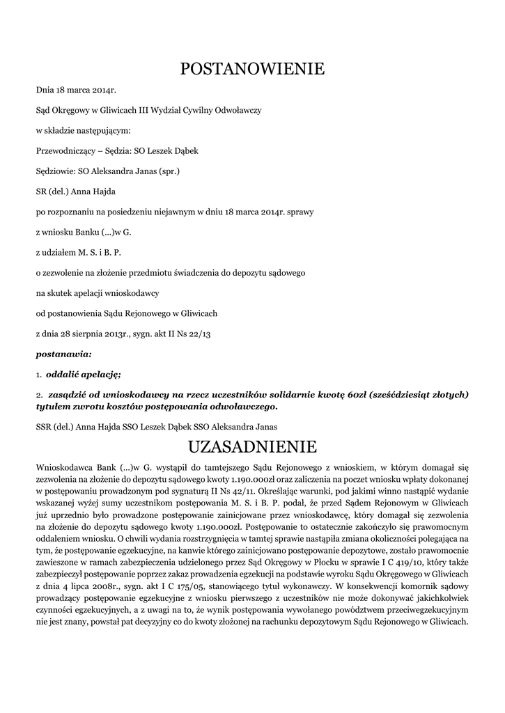 POSTANOWIENIE Dnia 18 marca 2014r. Sąd Okręgowy w Gliwicach III Wydział Cywilny Odwoławczy w składzie następującym: Przewodniczący – Sędzia: SO Leszek Dąbek Sędziowie: SO Aleksandra Janas (spr.) SR (del.) Anna Hajda po rozpoznaniu na posiedzeniu niejawnym w dniu 18 marca 2014r. sprawy z wniosku Banku (...)w G. z udziałem M. S. i B. P. o zezwolenie na złożenie przedmiotu świadczenia do depozytu sądowego na skutek apelacji wnioskodawcy od postanowienia Sądu Rejonowego w Gliwicach z dnia 28 sierpnia 2013r., sygn. akt II Ns 22/13 postanawia: 1. oddalić apelację; 2. zasądzić od wnioskodawcy na rzecz uczestników solidarnie kwotę 60zł (sześćdziesiąt złotych) tytułem zwrotu kosztów postępowania odwoławczego. SSR (del.) Anna Hajda SSO Leszek Dąbek SSO Aleksandra Janas UZASADNIENIE Wnioskodawca Bank (...)w G. wystąpił do tamtejszego Sądu Rejonowego z wnioskiem, w którym domagał się zezwolenia na złożenie do depozytu sądowego kwoty 1.190.000zł oraz zaliczenia na poczet wniosku wpłaty dokonanej w postępowaniu prowadzonym pod sygnaturą II Ns 42/11. Określając warunki, pod jakimi winno nastąpić wydanie wskazanej wyżej sumy uczestnikom postępowania M. S. i B. P. podał, że przed Sądem Rejonowym w Gliwicach już uprzednio było prowadzone postępowanie zainicjowane przez wnioskodawcę, który domagał się zezwolenia na złożenie do depozytu sądowego kwoty 1.190.000zł. Postępowanie to ostatecznie zakończyło się prawomocnym oddaleniem wniosku. O chwili wydania rozstrzygnięcia w tamtej sprawie nastąpiła zmiana okoliczności polegająca na tym, że postępowanie egzekucyjne, na kanwie którego zainicjowano postępowanie depozytowe, zostało prawomocnie zawieszone w ramach zabezpieczenia udzielonego przez Sąd Okręgowy w Płocku w sprawie I C 419/10, który także zabezpieczył postępowanie poprzez zakaz prowadzenia egzekucji na podstawie wyroku Sądu Okręgowego w Gliwicach z dnia 4 lipca 2008r., sygn. akt I C 175/05, stanowiącego tytuł wykonawczy. W konsekwencji komornik sądowy prowadzący postępowanie egzekucyjne z wniosku pierwszego z uczestników nie może dokonywać jakichkolwiek czynności egzekucyjnych, a z uwagi na to, że wynik postępowania wywołanego powództwem przeciwegzekucyjnym nie jest znany, powstał pat decyzyjny co do kwoty złożonej na rachunku depozytowym Sądu Rejonowego w Gliwicach. Uczestnicy postępowania M. S. i B. P. domagali się oddalenia wniosku i zasądzenia od wnioskodawcy kosztów postępowania. Podnieśli, że rozpoznając poprzedni wniosek Sąd Okręgowy w Gliwicach orzekł o jego oddaleniu (postanowieniem z dnia 5 czerwca, wydanym w sprawie III Ca 956/12) ponieważ stwierdził brak przesłanek z art.467 pkt 4 k.c., stanowiącego podstawę złożenia wniosku. Zarzucili także, że w obecnym wniosku nie powołano żadnej materialnoprawnej podstawy złożenia świadczenia do depozytu sądowego. Twierdzili, że okolicznością uzasadniającą wniosek nie jest prowadzenie postępowania egzekucyjnego przez obu bądź jednego z wierzycieli solidarnych, a nadto wskazali, że postanowienie Sądu Okręgowego w Płocku w przedmiocie zabezpieczenia powództwa poprzez zakazanie prowadzenia postępowania egzekucyjnego w dniu 26 czerwca 2013r. zostało uchylone przez Sąd Apelacyjny w Łodzi, a wniosek o zabezpieczenie przekazano do ponownego rozpoznania. Uczestnicy podtrzymali także swoje stanowisko wyrażane w toku poprzedniego postępowania, podkreślając w szczególności, że wnioskodawca mając ku temu możliwość, nie spełnił świadczenia dobrowolnie lecz wystąpił z wnioskiem o przyjęcie świadczenia do depozytu sądowego, co narusza ich interesy jako wierzycieli. Zaskarżonym postanowieniem z 28 sierpnia 2013r. Sąd Rejonowy w Gliwicach oddalił wniosek i zasądził od wnioskodawcy solidarnie na rzecz uczestników kwotę 154zł tytułem zwrotu kosztów postępowania. Sąd ten uznał, że powoływane przez wnioskodawcę okoliczności nie uzasadniały wydania zezwolenia na złożenie przedmiotu świadczenia do depozytu sądowego. Stwierdził przy tym Sąd, że choć wnioskodawca nie wypowiedział się jasno w tej kwestii, treść wniosku wskazywała, że jego podstawę stanowi art.467 pkt 4 k.c. (omyłkowo: k.p.c.), zgodnie z którym świadczenie może zostać złożone do depozytu sądowego jeżeli z powodu innych okoliczności dotyczących osoby wierzyciela świadczenie nie może być spełnione, co w sprawie nie miało miejsca. Rozstrzygnięcie zapadło w oparciu o powołany wyżej przepis oraz art.6931 k.p.c. O kosztach postępowania orzeczono po myśli art.520 § 2 k.p.c. W apelacji od tego postanowienia wnioskodawca zarzucił naruszenie przepisów postępowania, które mogło mieć istotny wpływ na wynik sprawy, a to art.328 § 2 k.p.c. poprzez brak wyjaśnienia w uzasadnieniu podstawy faktycznej orzeczenia, podczas gdy element ten jest obligatoryjnym składnikiem uzasadnienia. W oparciu o ten zarzut skarżący domagał się uchylenia postanowienia i przekazania sprawy Sądowi Rejonowemu do ponownego rozpoznania, a na wypadek nieuwzględnienia tego zarzutu podnosił zarzut błędu w ustaleniach faktycznych wziętych za podstawę orzeczenia, a polegający na błędnym założeniu, że w sprawie nie wystąpiły inne okoliczności dotyczące osoby wierzyciela, z powodu których świadczenie nie może być spełnione. Na tej podstawie domagał się zmiany zaskarżonego postanowienia poprzez uwzględnienie wniosku oraz zasądzenia od uczestników kosztów postępowania za obie instancje. Skarżący wywodził w szczególności, że przewidziane w art.6931 k.p.c. ograniczenie kognicji sądu w sprawach depozytowych nie uzasadnia całkowitego braku ustaleń faktycznych, a uchybienie to uniemożliwia kontrolę instancyjną zaskarżonego postanowienia. Dodatkowo argumentował, że w jego ocenie - choć postępowanie egzekucyjne prowadzone pod sygnaturą Km 683/09 zostało prawomocnie umorzone, a tytuł 