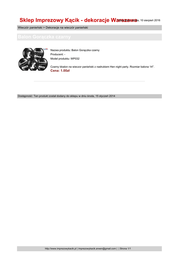Utworzono: środa, 10 sierpień 2016 Sklep Imprezowy Kącik - dekoracje Warszawa Wieczór panieński > Dekoracje na wieczór panieński Balon Gorączka czarny Nazwa produktu: Balon Gorączka czarny Producent: Model produktu: WP032 Czarny bbalon na wieczor panieński z nadrukiem Hen night party. Rozmiar balona 14''. Cena: 1.00zł Dostępność: Ten produkt został dodany do sklepu w dniu środa, 15 styczeń 2014 http://www.imprezowykacik.pl | [email protected] | | Strona 1/1