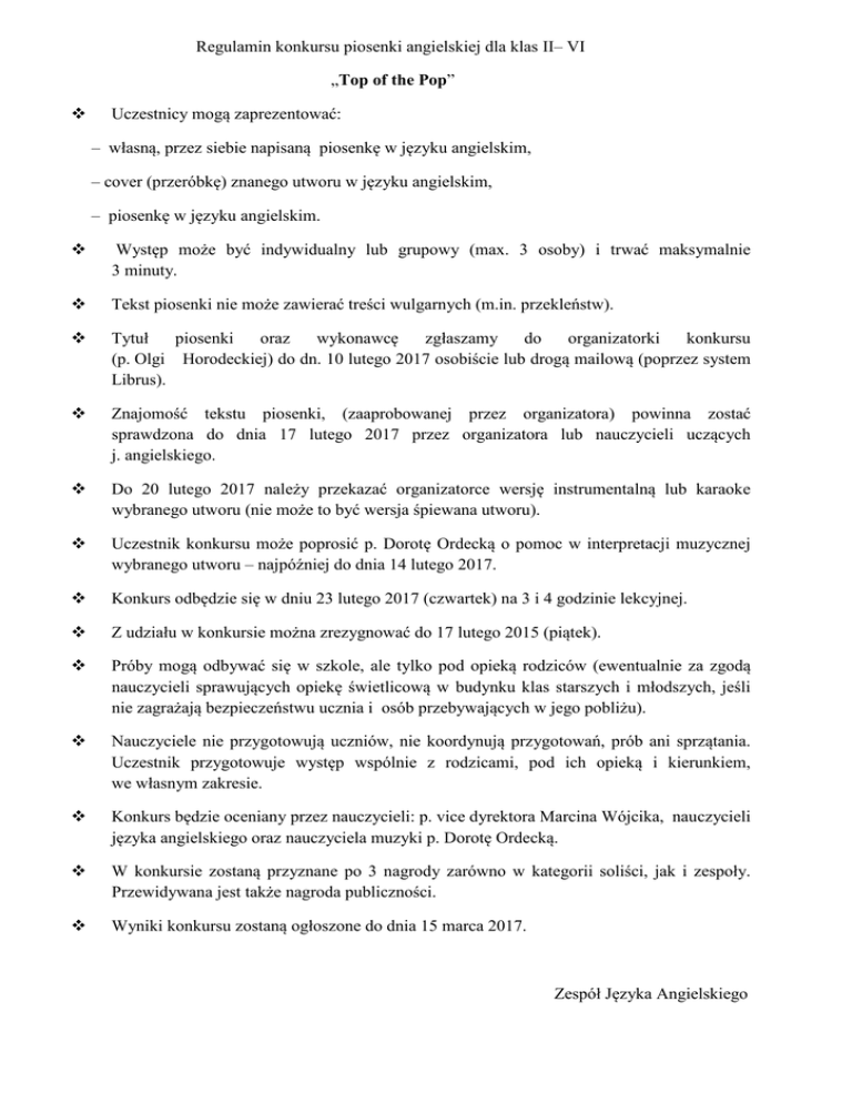 Regulamin konkursu piosenki angielskiej dla klas II– VI „Top of the Pop” Uczestnicy mogą zaprezentować: – własną, przez siebie napisaną piosenkę w języku angielskim, – cover (przeróbkę) znanego utworu w języku angielskim, – piosenkę w języku angielskim. Występ może być indywidualny lub grupowy (max. 3 osoby) i trwać maksymalnie 3 minuty. Tekst piosenki nie może zawierać treści wulgarnych (m.in. przekleństw). Tytuł piosenki oraz wykonawcę zgłaszamy do organizatorki konkursu (p. Olgi Horodeckiej) do dn. 10 lutego 2017 osobiście lub drogą mailową (poprzez system Librus). Znajomość tekstu piosenki, (zaaprobowanej przez organizatora) powinna zostać sprawdzona do dnia 17 lutego 2017 przez organizatora lub nauczycieli uczących j. angielskiego. Do 20 lutego 2017 należy przekazać organizatorce wersję instrumentalną lub karaoke wybranego utworu (nie może to być wersja śpiewana utworu). Uczestnik konkursu może poprosić p. Dorotę Ordecką o pomoc w interpretacji muzycznej wybranego utworu – najpóźniej do dnia 14 lutego 2017. Konkurs odbędzie się w dniu 23 lutego 2017 (czwartek) na 3 i 4 godzinie lekcyjnej. Z udziału w konkursie można zrezygnować do 17 lutego 2015 (piątek). Próby mogą odbywać się w szkole, ale tylko pod opieką rodziców (ewentualnie za zgodą nauczycieli sprawujących opiekę świetlicową w budynku klas starszych i młodszych, jeśli nie zagrażają bezpieczeństwu ucznia i osób przebywających w jego pobliżu). Nauczyciele nie przygotowują uczniów, nie koordynują przygotowań, prób ani sprzątania. Uczestnik przygotowuje występ wspólnie z rodzicami, pod ich opieką i kierunkiem, we własnym zakresie. Konkurs będzie oceniany przez nauczycieli: p. vice dyrektora Marcina Wójcika, nauczycieli języka angielskiego oraz nauczyciela muzyki p. Dorotę Ordecką. W konkursie zostaną przyznane po 3 nagrody zarówno w kategorii soliści, jak i zespoły. Przewidywana jest także nagroda publiczności. Wyniki konkursu zostaną ogłoszone do dnia 15 marca 2017. Zespół Języka Angielskiego
