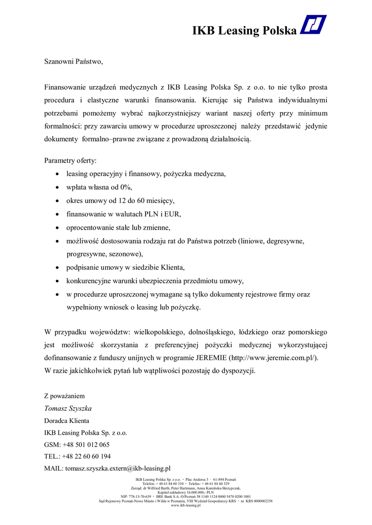 IKB Leasing Polska Szanowni Państwo, Finansowanie urządzeń medycznych z IKB Leasing Polska Sp. z o.o. to nie tylko prosta procedura i elastyczne warunki finansowania. Kierując się Państwa indywidualnymi potrzebami pomożemy wybrać najkorzystniejszy wariant naszej oferty przy minimum formalności: przy zawarciu umowy w procedurze uproszczonej należy przedstawić jedynie dokumenty formalno–prawne związane z prowadzoną działalnością. Parametry oferty: leasing operacyjny i finansowy, pożyczka medyczna, wpłata własna od 0%, okres umowy od 12 do 60 miesięcy, finansowanie w walutach PLN i EUR, oprocentowanie stałe lub zmienne, możliwość dostosowania rodzaju rat do Państwa potrzeb (liniowe, degresywne, progresywne, sezonowe), podpisanie umowy w siedzibie Klienta, konkurencyjne warunki ubezpieczenia przedmiotu umowy, w procedurze uproszczonej wymagane są tylko dokumenty rejestrowe firmy oraz wypełniony wniosek o leasing lub pożyczkę. W przypadku województw: wielkopolskiego, dolnośląskiego, łódzkiego oraz pomorskiego jest możliwość skorzystania z preferencyjnej pożyczki medycznej wykorzystującej dofinansowanie z funduszy unijnych w programie JEREMIE (http://www.jeremie.com.pl/). W razie jakichkolwiek pytań lub wątpliwości pozostaję do dyspozycji. Z poważaniem Tomasz Szyszka Doradca Klienta IKB Leasing Polska Sp. z o.o. GSM: +48 501 012 065 TEL.: +48 22 60 60 194 MAIL: [email protected] IKB Leasing Polska Sp. z o.o. Plac Andersa 3 · 61-894 Poznań Telefon: + 48 61 84 60 310 Telefax: + 48 61 84 60 329 Zarząd: dr Wilfried Barth, Peter Hartmann, Anna Kamińska-Skrzypczak, Kapitał zakładowy 16.000.000,- PLN NIP: 778-13-70-639 BRE Bank S.A. O/Poznań 58 1140 1124 0000 5470 0200 1001 Sąd Rejonowy Poznań-Nowe Miasto i Wilda w Poznaniu, VIII Wydział Gospodarczy KRS nr KRS 0000002358 www.ikb-leasing.pl
