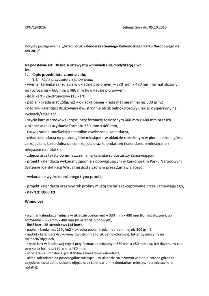KPN/19/2016 Jelenia Góra dn. 05.10.2016 Dotyczy postępowania: „Skład i druk kalendarza ściennego Karkonoskiego Parku Narodowego na rok 2017”. Na podstawie art. 38 ust. 4 ustawy Pzp wprowadza się modyfikację siwz Jest 1. Opis przedmiotu zamówienia. 3.1. Opis przedmiotu zamówienia: - wymiar kalendarza (zdjęcia w układzie poziomym) – 330 mm x 480 mm (format złożony), po rozłożeniu – 660 mm x 480 mm (w układzie pionowym), - ilość kart - 26-stronicowy (13 kart), - papier - kreda mat 250g/m2 + okładka papier kreda mat nie mniej niż 300 g/m2 - nadruk- kalendarz drukowany dwustronnie (druk pełnokolorowy), lakier dyspersyjny na rycinach/zdjęciach, - szycie kart w środkowej części przy formacie rozłożonym 660 mm x 480 mm oraz ich złożenie w celu uzyskania formatu 330 mm x 480 mm, - rozwiązanie umożliwiające stabilne zawieszenie kalendarza, - układ kalendarza na poszczególne miesiące – w układzie rozłożonym w pionie: strona górna ze zdjęciem, karta dolna opisem zdjęcia oraz kalendarium (kalendarium miesięczne z miejscem na notatki), - zdjęcia oraz teksty do umieszczenia na kalendarzu dostarczy Zamawiający, - projekt kalendarza wykonany zgodnie z obowiązującym w Karkonoskim Parku Narodowym Systemie Identyfikacji Wizualnej dostarczonym przez Zamawiającego, - wykonanie wydruku próbnego (typu proof), - projekt kalendarza oraz wydruk próbny muszą zostać zaakceptowane przez Zamawiającego, - nakład: 1000 szt. Winno być - wymiar kalendarza (zdjęcia w układzie poziomym) – 330 mm x 480 mm (format złożony), po rozłożeniu – 660 mm x 480 mm (w układzie pionowym), - ilość kart - 28-stronicowy (14 kart), - papier - kreda mat 250g/m2 + okładka papier kreda mat nie mniej niż 300 g/m2 - nadruk- kalendarz drukowany dwustronnie (druk pełnokolorowy), lakier dyspersyjny na rycinach/zdjęciach, - szycie kart w środkowej części przy formacie rozłożonym 660 mm x 480 mm oraz ich złożenie w celu uzyskania formatu 330 mm x 480 mm, - rozwiązanie umożliwiające stabilne zawieszenie kalendarza, - układ kalendarza na poszczególne miesiące – w układzie rozłożonym w pionie: strona górna ze zdjęciem, karta dolna opisem zdjęcia oraz kalendarium (kalendarium miesięczne z miejscem na notatki), - zdjęcia oraz teksty do umieszczenia na kalendarzu dostarczy Zamawiający, - projekt kalendarza wykonany zgodnie z obowiązującym w Karkonoskim Parku Narodowym Systemie Identyfikacji Wizualnej dostarczonym przez Zamawiającego, - wykonanie wydruku próbnego (typu proof), - projekt kalendarza oraz wydruk próbny muszą zostać zaakceptowane przez Zamawiającego, - nakład: 1000 szt.
