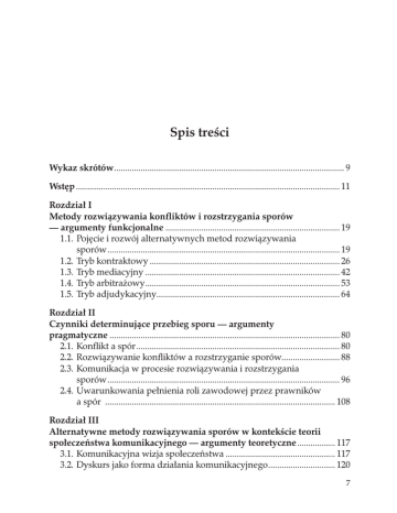 Spis treści Wykaz skrótów........................................................................................................ 9 Wstęp....................................................................................................................... 11 Rozdział I Metody rozwiązywania konfliktów i rozstrzygania sporów — argumenty funkcjonalne............................................................................... 19 1.1.Pojęcie i rozwój alternatywnych metod rozwiązywania . sporów......................................................................................................... 19 1.2.Tryb kontraktowy...................................................................................... 26 1.3.Tryb mediacyjny........................................................................................ 42 1.4.Tryb arbitrażowy........................................................................................ 53 1.5.Tryb adjudykacyjny................................................................................... 64 Rozdział II Czynniki determinujące przebieg sporu — argumenty pragmatyczne........................................................................................................ 80 2.1.Konflikt a spór............................................................................................ 80 2.2.Rozwiązywanie konfliktów a rozstrzyganie sporów.......................... 88 2.3.Komunikacja w procesie rozwiązywania i rozstrzygania . sporów......................................................................................................... 96 2.4.Uwarunkowania pełnienia roli zawodowej przez prawników . a spór ........................................................................................................ 108 Rozdział III Alternatywne metody rozwiązywania sporów w kontekście teorii społeczeństwa komunikacyjnego — argumenty teoretyczne.................. 117 3.1.Komunikacyjna wizja społeczeństwa.................................................. 117 3.2.Dyskurs jako forma działania komunikacyjnego............................... 120 Spis treści 3.3.Warunki przeprowadzenia dyskursu a procedury . trybów ADR.............................................................................................. 127 3.4.Zarzuty wobec teorii działania komunikacyjnego............................. 134 Rozdział IV Instytucje prawa polskiego o cechach ADR — argumenty dogmatyczne........................................................................................................ 139 4.1.Prawne aspekty negocjacji..................................................................... 142 4.2.Postępowanie upadłościowe i naprawcze........................................... 155 4.3.Postępowanie pojednawcze.................................................................. 158 4.4.Mediacja w sprawach cywilnych . ....................................................... 162 4.5.Rozwiązywanie sporów zbiorowych................................................... 175 4.6.Polubowne i konsensualne aspekty działania . administracyjnego................................................................................... 180 4.7.Sądownictwo polubowne...................................................................... 187 Rozdział V Miejsce alternatywnych trybów rozwiązywania sporów cywilnych w polskim systemie prawa............................................................................... 197 Bibliografia.......................................................................................................... 203