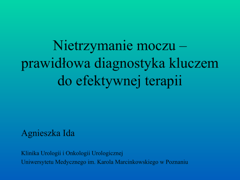 Nietrzymanie moczu – prawidłowa diagnostyka kluczem do efektywnej terapii Agnieszka Ida Klinika Urologii i Onkologii Urologicznej Uniwersytetu Medycznego im. Karola Marcinkowskiego w Poznaniu Faza gromadzenia moczu w pęcherzu: • Wzrost pojemności pęcherza • Ciśnienie w pęcherzu nie zmienia się lub nieznacznie podnosi się • Miesień wypieracz moczu pozostaje w spoczynku • Wzrasta napięcie zwieracza Faza mikcji uporządkowana sekwencja wydarzeń • rozluźnienie zwieracza cewki i mięśni dna miednicy • skurcz mięśnia wypieracza • wypływ moczu • zamknięcie zwieracza • rozluźnienie wypieracza Nietrzymanie moczu WNM Postać mieszana NTM NTM z parcia Podczas kaszlu, kichania i wysiłku fizycznego następuje: • wzrost napięcia zwieracza oraz mięśni dna miednicy • transmisja ciśnień śródbrzusznych na cewkę Stan prawidłowy Wysiłkowe nietrzymanie moczu • Wzrost ciśnienia w pęcherzu • Brak przenoszenia ciśnienia śródbrzusznego na cewkę • Mięśnie dna miednicy zbyt słabe aby powstrzymać wyciekanie moczu • Wypieracz stabilny WNM Nietrzymanie moczu z parcia = nadreaktywność wypieracza • Gdy pęcherz nie jest pełen, nagle następuje skurcz wypieracza. • Występuje uczucie silnego parcia na mocz. • Wzrastające ciśnienie w pęcherzu NTM Czy istotne jest jaki mam rodzaj NTM? TAK od prawidłowego rozpoznania zależy bowiem sposób leczenia Co robić kiedy popuszczam mocz? • • • • Niezwłocznie zgłoś się do lekarza urologa lub ginekologa, który przeprowadzi: wywiad badanie przedmiotowe badanie ogólne moczu USG układu moczowego Czy na postawie wyżej wymienionych badań można stwierdzić jaką mam postać NTM? NIE Charakterystyczne objawy dla NTM z parcia mogą występować również w WNM Co zaproponuje mi lekarz aby postawić rozpoznanie? Badanie urodynamiczne Przed przyjściem do pracowni urodynamicznej: • Prowadź dzienniczek mikcji • Wykonaj test podpaskowy • Skonsultuj BOM z lekarzem – konieczne wyleczenie infekcji dróg moczowych • Wieczorem przed badaniem wykonaj wlew doodbytniczy Po przyjściu do szpitala: • Nie oddawaj moczu • Przygotuj dokumentację medyczną (karty informacyjne z leczenia szpitalnego, wyniki badań, zażywane leki) • Wypełnij kwestionariusz Pracownia urodynamiczna Uroflowmetia - przepływ cewkowy Cewniki używane do badania Fazy badanie urodynamicznego: • Faza wypełniania • Faza mikcji Faza wypełniania: • czucie pęcherzowe • parcie na mocz • silne parcie na mocz Próby kaszlowe, próba Valsalvy Faza mikcji • ocena przepływu cewkowego • ocena pracy mięśnia wypieracza • ocena rozluźnienia zwieraczy Leczenie NTM z nadreaktywności wypieracza a) Farmakologiczne: • Grupa (A – starsza generacja leków) Ditropan, Driptane, Uroton, • Grupa (B – nowsza generacja leków) Vesicare, Emselex, b) Fizjoterapia Leczenie WNM a) Fizjoterapia b) Leczenie zabiegowe • zabiegi z użyciem taśmy czyli TOT, TVT. • operacje otwarte (przezbrzuszne): - Burcha - Marshall-Marchetti-Kranz Dziękuję za uwagę Agnieszka Ida