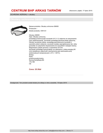 CENTRUM BHP ARKAS TARNÓW Utworzono: piątek, 17 lipiec 2015 OCHRONA WZROKU > okulary Okulary ochronne G6000 Nazwa produktu: Okulary ochronne G6000 Producent: Model produktu: OW/121 Okulary G6000 Opis: Okulary ochronne, posiadają przeźroczyste soczewki UV 2-1,2 odporne na zarysowania oraz zaparowywanie. Soczewki posiadają pierwszą klasę optyczną. Okulary są bardzo lekkie, posiadają panoramiczne soczewki z szerokim polem widzenia, soczewki zostały zaprojektowane tak, żeby pozwoliły na optymalne dopasowanie do wszystkich rodzajów twarzy. Regulowany pasek gumowy o szerokości 25 mm. Soczewki posiadają wytrzymałość na uderzenia z niską energią (45 m/s) dodatkowo odporność mechaniczna jest zachowana przy ekstremalnych temperaturach (-5°C / +55°C). Kolor: przeźroczysty/czarny Normy/Certyfikaty:EN 170,166 CE Cena: 25.50zł Dostępność: Ten produkt został dodany do sklepu w dniu czwartek, 16 lipiec 2015 http://www.sklep.arkas-bhp.com | [email protected] | | Strona 1/1