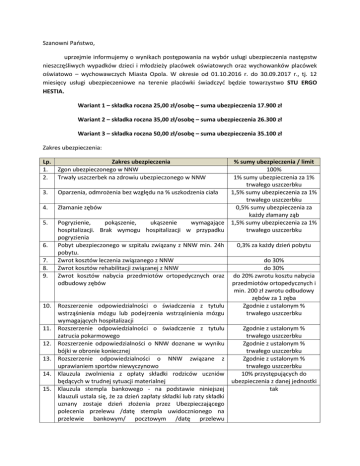 Szanowni Państwo, uprzejmie informujemy o wynikach postępowania na wybór usługi ubezpieczenia następstw nieszczęśliwych wypadków dzieci i młodzieży placówek oświatowych oraz wychowanków placówek oświatowo – wychowawczych Miasta Opola. W okresie od 01.10.2016 r. do 30.09.2017 r., tj. 12 miesięcy usługi ubezpieczeniowe na terenie placówki świadczyć będzie towarzystwo STU ERGO HESTIA. Wariant 1 – składka roczna 25,00 zł/osobę – suma ubezpieczenia 17.900 zł Wariant 2 – składka roczna 35,00 zł/osobę – suma ubezpieczenia 26.300 zł Wariant 3 – składka roczna 50,00 zł/osobę – suma ubezpieczenia 35.100 zł Zakres ubezpieczenia: Lp. 1. 2. 3. 4. 5. 6. 7. 8. 9. 10. 11. 12. 13. 14. 15. Zakres ubezpieczenia Zgon ubezpieczonego w NNW Trwały uszczerbek na zdrowiu ubezpieczonego w NNW % sumy ubezpieczenia / limit 100% 1% sumy ubezpieczenia za 1% trwałego uszczerbku Oparzenia, odmrożenia bez względu na % uszkodzenia ciała 1,5% sumy ubezpieczenia za 1% trwałego uszczerbku Złamanie zębów 0,5% sumy ubezpieczenia za każdy złamany ząb Pogryzienie, pokąszenie, ukąszenie wymagające 1,5% sumy ubezpieczenia za 1% hospitalizacji. Brak wymogu hospitalizacji w przypadku trwałego uszczerbku pogryzienia Pobyt ubezpieczonego w szpitalu związany z NNW min. 24h 0,3% za każdy dzień pobytu pobytu. Zwrot kosztów leczenia związanego z NNW do 30% Zwrot kosztów rehabilitacji związanej z NNW do 30% Zwrot kosztów nabycia przedmiotów ortopedycznych oraz do 20% zwrotu kosztu nabycia odbudowy zębów przedmiotów ortopedycznych i min. 200 zł zwrotu odbudowy zębów za 1 zęba Rozszerzenie odpowiedzialności o świadczenia z tytułu Zgodnie z ustalonym % wstrząśnienia mózgu lub podejrzenia wstrząśnienia mózgu trwałego uszczerbku wymagających hospitalizacji Rozszerzenie odpowiedzialności o świadczenie z tytułu Zgodnie z ustalonym % zatrucia pokarmowego trwałego uszczerbku Rozszerzenie odpowiedzialności o NNW doznane w wyniku Zgodnie z ustalonym % bójki w obronie koniecznej trwałego uszczerbku Rozszerzenie odpowiedzialności o NNW związane z Zgodnie z ustalonym % uprawianiem sportów niewyczynowo trwałego uszczerbku Klauzula zwolnienia z opłaty składki rodziców uczniów 10% przystępujących do będących w trudnej sytuacji materialnej ubezpieczenia z danej jednostki Klauzula stempla bankowego - na podstawie niniejszej tak klauzuli ustala się, że za dzień zapłaty składki lub raty składki uznany zostaje dzień złożenia przez Ubezpieczającego polecenia przelewu /datę stempla uwidocznionego na przelewie bankowym/ pocztowym /datę przelewu elektronicznego przy założeniu, że na koncie Ubezpieczającego jest wolna kwota pozwalająca na realizację zlecenia/przelewu na rzez zakładu ubezpieczeń najpóźniej w dniu wskazanym na polisie lub innym dokumencie ubezpieczeniowym lub płatniczym jako termin zapłaty