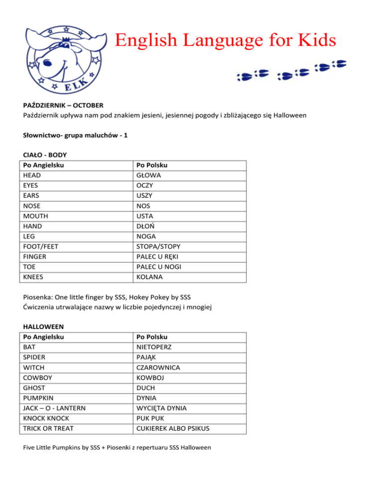 English Language for Kids PAŹDZIERNIK – OCTOBER Październik upływa nam pod znakiem jesieni, jesiennej pogody i zbliżającego się Halloween Słownictwo- grupa maluchów - 1 CIAŁO - BODY Po Angielsku HEAD EYES EARS NOSE MOUTH HAND LEG FOOT/FEET FINGER TOE KNEES Po Polsku GŁOWA OCZY USZY NOS USTA DŁOŃ NOGA STOPA/STOPY PALEC U RĘKI PALEC U NOGI KOLANA Piosenka: One little finger by SSS, Hokey Pokey by SSS Ćwiczenia utrwalające nazwy w liczbie pojedynczej i mnogiej HALLOWEEN Po Angielsku BAT SPIDER WITCH COWBOY GHOST PUMPKIN JACK – O - LANTERN KNOCK KNOCK TRICK OR TREAT Po Polsku NIETOPERZ PAJĄK CZAROWNICA KOWBOJ DUCH DYNIA WYCIĘTA DYNIA PUK PUK CUKIEREK ALBO PSIKUS Five Little Pumpkins by SSS + Piosenki z repertuaru SSS Halloween
