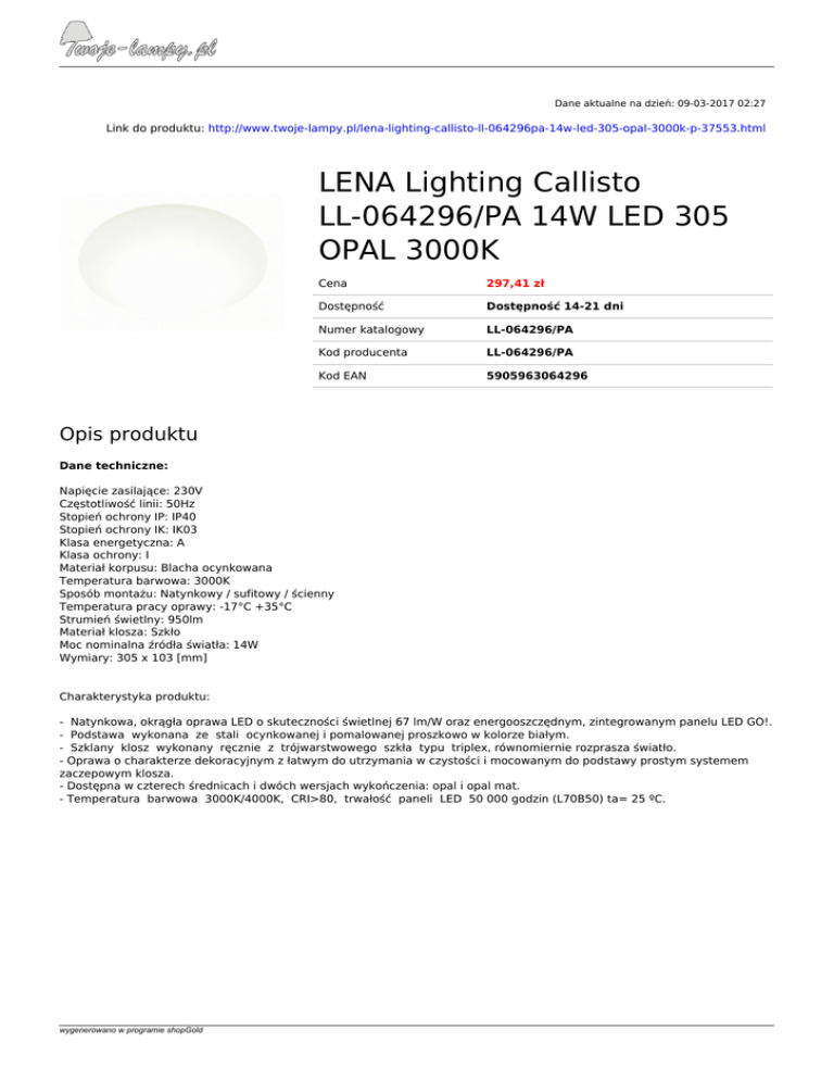 Dane aktualne na dzień: 09-03-2017 02:27 Link do produktu: http://www.twoje-lampy.pl/lena-lighting-callisto-ll-064296pa-14w-led-305-opal-3000k-p-37553.html LENA Lighting Callisto LL-064296/PA 14W LED 305 OPAL 3000K Cena 297,41 zł Dostępność Dostępność 14-21 dni Numer katalogowy LL-064296/PA Kod producenta LL-064296/PA Kod EAN 5905963064296 Opis produktu Dane techniczne: Napięcie zasilające: 230V Częstotliwość linii: 50Hz Stopień ochrony IP: IP40 Stopień ochrony IK: IK03 Klasa energetyczna: A Klasa ochrony: I Materiał korpusu: Blacha ocynkowana Temperatura barwowa: 3000K Sposób montażu: Natynkowy / sufitowy / ścienny Temperatura pracy oprawy: -17°C +35°C Strumień świetlny: 950lm Materiał klosza: Szkło Moc nominalna źródła światła: 14W Wymiary: 305 x 103 [mm] Charakterystyka produktu: - Natynkowa, okrągła oprawa LED o skuteczności świetlnej 67 lm/W oraz energooszczędnym, zintegrowanym panelu LED GO!. - Podstawa wykonana ze stali ocynkowanej i pomalowanej proszkowo w kolorze białym. - Szklany klosz wykonany ręcznie z trójwarstwowego szkła typu triplex, równomiernie rozprasza światło. - Oprawa o charakterze dekoracyjnym z łatwym do utrzymania w czystości i mocowanym do podstawy prostym systemem zaczepowym klosza. - Dostępna w czterech średnicach i dwóch wersjach wykończenia: opal i opal mat. - Temperatura barwowa 3000K/4000K, CRI>80, trwałość paneli LED 50 000 godzin (L70B50) ta= 25 ºC. wygenerowano w programie shopGold Powered by TCPDF (www.tcpdf.org)