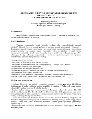 REGULAMIN II EDYCJI REGIONALNEGO KONKURSU EDUKACYJNEGO " Z RODZINNEGO ARCHIWUM" Honorowy patronat: Naczelny Dyrektor Archiwów Państwowych Dolnośląski Kurator Oświaty I. Organizator Organizatorem regionalnego konkursu edukacyjnego " Z rodzinnego archiwum" jest Archiwum Państwowe we Wrocławiu. II. Cele konkursu: Tematem przewodnim będzie historia rodzinna jako egzemplifikacja „historii wielkiej” (historii Europy, historii państwa i narodu, historii regionalnej i lokalnej) – dokumentowana, utrwalana, przyswajana i upowszechniana poprzez zbieranie i zapewnienie przechowywania, wytwarzanie (zapis wspomnień itd.), ewentualnie również formy opracowania materiałów źródłowych. Tematyka stwarza możliwości realizacji szeregu celów edukacyjnych (tj. edukacja regionalna) i społeczno-wychowawczych, np. poprzez kształtowanie tożsamości regionalnej i lokalnej. Celem konkursu jest ponadto: - zachęcenie do poznania historii własnej rodziny; - zachęcanie do poznania historii tzw. Małej Ojczyzny, Dolnego Śląska, Polski; - rozbudzenie zainteresowań genealogią; - podtrzymanie więzi międzypokoleniowej; - pobudzanie aktywności młodego pokolenia na rzecz lokalnego środowiska; - kształtowanie świadomości historycznej; - zapoznanie z rolą Archiwum Państwowego w dotarciu do materiałów źródłowych; - rozwój umiejętności plastycznych i pobudzenie wyobraźni artystycznej; III. Warunki uczestnictwa: - konkurs skierowany do dzieci i młodzieży szkolnej z terenu powiatów kłodzkiego, świdnickiego i wałbrzyskiego, gminy miejskiej Świdnica i Wałbrzych oraz gminy wiejskiej Świdnica, wybranych szkół z Czech; - konkurs będzie rozstrzygany w ramach czterech kategorii wiekowych: dzieci z klas I-III szkoły podstawowej, klas IV-VI szkoły podstawowej, klas I-III gimnazjum oraz szkół ponadgimnazjalnych (dla uczestników z Czech zostanie zastosowane kryterium wiekowe tj. według systemu polskiego szkolnictwa); - zadaniem uczestników konkursu będzie wykonanie dowolną techniką plastyczną lub multimedialną pracy ilustrującej lub dokumentującej historię rodziny; prace mogą przyjąć dowolną formę (np. pracy malarskiej, komiksu, drzewa genealogicznego, prezentacji, reportażu itp.); - maksymalny czas prezentacji multimedialnych: filmów, prezentacji muzycznych – 10 min. lub 25 slajdów; 1 - kryteria oceny prac: wykorzystanie źródeł archiwalnych (w tym z zasobu: archiwum państwowego i rodzinnego) oraz opis wykorzystanych źródeł dokumentujących historię rodziny, samodzielność wykonania prac, kreatywność i pomysłowość ujęcia tematu, estetyka wykonania prac; - prace zgłoszone na konkurs stają się własnością Organizatora - zgodnie z jego decyzją mogą zostać przekazane po zakończeniu konkursu do właściwych gmin lub powiatów; - Organizator zastrzega sobie prawo do wyłączenia z konkursu prac nie spełniających zasad uczestnictwa; - Administratorem zebranych danych osobowych jest Archiwum Państwowego we Wrocławiu Oddział w Kamieńcu Ząbkowickim; - Dyrektor szkoły odpowiada za uzyskanie zgody rodziców uczniów biorących udział w konkursie na przetwarzanie danych osobowych do celów konkursu; dyrektor szkoły zobowiązany jest do zebrania i przechowywania oświadczeń rodziców. IV. Ocena prac konkursowych i nagrody: - konkurs zostanie przeprowadzony w trzech etapach: 1) etap szkolny (wewnętrzny): 10.10.2016 - 27.01.2017; 2) etap gminno-powiatowy: 30.01. - 24.02.2017; 3) etap końcowy: 27.02. - 31.03.2017 (rozstrzygnięcie konkursu); - etap gminno-powiatowy ma wyłonić od 5 do 7 prac konkursowych w każdej z czterech kategorii wiekowych, które należy przekazać w terminie do 27.02.2017 r. do Archiwum Państwowego we Wrocławiu Oddział w Kamieńcu Ząbkowickim; - prace konkursowe powinny mieć charakter indywidualny a wykorzystane w nich materiały mieć formę przetworzoną; - komisja konkursowa ma składać się z 5 osób: jednego przedstawiciela Śląskiego Towarzystwa Genealogicznego we Wrocławiu, dwóch przedstawicieli Archiwum Państwowego we Wrocławiu, jednego przedstawiciela Kuratorium Oświaty we Wrocławiu oraz Uniwersytetu Wrocławskiego/Międzynarodowej Sieci Muzeów Domowych. - gala wręczenia nagród odbędzie się w ramach kolejnej edycji warsztatów archiwalnych w siedzibie Archiwum Państwowego we Wrocławiu Oddział w Kamieńcu Ząbkowickim (planowany termin: kwiecień 2017 roku). 2 KARTA ZGŁOSZENIOWA Dyrektor szkoły odpowiada za uzyskanie zgody rodziców uczniów biorących udział w konkursie w roku szkolnym 2016/2017 na przetwarzanie danych osobowych do celów konkursu. Dyrektor szkoły zobowiązany jest do zebrania i przechowywania oświadczeń rodziców o treści: 1. Imię i nazwisko uczestnika konkursu, klasa: ................................................................................................................................. 2. Placówka edukacyjna (adres): ................................................................................................................................. 3. Opiekun (imię i nazwisko nauczyciela, adres e-mail, telefon kontaktowy): ................................................................................................................................. 4. Tytuł pracy: …………………………………………………………………………………… 5. Oświadczenie: Oświadczam, iż zgodnie z Ustawą z dnia 29 sierpnia 1997 r. o ochronie danych osobowych (Dz. U. z 2002 r., Nr 101, poz. 926 z późniejszymi zmianami) wyrażam zgodę na przetwarzanie danych osobowych mojego dziecka. Oświadczam, że zapoznałem/am się z REGULAMINEM REGIONALNEGO KONKURSU EDUKACYJNEGO" Z RODZINNEGO ARCHIWUM" i go akceptuję. zgodę na udział mojej/-go córki/syna W REGIONALNYM KONKURSIE EDUKACYJNYM " Z RODZINNEGO ARCHIWUM" Wyrażam Wyrażam zgodę na publikację (w formie książki i na stronie internetowej) przez Organizatora pracy autorstwa mojej/-