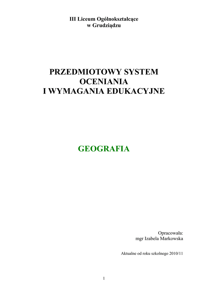 III Liceum Ogólnokształcące w Grudziądzu PRZEDMIOTOWY SYSTEM OCENIANIA I WYMAGANIA EDUKACYJNE GEOGRAFIA Opracowała: mgr Izabela Markowska Aktualne od roku szkolnego 2010/11 1 I. Cele edukacyjne 1. Zdobycie i rozszerzenie wiedzy potrzebnej do zrozumienia istoty zjawisk i procesów zachodzących w środowisku geograficznym w skali małych i dużych regionów. 2. Zdobycie umiejętności geograficznych niezbędnych do wykorzystania w praktyce opanowanej wiedzy geograficznej. 3. Przygotowanie do świadomego podejmowania decyzji, uwzględniających zachowanie ciągłości funkcji przyrody i równowagi w środowisku, jak też potrzeby człowieka /rozwój zrównoważony/. 4. Wykształcenie umiejętności interpretowania zjawisk i procesów społecznoekonomicznych i politycznych na tle uwarunkowań przyrodniczych, historycznych i kulturowych w różnych skalach przestrzennych. 5. Wyposażenie ucznia w wiedzę i umiejętności umożliwiające zdanie matury i dostanie się na studia wyższe. II. Ocenie podlega. 1. Znajomość i rozumienie treści programowych. 2. Opisywanie zjawisk, procesów i zależności zachodzących w środowisku geograficznym z użyciem terminologii stosowanej w naukach geograficznych. 3. Umiejętność czytania i interpretacji map występujących w różnych pomocach naukowych /atlasach, podręcznikach, czasopismach itp./. 4. Celowe wykorzystywanie roczników statystycznych, zestawień tabelarycznych i graficznych, rysunków, przekrojów, fotografii, które mają posłużyć do prawidłowego oceniania, wnioskowania i prognozowania zmian zachodzących w środowisku. 5. Umiejętność dokonywania obserwacji, pomiarów i obliczeń /środowisko, mapa, rocznik statystyczny/. 6. Celowe korzystanie z różnych nowych źródeł wiedzy. III. Cele oceniania. Wdrażanie do systematycznej pracy i samooceny. Określenie stopnia opanowania wiedzy teoretycznej i praktycznej. Wspieranie szkolnej kariery uczniów i ich motywowanie. Oddziaływanie na uczniów najzdolniejszych, ale także słabych oraz przeciętnych, których w szkole jest najwięcej. e. Dostarczanie rodzicom i uczniom informacji o poziomie osiągnięć edukacyjnych i postępach w tym zakresie oraz indywidualnych potrzebach. f. Dostarczenie nauczycielom informacji o poziomie osiągnięć edukacyjnych i postępach w tym zakresie. g. Ustalenie oceny śródrocznej i rocznej. a. b. c. d. 2 IV. Ogólne kryteria oceny Ocena celująca Ocenę tę otrzymuje uczeń, który: - twórczo rozwija własne uzdolnienia i zainteresowania, - pomysłowo i oryginalnie rozwiązuje nietypowe zadania, - bierze udział i osiąga sukcesy w konkursach i olimpiadach geograficznych lub olimpiadach pokrewnych, - posiada wiedzę wykraczającą poza obowiązujący program nauczania. Ocena bardzo dobra Ocenę tę otrzymuje uczeń, który opanował pełen zakres wiadomości i umiejętności przewidzianych programem nauczania oraz potrafi: - sprawnie poruszać się w tematyce geograficznej, - samodzielnie rozwiązywać problemy, - wykazać się znajomością pojęć i terminów oraz umiejętnością poprawnego ich zastosowania w sytuacjach typowych i nietypowych, - posługiwać się poprawnie terminologią geograficzną, - samodzielnie zdobywać wiedzę i umiejętności, - przeprowadzać prawidłową analizę związków przyczynowoskutkowych, zachodzących pomiędzy elementami środowiska geograficznego, - w oparciu o źródła przeprowadzić analizę procesów i określić ich konsekwencje. Ocena dobra Ocenę tę otrzymuje uczeń, który opanował wiadomości i umiejętności przewidziane podstawą programowa oraz wybrane elementy programu nauczania a także potrafi: - samodzielnie wyjaśniać typowe zależności, - posługiwać się terminologią geograficzną z nielicznymi potknięciami i błędami, - sprawnie rozwiązywać zadania geograficzne, - przeprowadzić prostą analizę związków przyczynowoskutkowych zachodzących pomiędzy elementami środowiska geograficznego, - samodzielnie dokonać analizy danych statystycznych przedstawionych w różnej formie, - w oparciu o dane liczbowe sporządzić diagramy, wykresy, kartodiagramy itp. Ocena dostateczna Ocenę tę otrzymuje uczeń, który opanował wiadomości i umiejętności przewidziane podstawą programową, co pozwala mu na: - wykazanie się znajomością i rozumieniem podstawowych pojęć i terminów geograficznych, - stosowanie poznanych pojęć i terminów w sytuacjach typowych, - wykonywanie prostych obliczeń geograficznych, 3 - - wskazywanie elementarnych związków przyczynowoskutkowych zachodzących pomiędzy elementami środowiska geograficznego, samodzielne rozwiązywanie elementarnych zadań geograficznych. Ocena dopuszczająca Uczeń opanował wiadomości i umiejętności przewidziane podstawą programową w takim zakresie, że potrafi: - samodzielnie lub z niewielka pomocą nauczyciela wykonać ćwiczenia i zadania o niewielkim stopniu trudności, - wykazać się znajomością i rozumieniem najprostszych pojęć i terminów geograficznych, - wskazać elementarne związki pomiędzy składnikami środowiska geograficznego. Ocena niedostateczna Ocenę tę otrzymuje uczeń, który nie opanował podstawowych wiadomości i umiejętności wynikających z programu nauczania oraz: - nie radzi sobie ze zrozumieniem najprostszych pojęć i terminów geograficznych, - nie potrafi nawet przy pomocy nauczyciela wykonać najprostszych ćwiczeń i zadań, - nie wykazuje najmniejszych chęci współpracy w celu uzupełnienia braków oraz nabycia podstawowej wiedzy i umiejętności. V. Formy aktywności 1. Formy aktywności - odpowiedź ustna: a/ częstotliwość w semestrze - 1-2 razy b/ zakres - trzy ostatnie tematy c/ zasada przeprowadzania - bez zapowiedzi d/ kryteria oceny – pod uwagę bierzemy: poprawność użytej terminologii, poprawność merytoryczną, e/ poprawiania otrzymanych ocen nie przewiduje się. 2. Forma aktywności - kartkówka: a/ czas trwania - 10-20 minut, b/ częstotliwość 