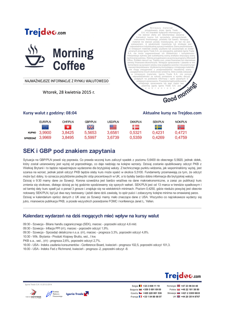 Wtorek, 28 kwietnia 2015 r. Kursy walut z godziny: 08:04 KUPNO SPRZEDAŻ Aktualne kursy na Trejdoo.com EUR/PLN CHF/PLN GBP/PLN USD/PLN DKK/PLN SEK/PLN NOK/PLN 3,9900 3,9969 3,8425 3,8495 5,5653 5,5997 3,6581 3,6739 0,5321 0,5359 0,4231 0,4269 0,4721 0,4759 SEK i GBP pod znakiem zapytania Sytuacja na GBP/PLN powoli się poprawia. Co prawda wczoraj kurs zaliczył spadek z poziomu 5,6400 do obecnego 5,5820, jednak dołek, który został ustanowiony jest wyżej od poprzedniego, co daje nadzieję na kolejne wzrosty. Dzisiaj zostanie opublikowany odczyt PKB z Wielkiej Brytanii i to będzie najważniejsze wydarzenie dla brytyjskiej waluty. Z technicznego punktu widzenia, jak wspominaliśmy wyżej, jest szansa na wzrost, jednak jeżeli odczyt PKB będzie słaby kurs może spaść w okolice 5,5100. Fundamenty przemawiają za tym, że odczyt może być dobry, to oznacza przybliżenie podwyżki stóp procentowych w UK, a to byłaby bardzo dobra informacja dla brytyjskiej waluty. Dzisiaj o 9:30 mamy dane ze Szwecji. Korona szwedzka jest bardzo wrażliwa na dane makroekonomiczne, a zaraz po publikacji kurs zmienia się skokowo, dlatego dzisiaj po tej godzinie spodziewamy się sporych wahań. SEK/PLN jest od 13 marca w trendzie spadkowym i od tamtej daty kurs spadł już o ponad 3 grosze i znajduje się na wieloletnich minimach. Poziom 0,4250, gdzie niedużo powyżej jest obecnie notowany SEK/PLN, był już dwa razy testowany i jeżeli dane dziś zawiodą, to opór puści i zobaczymy kolejne minima na omawianej parze. Dzisiaj w kalendarium oprócz danych z UK oraz ze Szwecji mamy mało znaczące dane z USA. Wszystko co najciekawsze wydarzy się jutro, mianowicie publikacja PKB, a przede wszystkich posiedzenie FOMC i konferencja Janet L. Yellen. Kalendarz wydarzeń na dziś mogących mieć wpływ na kursy walut 09:30 - Szwecja - Bilans handlu zagranicznego (SEK), marzec - poprzedni odczyt 4,6 mld. 09:30 - Szwecja - Inflacja PPI (r/r), marzec - poprzedni odczyt 1,9%. 09:30 - Szwecja - Sprzedaż detaliczna n.s.a. (r/r), marzec - prognoza 3,3%, poprzedni odczyt 4,8%. 10:30 - Wlk. Brytania - Produkt Krajowy Brutto, wst., I kw. PKB s.a., wst., (r/r) -.prognoza 2,6%, poprzedni odczyt 2,7%. 16:00 - USA - Indeks zaufania konsumentów - Conference Board, kwiecień - prognoza 102,5, poprzedni odczyt 101,3. 16:00 - USA - Indeks Fed z Richmond, kwiecień - prognoza -2, poprzedni odczyt -8.