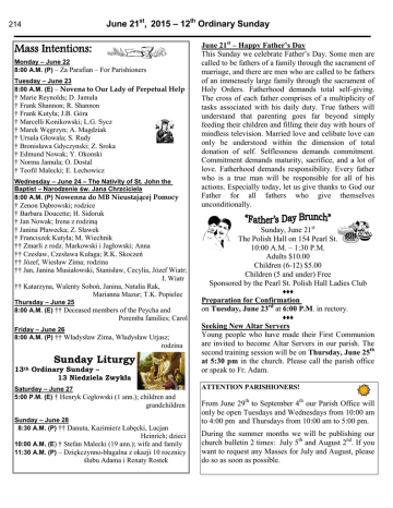 June 21st, 2015 – 12th Ordinary Sunday 214 Mass Intentions: Monday – June 22 8:00 A.M. (P) – Za Parafian – For Parishioners Tuesday – June 23 8:00 A.M. (E) – Novena to Our Lady of Perpetual Help † Marie Reynolds; D. Jamula † Frank Shannon; R. Shannon † Frank Kutyła; J.B. Góra † Marcelli Konikowski; L.G. Sycz † Marek Węgrzyn; A. Magdziak † Ursula Głowala; S. Rudy † Bronisława Gdyczynski; Z. Sroka † Edmund Nowak; Y. Okonski † Norma Jamula; O. Dostal † Teofil Malecki; E. Lechowicz Wednesday – June 24 – The Nativity of St. John the Baptist – Narodzenie św. Jana Chrzciciela 8:00 A.M. (P) Nowenna do MB Nieustającej Pomocy † Zenon Dąbrowski; rodzice † Barbara Doucette; H. Sidoruk † Jan Nowak; Irena z rodziną † Janina Pławecka; Z. Sławek † Franciszek Kutyła; M. Wiechnik †† Zmarli z rodz. Markowski i Jagłowski; Anna †† Czesław, Czesława Kułaga; R.K. Skoczeń †† Józef, Wiesław Zima; rodzina †† Jan, Janina Musiałowski, Stanisław, Cecylia, Józef Wiatr; I. Wiatr †† Katarzyna, Walenty Soboń, Janina, Natalia Rak, Marianna Mazur; T.K. Popielec Thursday – June 25 8:00 A.M. (E) †† Deceased members of the Peycha and Poremba families; Carol Friday – June 26 8:00 A.M. (P) †† Władysław Zima, Władysław Urjasz; rodzina Sunday Liturgy 13th Ordinary Sunday – 13 Niedziela Zwykła Saturday – June 27 5:00 P.M. (E) † Henryk Cegłowski (1 ann.); children and grandchildren Sunday – June 28 8:30 A.M. (P) †† Danuta, Kazimierz Łabęcki, Lucjan Heinrich; dzieci 10:00 A.M. (E) † Stefan Malecki (19 ann.); wife and family 11:30 A.M. (P) – Dziękczynno-błagalna z okazji 10 rocznicy ślubu Adama i Renaty Rostek June 21st – Happy Father’s Day This Sunday we celebrate Father’s Day. Some men are called to be fathers of a family through the sacrament of marriage, and there are men who are called to be fathers of an immensely large family through the sacrament of Holy Orders. Fatherhood demands total self-giving. The cross of each father comprises of a multiplicity of tasks associated with his daily duty. True fathers will understand that parenting goes far beyond simply feeding their children and filling their day with hours of mindless television. Married love and celibate love can only be understood within the dimension of total donation of self. Selflessness demands commitment. Commitment demands maturity, sacrifice, and a lot of love. Fatherhood demands responsibility. Every father who is a true man will be responsible for all of his actions. Especially today, let us give thanks to God our Father for all fathers who give themselves unconditionally. Sunday, June 21st The Polish Hall on 154 Pearl St. 10:00 A.M. – 1:30 P.M. Adults $10.00 Children (6-12) $5.00 Children (5 and under) Free Sponsored by the Pearl St. Polish Hall Ladies Club ♦♦♦ Preparation for Confirmation on Tuesday, June 23rd at 6:00 P.M. in rectory. ♦♦♦ Seeking New Altar Servers Young people who have made their First Communion are invited to become Altar Servers in our parish. The second training session will be on Thursday, June 25th at 5:30 pm in the church. Please call the parish office or speak to Fr. Adam. ATTENTION PARISHIONERS! From June 29th to September 4th our Parish Office will only be open Tuesdays and Wednesdays from 10:00 am to 4:00 pm and Thursdays from 10:00 am to 5:00 pm. During the summer months we will be publishing our church bulletin 2 times: July 5th and August 2nd. If you want to request any Masses for July and August, please do so as soon as possible. 21 czerwca 2015 r. – 12 Niedziela Zwykła 214 Attention Lectors, Commentators and Eucharistic Ministers. A new schedule for summer months is available in the Sacristy. If for any reason you are unable to come on a specific date, please contact someone else on the list to replace you. ♦♦♦ Festa San Rocco Saturday, August 15, 2015 St. Pius X Church at 7:00 p.m. Blessing of the Torch of San Rocco and Memorial Mass for the deceased will be celebrated by Father Tim Hingston. Sunday, August 16, 2015 St Pius X Church at 1:00 p.m. Solemn Mass will be celebrated by Msgr. Murray Kroetsch and Fr. Tim Hingston followed by traditional community procession in honour of San Rocco. The procession starts at St. Pius X Church, proceeds on Wood Street to St. Paul’s Avenue, Charing Cross, King George Road, Wood Street and back to the church for the distribution of bread. LIONS PARK 5:00 p.m. to 11:00 p.m. Soccer Game starts at 5:00 p.m. Bocce Tournament, Children’s Activities, Draw, Variety Show featuring Vinz Derosa, Spectacular Fireworks! ‘’To everything there is a season and a time to every purpose under haven…” A Time to Die… Let us remember in our prayers STELLA HOLEWA who passed away on June 3rd and JÓZEF BĄK who passed away on June 13th. MAY THEY REST IN PEACE! - Sunday, June 14, 2015 5:00pm 8:30am 10:00am 11:30am Total Offertory $ 538.00 $ 525.00 $ 494,15 $ 420.00 $ 1,977.15 Elevator $ 205.00 $ 280.00 $ 275.00 $ 95.00 $ 855.00 Thank you for your generous and faithful support! Niech Pan Bóg wynagrodzi waszą ofiarność. 21 czerwiec 2015 – Dzień Ojca Kochany Tato – Z okazji Dnia Taty, Tato ukochany, niech każdy dzień będzie udany, niech samochód się nie psuje i uśmiech na twarzy maluje, niech Ci skowronek na rękę przyleci i żebyś zawsze miał powód do dumy ze swoich dzieci! Sakrament Bierzmowania Spotkanie dla kandydatów do Bierzmowania we wtorek 23 czerwca o godz. 6:00 wieczorem na plebanii. ♦♦♦ 24 czerwca – Święto Św. Jana Chrzciciela Jan Chrzciciel jako jedyny wśród świętych Pańskich cieszy się przywilejem, iż obchodzi się jako uroczystość dzień jego narodzin. ♦♦♦ Spotkanie dla kandydatów na ministrantów (chłopców i dziewczynek) w czwartek 25 czerwca o godz 5:30 wieczorem w kościele. ♦♦♦ Uwaga lektorzy, komentatorzy,Szafarze Eucharystii Nowy plan posługi na okres wakacyjny jest do o