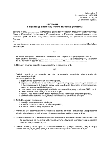 Załącznik nr 3 do zarządzenia nr 43/2014 Formularz P.164_F2 po zmianach Wydziału UMOWA NR ........ o organizację studenckiej praktyki zawodowej (klinicznej) zawarta w dniu ..................... w Poznaniu, pomiędzy Wydziałem Medycyny Weterynaryjnej i Nauk o Zwierzętach Uniwersytetu Przyrodniczego w Poznaniu, reprezentowanym przez Dziekana prof. dr hab. Małgorzatę Szumacher-Strabel, na podstawie upoważnienia Rektora a: ............................................................................................................................................... reprezentowanym przez……………………………………………….., zwanym dalej Zakładem Leczniczym. §1 1. Uczelnia kieruje do Zakładu Leczniczego w celu odbycia praktyki grupę studentów ……. roku studiów, kierunku ………………………………………., wg załączonej listy (załącznik nr 1), na okres 4 tygodni od...................................... do...................................... 2. Ramowy program praktyki został określony w załączniku nr 2. §2 1. Zakład Leczniczy zobowiązuje się do zapewnienia warunków niezbędnych do zrealizowania praktyki, a w szczególności do: 1) zapewnienia odpowiednich stanowisk pracy, 2) zapoznania studentów z zakładowym regulaminem pracy, zakładowymi przepisami o bezpieczeństwie i higienie pracy oraz o ochronie tajemnicy przedsiębiorstwa, tajemnicy państwowej i służbowej, 3) przeprowadzenia wstępnego instruktażu na stanowisku pracy z zakresu BHP i ppoż. 4) ustanowienia zakładowego opiekuna praktyki, 5) nadzoru nad wykonaniem zadań wynikających z ramowego programu praktyki, 6) potwierdzenia odbycia praktyki oraz sprawozdania studenta z praktyki. 2. Zakład Leczniczy nie ponosi: 1) kosztów zakwaterowania studenta, 2) kosztów dojazdu studenta na miejsce praktyki, 3) kosztów całodobowego wyżywienia. 3. Praktykant jest zobowiązany do posiadania odzieży roboczej i aktualnego ubezpieczenia od odpowiedzialności cywilnej oraz od następstw nieszczęśliwych wypadków. 4. Uczelnia oświadcza, iż Praktykant posiada orzeczenie lekarskie o braku przeciwwskazań do studiowania na kierunku weterynaria, w tym odbywania wymaganych programem studiów praktyk zawodowych. 5. Zakład Leczniczy może żądać od Wydziału odwołania z praktyki studenta, który w rażący sposób naruszył dyscyplinę pracy lub spowodował zagrożenie zdrowia lub życia. §3 1. Praktyka jest odpłatna według zasad określonych w Uchwale Krajowej Rady LekarskoWeterynaryjnej z dnia 10 czerwca 2014 r. w sprawie ustalenia wysokości odpłatności za szkolenie praktyczne uczniów szkół ponadgimnazjalnych i szkolenie praktyczne studentów wydziałów medycyny weterynaryjnej w zakresie wynikającym z programu studiów. 2. Wysokość odpłatności za szkolenie praktyczne studentów wydziałów medycyny weterynaryjnej w zakresie wynikającym z programu studiów ustala się na kwotę 32,00 zł od osoby za dzień praktyki, zgodnie z Uchwałą wymienioną w punkcie 1 niniejszego paragrafu. Definicja dnia praktyki jest uzależniona od zasad działalności i godzin otwarcia Zakładu Leczniczego. Niezależnie od tego, zgodnie z programem Studiów, student zobowiązany jest do obycia praktyki obejmującej 160 godzin dydaktycznych w taki sposób, aby w tygodniu nie była ona mniejsza niż 40 godzin dydaktycznych. 3. Zakład Leczniczy, w którym student odbywa praktykę wystawia i składa do dziekanatu Wydziału fakturę najpóźniej w terminie 3 dni od zakończenia przez studenta praktyki. 4. Faktura będzie płatna w terminie 14 dni od dnia jej dostarczenia do dziekanatu Wydziału. §4 1. Wydział zobowiązuje się do sprawowania nadzoru dydaktycznego nad przebiegiem praktyki zawodowej studentów. 2. Przełożonym studentów odbywających praktykę zawodową jest koordynator praktyk, powołany przez dziekana. 3. Koordynator praktyk odpowiada za ich realizację zgodnie z ramowym programem oraz jest upoważniony, wspólnie z kierownictwem Zakładu Leczniczego, do rozstrzygania spraw związanych z przebiegiem praktyki. §5 Wszelkie zmiany umowy wymagają formy pisemnej pod rygorem nieważności. §6 Niniejsza umowa została sporządzona w dwóch jednobrzmiących egzemplarzach, po jednym dla każdej ze Stron. osoba reprezentująca Zakład Leczniczy pieczęć i podpis dziekana Załącznik nr 1 do umowy nr …………. z dnia …..………………….. o organizację 4-tygodniowej studenckiej praktyki klinicznej Lista studentów skierowanych na praktykę do ………………………………………………………...... nazwa i adres instytucji L.p. Uwagi: Imię i nazwisko studenta Termin Załącznik nr 2 do umowy nr …………. z dnia …..………………….. o organizację studenckiej praktyki klinicznej Ramowy program 4-tygodniowej praktyki klinicznej na kierunku studiów Weterynaria, jednolite studia magisterskie Wydział Medycyny Weterynaryjnej i Nauk o Zwierzętach Zalecane miejsce praktyk: kliniki weterynaryjne, gabinety weterynaryjne, typowane przez Wydział oraz Wielkopolską Izbę Lekarsko - Weterynaryjną. Celem podstawowym jest: nabycie umiejętności praktycznych, uzupełniających i pogłębiających kompetencje uzyskane przez studenta w trakcie zajęć dydaktycznych szczególnie: Nauka podstaw funkcjonowania zakładów leczniczych dla zwierząt, ich organizacja. Studenci nabywają także podstawowe umiejętności w zakresie postępowania ze zwierzętami, ich pielęgnacją, podstawowymi zabiegami weterynaryjnymi, a także przeprowadzania wywiadu i prowadzenia zasad dokumentacji weterynaryjnej. Praktyka powinna obejmować: szkolenie BHP na stanowisku pracy, poznanie zakładu pracy – lokalizacja, organizacja, kierunki działania, stosowane metody i technologie, zadania mieszczące się tematycznie w szeroko pojętej dziedzinie weterynarii, opisanie wykonywanych zadań i wyciąganie wniosków (dzienniczek praktyk). Osoby odpowiedzialne za realizację 