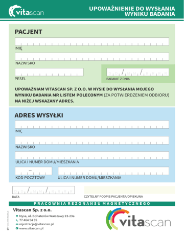 UPOWAŻNIENIE DO WYSŁANIA WYNIKU BADANIA PACJENT IMIĘ NAZWISKO D D PESEL / M M / R R R R BADANIE Z DNIA UPOWAŻNIAM VITASCAN SP. Z O.O. W NYSIE DO WYSŁANIA MOJEGO WYNIKU BADANIA MR LISTEM POLECONYM (ZA POTWIERDZENIEM ODBIORU) NA NIŻEJ WSKAZANY ADRES. ADRES WYSYŁKI IMIĘ NAZWISKO ULICA I NUMER DOMU/MIESZKANIA KOD POCZTOWY D D / M M ULICA I NUMER DOMU/MIESZKANIA / R R R R CZYTELNY PODPIS PACJENTA/OPIEKUNA DATA © www.ambientstudio.pl PRACOWNIA REZONANSU MAGNETYCZNEGO Vitascan Sp. z o.o. Nysa, ul. Bohaterów Warszawy 23-23a 77 464 54 35 [email protected] www.vitascan.pl