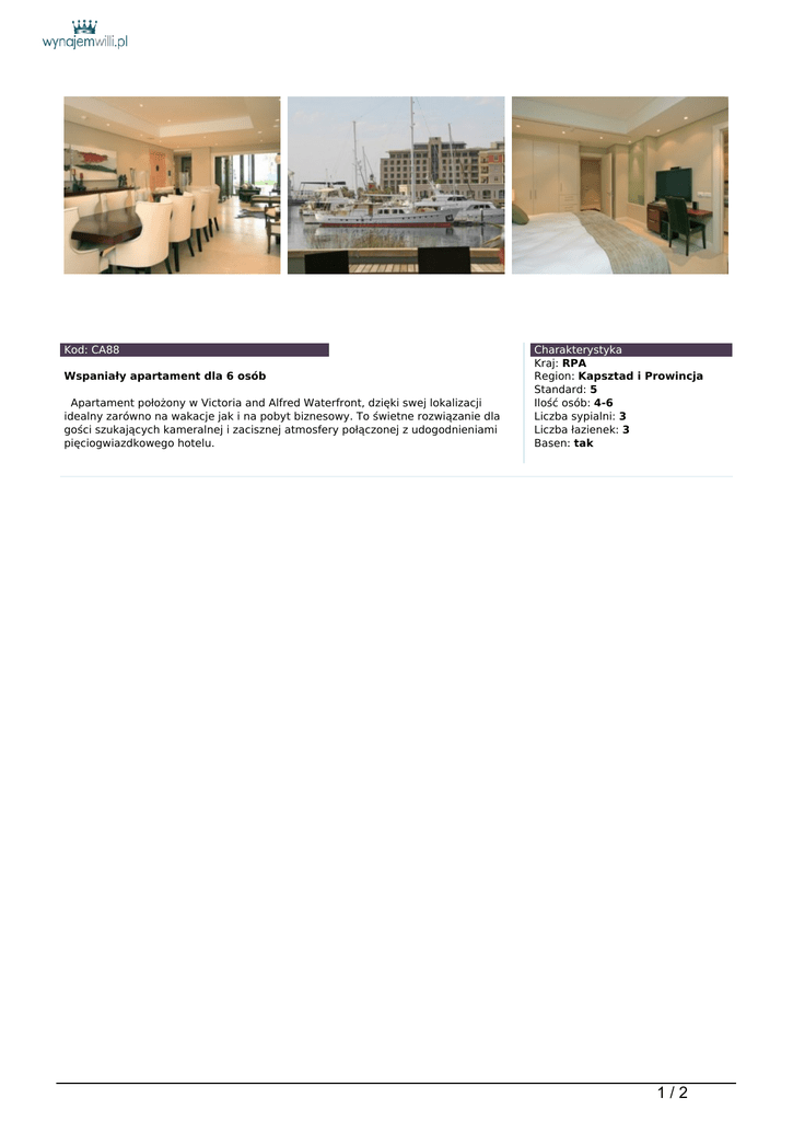 Kod: CA88 Wspaniały apartament dla 6 osób Apartament położony w Victoria and Alfred Waterfront, dzięki swej lokalizacji idealny zarówno na wakacje jak i na pobyt biznesowy. To świetne rozwiązanie dla gości szukających kameralnej i zacisznej atmosfery połączonej z udogodnieniami pięciogwiazdkowego hotelu. Charakterystyka Kraj: RPA Region: Kapsztad i Prowincja Standard: 5 Ilość osób: 4-6 Liczba sypialni: 3 Liczba łazienek: 3 Basen: tak 1/2 Zakwaterowanie: Apartament składa się z trzech komfortowych sypialni z łazienkami, przestronnej jadalni z wyjściem na patio z niewielkim basenem, wyposażonej kuchni oraz salonu. Apartament został luksusowo urządzony, rozpościerają się z niego widoki na przystań. Wyposażenie: Telewizory plazmowe, basen, system alarmowy, parking strzeżony. Lokalizacja: Marina Waterfront, Cape Town. Apartament położony jest w odległości krótkiego spaceru od sklepów, restauracji, kin, barów. Dodatkowe usługi: Apartament jest codziennie sprzątany, oferta obejmuje też podstawowe zakupy przed przyjazdem gości, usługi concierge oraz transfery z i na lotnisko. Cena za tydzień wynajmu: Na zapytanie. 2/2 Powered by TCPDF (www.tcpdf.org)