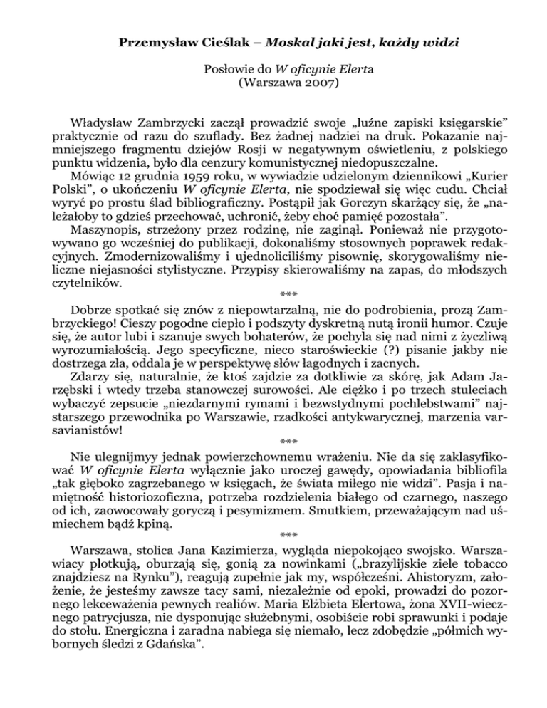 Przemysław Cieślak – Moskal jaki jest, każdy widzi Posłowie do W oficynie Elerta (Warszawa 2007) Władysław Zambrzycki zaczął prowadzić swoje „luźne zapiski księgarskie” praktycznie od razu do szuflady. Bez żadnej nadziei na druk. Pokazanie najmniejszego fragmentu dziejów Rosji w negatywnym oświetleniu, z polskiego punktu widzenia, było dla cenzury komunistycznej niedopuszczalne. Mówiąc 12 grudnia 1959 roku, w wywiadzie udzielonym dziennikowi „Kurier Polski”, o ukończeniu W oficynie Elerta, nie spodziewał się więc cudu. Chciał wyryć po prostu ślad bibliograficzny. Postąpił jak Gorczyn skarżący się, że „należałoby to gdzieś przechować, uchronić, żeby choć pamięć pozostała”. Maszynopis, strzeżony przez rodzinę, nie zaginął. Ponieważ nie przygotowywano go wcześniej do publikacji, dokonaliśmy stosownych poprawek redakcyjnych. Zmodernizowaliśmy i ujednoliciliśmy pisownię, skorygowaliśmy nieliczne niejasności stylistyczne. Przypisy skierowaliśmy na zapas, do młodszych czytelników. *** Dobrze spotkać się znów z niepowtarzalną, nie do podrobienia, prozą Zambrzyckiego! Cieszy pogodne ciepło i podszyty dyskretną nutą ironii humor. Czuje się, że autor lubi i szanuje swych bohaterów, że pochyla się nad nimi z życzliwą wyrozumiałością. Jego specyficzne, nieco staroświeckie (?) pisanie jakby nie dostrzega zła, oddala je w perspektywę słów łagodnych i zacnych. Zdarzy się, naturalnie, że ktoś zajdzie za dotkliwie za skórę, jak Adam Jarzębski i wtedy trzeba stanowczej surowości. Ale ciężko i po trzech stuleciach wybaczyć zepsucie „niezdarnymi rymami i bezwstydnymi pochlebstwami” najstarszego przewodnika po Warszawie, rzadkości antykwarycznej, marzenia varsavianistów! *** Nie ulegnijmyy jednak powierzchownemu wrażeniu. Nie da się zaklasyfikować W oficynie Elerta wyłącznie jako uroczej gawędy, opowiadania bibliofila „tak głęboko zagrzebanego w księgach, że świata miłego nie widzi”. Pasja i namiętność historiozoficzna, potrzeba rozdzielenia białego od czarnego, naszego od ich, zaowocowały goryczą i pesymizmem. Smutkiem, przeważającym nad uśmiechem bądź kpiną. *** Warszawa, stolica Jana Kazimierza, wygląda niepokojąco swojsko. Warszawiacy plotkują, oburzają się, gonią za nowinkami („brazylijskie ziele tobacco znajdziesz na Rynku”), reagują zupełnie jak my, współcześni. Ahistoryzm, założenie, że jesteśmy zawsze tacy sami, niezależnie od epoki, prowadzi do pozornego lekceważenia pewnych realiów. Maria Elżbieta Elertowa, żona XVII-wiecznego patrycjusza, nie dysponując służebnymi, osobiście robi sprawunki i podaje do stołu. Energiczna i zaradna nabiega się niemało, lecz zdobędzie „półmich wybornych śledzi z Gdańska”. Mamy do czynienia ze świadomie wykorzystywanym chwytem artystycznym. Przeszłość jest dziś, tylko cokolwiek dalej. Zambrzycki, mistrz literatury przyjaznej odbiorcom, uwodzi anegdotami i nazwiskami znanymi powszechnie, choćby ze szkoły. Pozwala zbliżyć się do Wespazjana Kochowskiego, Andrzeja Morsztyna albo Jerzego Ossolińskiego bez poczucia obcości wynikającej z dystansu czasowego. Oglądamy rozległą panoramę, odcyfrowujemy detale – i wciąga nas niepostzeżenie uroda następnych i następnych. Pisarz skupia się na codzienności, powszedniej zwyczajności. Erudyta i miłośnik zakurzonych szpargałów, sypie szczodrze sytuacjami i historyjkami nieobecnymi w annałach wielkiej historii. Każdy wyszuka coś dla siebie. Jednego zaintryguje kunszt oratorski francuskiego komedianta Poquelina (pan Morsztyn nigdy o nim nie słyszał!), drugiego zainteresuje „denominacja ważniejszych ptasich głosów”. Kogoś rozbawią włóczęgowskie przygody małego Jasia (dorosły pan Jan Chryzostom nigdy się o nich nie zająknął!), ktoś zaduma się nad przyczynami moskiewskiej manii tłuczenia luster po pijanemu, ktoś wtłoczy się w ciżbę na Starym Mieście i będzie „zapamiętale dyskurował” o tajemnicach rosyjskiej duszy, z Azji rodem. *** Niechętne, wrogie Rosjanom stereotypy? Tak. Nie wzięły się one znikąd, powstały kiedyś i okrzepły z jakiegoś powodu, ukształtowane przez doświadczenia wspólne wielu generacjom Polaków. Obserwujemy, na gorąco, ich narodziny. Adamandy Kochański, napomykając na Kałęczynie o prymitywnej konstrukcji taborowych wozów gości ze Wschodu „skrzypienie czyniących wielkie na podobieństwo kwiku przerażonej maciory z warchlakam”, powtarza za Kroniką Sarmacyi Europskiej Gwagnina z 1611 roku (w edycji K.J. Turowskiego): Kolasy mają proste bez żadnego żelaza, wiciami i rozmaitemi powrozy pokręcone, koło jedno z jednego drzewa foremną robotą pobocznemi śpicami zwarte, by na dalszą drogę wytrwa, oś nigdy mazi nie zna. A kiedy się ich wiele na one kolasy nasiędzie, to dziwnie wrzeszczą, że pod nimi osi skrzypieniem jakiemsi, foremne narzekania z siebie wydają [...] i stąd ona przypowieść urosła: skrzypi by ruska kolasa. Można określić Zambrzyckiego mianem etymologa spraw oczywistych. Uwielbiał ubarwiać przeszłość, z wdziękiem dopowiadać Jej korzenie, początki – bywa – piękniejsze niż przyziemna prawda. Anonimowy powidok krasnoarmiejców obwieszonych trofiejnymi zegarkami zaciera się powoli w oczach kolejnych pokoleń. Po lekturze W oficynie Elerta wiemy przynajmniej dokładnie, który Moskal pierwszy zakrzyknął: „Dawaj czasy!” Docenimy też, obrosłą tysiąckrotnym później naśladownictwem, decyzję Wańki Tarapajewa, aby „zdjąć kubraczek, złożyć w kilkoro, zarzucić na kolce palisady i hyc na tamtą stronę”. *** Powieść zarysowana jako obraz obyczajowy, przechodzi stopniowo w dramat polityczny z ostatnich lat świetności Rzeczypospolitej. Tekst, szczególnie w drugiej części, coraz intensywniej nasyca się rozmowami. Troiście prowadzona narracja (Piotr Elert wygłasza okazjonalną kwestię) nabiera akce