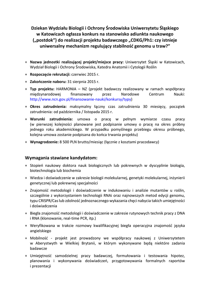Dziekan Wydziału Biologii i Ochrony Środowiska Uniwersytetu Śląskiego w Katowicach ogłasza konkurs na stanowisko adiunkta naukowego („postdok”) do realizacji projektu badawczego „CDKG/Ph1: czy istnieje uniwersalny mechanizm regulujący stabilność genomu u traw?” + Nazwa jednostki realizującej projekt/miejsce pracy: Uniwersytet Śląski w Katowicach, Wydział Biologii i Ochrony Środowiska, Katedra Anatomii i Cytologii Roślin + Rozpoczęcie rekrutacji: czerwiec 2015 r. + Zakończenie naboru: 31 sierpnia 2015 r. + Typ projektu: HARMONIA – NZ (projekt badawczy realizowany w ramach współpracy międzynarodowej finansowany przez Narodowe Centrum Nauki: http://www.ncn.gov.pl/finansowanie-nauki/konkursy/typy) + Okres zatrudnienia: maksymalny łączny czas zatrudnienia 30 miesięcy, początek zatrudnienia: od października / listopada 2015 r. + Warunki zatrudnienia: umowa o pracę w pełnym wymiarze czasu pracy (w pierwszej kolejności planowane jest podpisanie umowy o pracę na okres próbny jednego roku akademickiego. W przypadku pomyślnego przebiegu okresu próbnego, kolejna umowa zostanie podpisana do końca trwania projektu) + Wynagrodzenie: 8 500 PLN brutto/miesiąc (łącznie z kosztami pracodawcy) Wymagania stawiane kandydatom: + Stopień naukowy doktora nauk biologicznych lub pokrewnych w dyscyplinie biologia, biotechnologia lub biochemia + Wiedza i doświadczenie w zakresie biologii molekularnej, genetyki molekularnej, inżynierii genetycznej lub pokrewnej specjalności + Znajomość metodologii i doświadczenie w indukowaniu i analizie mutantów u roślin, szczególnie z wykorzystaniem technologii RNAi oraz najnowszych metod edycji genomu, typu CRISPR/Cas lub zdolność jednoznacznego wykazania chęci nabycia takich umiejętności i doświadczenia + Biegła znajomość metodologii i doświadczenie w zakresie rutynowych technik pracy z DNA i RNA (klonowanie, real-time PCR, itp.) + Weryfikowana w trakcie rozmowy kwalifikacyjnej biegła operacyjna znajomość języka angielskiego + Mobilność - projekt jest prowadzony we współpracy naukowej z Uniwersytetem w Aberystwyth w Wielkiej Brytanii, w którym wykonywane będą niektóre zadania badawcze + Umiejętność samodzielnej pracy badawczej, formułowania i testowania hipotez, planowania i wykonywania doświadczeń, przygotowywania formalnych raportów i prezentacji + Motywacja do prowadzenia interesujących, ale wymagających prac badawczych, gotowość do rozwoju naukowego + Pożądany dorobek naukowy, udokumentowany publikacjami w czasopismach o zasięgu międzynarodowym, wygłoszonymi osobiście referatami na konferencjach naukowych, stypendiami i wizytami naukowymi w ośrodkach zagranicznych i krajowych + Możliwość złożenia oświadczenia o spełnianiu wymagań wynikających z art. 109 ust. 1 ustawy z dnia 27 lipca 2005 r. Prawo o szkolnictwie wyższym (Dz. U. Nr 164, poz. 1365 ze zm. (wzór oświadczenia znajduje się na końcu ogłoszenia) + Nienaganna postawa etyczna Opis projektu: Stabilność genomu jądrowego jest kluczowa dla istnienia eukariontów. U roślin, będących często organizmami allopoliploidalnymi, jest to szczególnie istotne w wymiarze poprawnego parowania i rekombinacji chromosomów homologicznych (homologów) oraz supresji prowadzącego do zaburzeń mejozy, a w konsekwencji obniżenia płodności, parowania chromosomów homeologicznych (homeologów). W przypadku pszenicy zwyczajnej ograniczenie rekombinacji wyłącznie do homologów uwarunkowane jest obecnością pojedynczego, dominującego locus Ph1, zawierającego kilka kopii genów kodujących kinazy cyklinozależne (CDK), strukturalnie i funkcjonalnie zbliżone do zakonserwowanej ewolucyjnie klasy CDKG/CDK11. Wyniki niedawnych badań wykazały, że kinazy CDKG/CDK11 są zaangażowane w proces parowania chromosomów u Arabidopsis thaliana. Wydaje się zatem prawdopodobne, że w przypadku traw strukturalnie podobne do CDKG kinazy Ph1 mogą mieć wpływ na analogiczne procesy związane z parowaniem, przyczyniając się tym samym do zwiększenia stabilności genomu. Celem projektu „CDKG/Ph1: czy istnieje uniwersalny mechanizm regulujący stabilność genomu u traw?” jest zweryfikowanie hipotezy, czy w przypadku traw wyewoluował mechanizm stabilności genomu oparty na aktywności CDK. Allotetraploidalny obiekt analiz, Brachypodium hybridum (2n=30), posiada liczne odpowiednie dla proponowanych badań cechy modelowe, takie jak niewielki (ok. 600 Mpz) i w najbliższym czasie zsekwencjonowany genom jądrowy oraz dobrze poznane tło filogenetyczne. Wymienione cechy, w połączeniu z szybko i stale się powiększającą się bazą zasobów i narzędzi badawczych, stwarzają w przypadku tego gatunku niezwykle atrakcyjną platformę eksperymentalną, umożliwiającą nie tylko złożone analizy z zakresu cytogenetyki molekularnej, ale także w różnych innych obszarach biologii. B. hybridum charakteryzuje się pełną płodnością, a obecność 15 biwalentów w trakcie metafazy I i regularny przebieg mejozy sugerują wyłącznie parowanie chromosomów homologicznych. W wymiarze badań podstawowych, proponowany projekt jest ważny dla lepszego poznania procesów odpowiedzialnych za stabilność genetyczną allopoliploidów. Odkrycie u innych allopoliploidalnych traw zarówno mechanizmów podobnych, jak i odmiennych od występującego u pszenicy będzie miało istotne znaczenie dla bardziej dogłębnego zrozumienia funkcjonalnych ograniczeń ewolucji mechanizmów stabilizujących roślinny genom jądrowy. W dalszej perspektywie może to mieć także pewne przełożenie praktyczne w sensie możliwości opracowywania lepszych strategii i narzędzi sztucznego otrzymywania nowych mieszańców oraz ulepszania gatunków już istniejących (np. pszenica, owies) poprzez introgresję pożądanych cech z dzikich gatunków pokrewnych. Projekt ten pozwoli także na opracowanie technologii i umiejętności umożliwiających w przyszłości komplekso