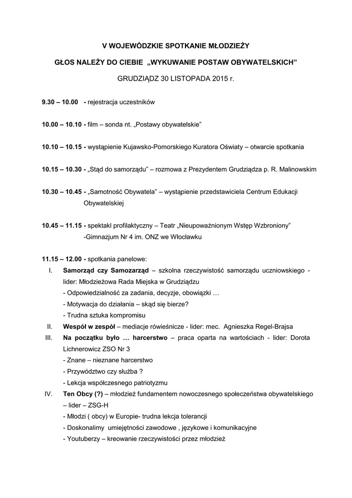 V WOJEWÓDZKIE SPOTKANIE MŁODZIEŻY GŁOS NALEŻY DO CIEBIE „WYKUWANIE POSTAW OBYWATELSKICH” GRUDZIĄDZ 30 LISTOPADA 2015 r. 9.30 – 10.00 - rejestracja uczestników 10.00 – 10.10 - film – sonda nt. „Postawy obywatelskie” 10.10 – 10.15 - wystąpienie Kujawsko-Pomorskiego Kuratora Oświaty – otwarcie spotkania 10.15 – 10.30 - „Stąd do samorządu” – rozmowa z Prezydentem Grudziądza p. R. Malinowskim 10.30 – 10.45 - „Samotność Obywatela” – wystąpienie przedstawiciela Centrum Edukacji Obywatelskiej 10.45 – 11.15 - spektakl profilaktyczny – Teatr „Nieupoważnionym Wstęp Wzbroniony” -Gimnazjum Nr 4 im. ONZ we Włocławku 11.15 – 12.00 - spotkania panelowe: I. Samorząd czy Samozarząd – szkolna rzeczywistość samorządu uczniowskiego lider: Młodzieżowa Rada Miejska w Grudziądzu - Odpowiedzialność za zadania, decyzje, obowiązki … - Motywacja do działania – skąd się bierze? - Trudna sztuka kompromisu II. Wespół w zespół – mediacje rówieśnicze - lider: mec. Agnieszka Regel-Brajsa III. Na początku było … harcerstwo – praca oparta na wartościach - lider: Dorota Lichnerowicz ZSO Nr 3 - Znane – nieznane harcerstwo - Przywództwo czy służba ? - Lekcja współczesnego patriotyzmu IV. Ten Obcy (?) – młodzież fundamentem nowoczesnego społeczeństwa obywatelskiego – lider – ZSG-H - Młodzi ( obcy) w Europie- trudna lekcja tolerancji - Doskonalimy umiejętności zawodowe , językowe i komunikacyjne - Youtuberzy – kreowanie rzeczywistości przez młodzież 12.00 – 12.30 - rekomendacje panelowe 12.30 – 13.30 – wykład nt. „Odpowiedzialność obywatelska miarą dojrzałości młodego człowieka” – sędzia Anna Maria Wesołowska 13.30 – 13.40 – zakończenie spotkania