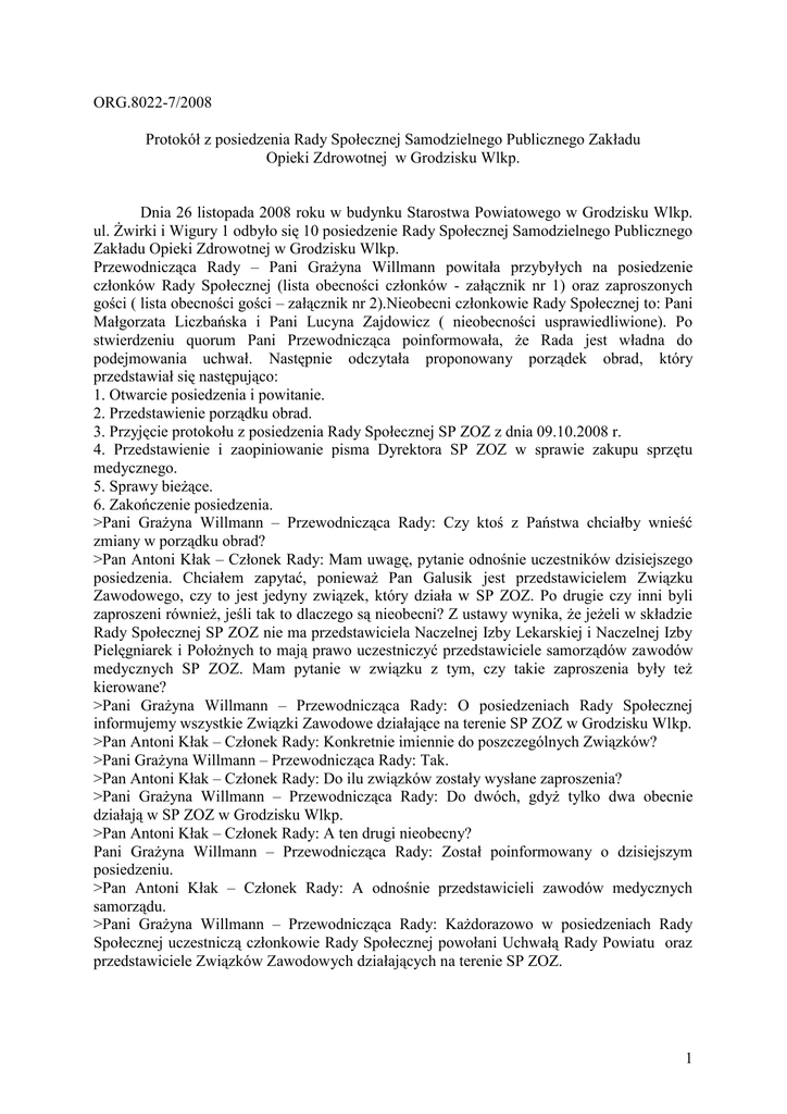 ORG.8022-7/2008 Protokół z posiedzenia Rady Społecznej Samodzielnego Publicznego Zakładu Opieki Zdrowotnej w Grodzisku Wlkp. Dnia 26 listopada 2008 roku w budynku Starostwa Powiatowego w Grodzisku Wlkp. ul. Żwirki i Wigury 1 odbyło się 10 posiedzenie Rady Społecznej Samodzielnego Publicznego Zakładu Opieki Zdrowotnej w Grodzisku Wlkp. Przewodnicząca Rady – Pani Grażyna Willmann powitała przybyłych na posiedzenie członków Rady Społecznej (lista obecności członków - załącznik nr 1) oraz zaproszonych gości ( lista obecności gości – załącznik nr 2).Nieobecni członkowie Rady Społecznej to: Pani Małgorzata Liczbańska i Pani Lucyna Zajdowicz ( nieobecności usprawiedliwione). Po stwierdzeniu quorum Pani Przewodnicząca poinformowała, że Rada jest władna do podejmowania uchwał. Następnie odczytała proponowany porządek obrad, który przedstawiał się następująco: 1. Otwarcie posiedzenia i powitanie. 2. Przedstawienie porządku obrad. 3. Przyjęcie protokołu z posiedzenia Rady Społecznej SP ZOZ z dnia 09.10.2008 r. 4. Przedstawienie i zaopiniowanie pisma Dyrektora SP ZOZ w sprawie zakupu sprzętu medycznego. 5. Sprawy bieżące. 6. Zakończenie posiedzenia. >Pani Grażyna Willmann – Przewodnicząca Rady: Czy ktoś z Państwa chciałby wnieść zmiany w porządku obrad? >Pan Antoni Kłak – Członek Rady: Mam uwagę, pytanie odnośnie uczestników dzisiejszego posiedzenia. Chciałem zapytać, ponieważ Pan Galusik jest przedstawicielem Związku Zawodowego, czy to jest jedyny związek, który działa w SP ZOZ. Po drugie czy inni byli zaproszeni również, jeśli tak to dlaczego są nieobecni? Z ustawy wynika, że jeżeli w składzie Rady Społecznej SP ZOZ nie ma przedstawiciela Naczelnej Izby Lekarskiej i Naczelnej Izby Pielęgniarek i Położnych to mają prawo uczestniczyć przedstawiciele samorządów zawodów medycznych SP ZOZ. Mam pytanie w związku z tym, czy takie zaproszenia były też kierowane? >Pani Grażyna Willmann – Przewodnicząca Rady: O posiedzeniach Rady Społecznej informujemy wszystkie Związki Zawodowe działające na terenie SP ZOZ w Grodzisku Wlkp. >Pan Antoni Kłak – Członek Rady: Konkretnie imiennie do poszczególnych Związków? >Pani Grażyna Willmann – Przewodnicząca Rady: Tak. >Pan Antoni Kłak – Członek Rady: Do ilu związków zostały wysłane zaproszenia? >Pani Grażyna Willmann – Przewodnicząca Rady: Do dwóch, gdyż tylko dwa obecnie działają w SP ZOZ w Grodzisku Wlkp. >Pan Antoni Kłak – Członek Rady: A ten drugi nieobecny? Pani Grażyna Willmann – Przewodnicząca Rady: Został poinformowany o dzisiejszym posiedzeniu. >Pan Antoni Kłak – Członek Rady: A odnośnie przedstawicieli zawodów medycznych samorządu. >Pani Grażyna Willmann – Przewodnicząca Rady: Każdorazowo w posiedzeniach Rady Społecznej uczestniczą członkowie Rady Społecznej powołani Uchwałą Rady Powiatu oraz przedstawiciele Związków Zawodowych działających na terenie SP ZOZ. 1 >Pan Antoni Kłak – Członek Rady: Jeszcze raz chciałem powiedzieć, że z ustawy wynika, że przedstawiciele samorządów zawodów medycznych mają prawo uczestniczyć w Radzie Społecznej. >Pan J.J. Sieradzan – Członek Rady: Jeżeli są poinformowani, że jest posiedzenie Rady Społecznej to przychodzą tak jak dziennikarze. Posiedzenia Rady Społecznej są otwarte nie tylko dla członków Izby Lekarskiej, ale dla każdego innego też. >Pani Grażyna Willmann – Przewodnicząca Rady: To po pierwsze, a po drugie uważam, że przedstawicielami poszczególnych grup medycznych były związki, które skupiały poszczególne grupy pracowników SP ZOZ. Skoro te związki przestały funkcjonować, to jest to równoznaczne z tym, że nie chcą mieć swoich przedstawicieli w Radzie Społecznej. >Pan Antoni Kłak – Członek Rady: Żeby nie było nieporozumień, chciałem powiedzieć, że to są zupełnie inne tytuły uczestnictwa. Rozumiem z wypowiedzi wcześniejszej Pani Przewodniczącej, że przedstawiciele samorządów zawodów medycznych nie byli zaproszeni. >Pani Grażyna Willmann – Przewodnicząca Rady: Zaproszenia kierowane są do przedstawicieli Związków Zawodowych skupiających poszczególne grupy pracownicze SP ZOZ. >Pan Antoni Kłak – Członek Rady: Proszę w takim razie o wyjaśnienie dlaczego takie zaproszenia nie były skierowane do samorządów związków medycznych. Zgadzam się , że kwestia udziału to jest już własny wybór. >Pani Grażyna Willmann – Przewodnicząca Rady: Do kogo personalnie miałam kierować zaproszenia, skoro tych Związków już nie ma. >Pan J.J. Sieradzan – Członek Rady: Skąd Starostwo ma wiedzieć jakie grupy istnieją. Jeżeli kogoś trzeba zawiadomić o posiedzeniu, to powinien powiedzieć, że na tym terenie jest, działa, ma takie prawa i wobec tego chciałby uczestniczyć. >Pan Z. Niestarta – Dyrektor SP ZOZ: Jeżeli mogę wyjaśnić, samorządy zawodów medycznych tworzą Izba Lekarska i Izba Pielęgniarek i Położnych, których struktury mieszczą się w Poznaniu. >Pan Antoni Kłak – Członek Rady: Chciałem tylko zacytować art. 45 ust. 1 pkt 4 ustawy o zakładach opieki zdrowotnej. Cytat: „ W posiedzeniach Rady Społecznej, w której skład nie wchodzi przedstawiciel Naczelnej Rady Lekarskiej lub Naczelnej Rady Pielęgniarek i Położnych mają prawo uczestniczyć z głosem doradczym przedstawiciele samorządów zawodów medycznych. Ja nie wiem czy one działają, czy też nie. Stan uczestników na dzisiejszym posiedzeniu wydaje mi się nieco okrojony. >Pani Grażyna Willmann – Przewodnicząca Rady: Panie Radny nie pierwsze to posiedzenie Rady Społecznej, w który uczestniczą przedstawiciele Związków Zawodowych działających w SP ZOZ. Doskonale Pan pamięta, że zazwyczaj było 3, 4 przedstawicieli tych Związków. Ponieważ Związki przestały funkcjonować do kogo personalnie miałam kierować zaproszenia, skoro takowych przedstawicieli już nie ma. Kieruję zapro