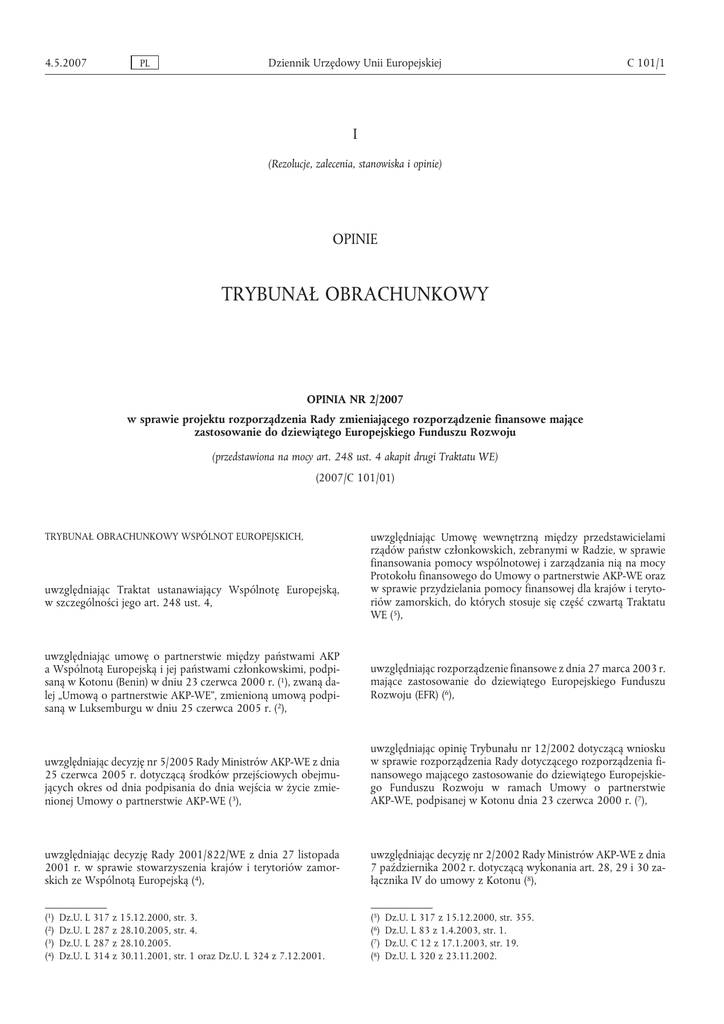 4.5.2007 PL Dziennik Urzędowy Unii Europejskiej C 101/1 I (Rezolucje, zalecenia, stanowiska i opinie) OPINIE TRYBUNAŁ OBRACHUNKOWY OPINIA NR 2/2007 w sprawie projektu rozporządzenia Rady zmieniającego rozporządzenie finansowe mające zastosowanie do dziewiątego Europejskiego Funduszu Rozwoju (przedstawiona na mocy art. 248 ust. 4 akapit drugi Traktatu WE) (2007/C 101/01) TRYBUNAŁ OBRACHUNKOWY WSPÓLNOT EUROPEJSKICH, uwzględniając Traktat ustanawiający Wspólnotę Europejską, w szczególności jego art. 248 ust. 4, uwzględniając umowę o partnerstwie między państwami AKP a Wspólnotą Europejską i jej państwami członkowskimi, podpisaną w Kotonu (Benin) w dniu 23 czerwca 2000 r. (1), zwaną dalej „Umową o partnerstwie AKP-WE”, zmienioną umową podpisaną w Luksemburgu w dniu 25 czerwca 2005 r. (2), uwzględniając Umowę wewnętrzną między przedstawicielami rządów państw członkowskich, zebranymi w Radzie, w sprawie finansowania pomocy wspólnotowej i zarządzania nią na mocy Protokołu finansowego do Umowy o partnerstwie AKP-WE oraz w sprawie przydzielania pomocy finansowej dla krajów i terytoriów zamorskich, do których stosuje się część czwartą Traktatu WE (5), uwzględniając rozporządzenie finansowe z dnia 27 marca 2003 r. mające zastosowanie do dziewiątego Europejskiego Funduszu Rozwoju (EFR) (6), uwzględniając decyzję nr 5/2005 Rady Ministrów AKP-WE z dnia 25 czerwca 2005 r. dotyczącą środków przejściowych obejmujących okres od dnia podpisania do dnia wejścia w życie zmienionej Umowy o partnerstwie AKP-WE (3), uwzględniając opinię Trybunału nr 12/2002 dotyczącą wniosku w sprawie rozporządzenia Rady dotyczącego rozporządzenia finansowego mającego zastosowanie do dziewiątego Europejskiego Funduszu Rozwoju w ramach Umowy o partnerstwie AKP-WE, podpisanej w Kotonu dnia 23 czerwca 2000 r. (7), uwzględniając decyzję Rady 2001/822/WE z dnia 27 listopada 2001 r. w sprawie stowarzyszenia krajów i terytoriów zamorskich ze Wspólnotą Europejską (4), uwzględniając decyzję nr 2/2002 Rady Ministrów AKP-WE z dnia 7 października 2002 r. dotyczącą wykonania art. 28, 29 i 30 załącznika IV do umowy z Kotonu (8), (1 ) (2) (3) (4) (5 ) (6) (7) (8) Dz.U. L 317 z 15.12.2000, str. 3. Dz.U. L 287 z 28.10.2005, str. 4. Dz.U. L 287 z 28.10.2005. Dz.U. L 314 z 30.11.2001, str. 1 oraz Dz.U. L 324 z 7.12.2001. Dz.U. L 317 z 15.12.2000, str. 355. Dz.U. L 83 z 1.4.2003, str. 1. Dz.U. C 12 z 17.1.2003, str. 19. Dz.U. L 320 z 23.11.2002. C 101/2 PL Dziennik Urzędowy Unii Europejskiej uwzględniając rozporządzenie Rady (WE, Euratom) nr 1605/2002 z dnia 25 czerwca 2002 r. w sprawie rozporządzenia finansowego mającego zastosowanie do budżetu ogólnego Wspólnot Europejskich (1), zwane dalej „ogólnym rozporządzeniem finansowym”, zmienione rozporządzeniem Rady (WE, Euratom) nr 1995/2006 z dnia 13 grudnia 2006 r. (2), uwzględniając opinię Trybunału nr 4/2006 dotyczącą projektu rozporządzenia Rady zmieniającego rozporządzenie (WE, Euratom) nr 1605/2002 z dnia 25 czerwca 2002 r. w sprawie rozporządzenia finansowego mającego zastosowanie do budżetu ogólnego Wspólnot Europejskich (3), uwzględniając wniosek Komisji w sprawie rozporządzenia Rady zmieniającego rozporządzenie finansowe mające zastosowanie do dziewiątego EFR z dnia 27 listopada 2006 r. (4), 4.5.2007 3. We wniosku zabrakło uzasadnienia, dlaczego proponowane zmiany „uznaje się za pilne oraz niezbędne do usprawnienia realizacji dziewiątego EFR”. Zwłaszcza w preambule wniosku nie odniesiono się do powodów, dla których na tym etapie realizacji dziewiątego EFR możliwość powierzenia krajowym organom sektora publicznego w państwach członkowskich działań związanych z realizacją uważana jest za niezbędną. 4. Jak wskazano w drugim motywie wniosku, „podstawę rozporządzenia finansowego mającego zastosowanie do dziewiątego EFR stanowi ogólne rozporządzenie finansowe”. Dlatego też nie jest jasne, dlaczego wniosek nie zawiera postulatu transpozycji właściwych zmian, które zostały ostatnio wprowadzone w ogólnym rozporządzeniu finansowym na mocy rozporządzenia (WE, Euratom) nr 1995/2006 w celu zwiększenia ochrony interesów finansowych Wspólnoty i umocnienia zasady rozliczalności. Zmiany te dotyczą artykułów: uwzględniając skierowany do Trybunału w dniu 15 stycznia 2007 r. wniosek Rady o wydanie opinii na temat tego wniosku, PRZYJMUJE NASTĘPUJĄCĄ OPINIĘ: 1. Jak wskazuje uzasadnienie, wniosek w sprawie rozporządzenia zmieniającego rozporządzenie finansowe mające zastosowanie do dziewiątego EFR ma na celu transpozycję ograniczonej liczby zmian wprowadzonych w ostatnio zmienionym ogólnym rozporządzeniu finansowym. 2. a) Proponowane zmiany mają głównie na celu: w przypadku zarządzania zdecentralizowanego — umożliwienie powierzania zadań związanych z realizacją krajowym organom sektora publicznego w państwach członkowskich: — w przypadkach zarządzania zdecentralizowanego pozwalają one na realizację pośrednią (proponowana zmiana do art. 14), — w przypadkach zarządzania zdecentralizowanego pozwalają one na powierzanie zadań organom w państwach członkowskich (proponowana zmiana do art. 13), — w przypadkach zarządzania zdecentralizowanego nakładają one na właściwego urzędnika zatwierdzającego Komisji obowiązek zatwierdzania umów i prognoz kosztów (proponowana zmiana do art. 54 ust. 3, art. 80 ust. 4 i art. 80 ust. 5); b) (1 ) (2) (3) (4) wprowadzenie planowanych zmian do załącznika IV do zmienionej umowy z Kotonu poprzez skreślenie odniesień do poszczególnych artykułów załącznika IV (zmiany do art. 74, 76–78). Dz.U. L 248 z 16.9.2002. Dz.U. L 390 z 30.12.2006. Dz.U. C 273 z 9.11.2006, str. 2. COM(2006) 721 wersja ostateczna. — artykułu 28a odnoszącego się do konieczności zapewnienia efektywnej i skutecznej kontroli wewnętrznej dostosowanej do danej metody zarz