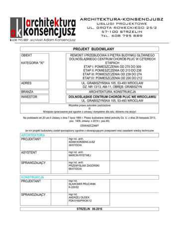 PROJEKT BUDOWLANY OBIEKT KATEGORIA "XI" REMONT I PRZEBUDOWA II PIĘTRA BUDYNKU GŁÓWNEGO DOLNOŚLĄSKIEGO CENTRUM CHORÓB PŁUC W CZTERECH ETAPACH ETAP I: POMIESZCZENIA OD 275 DO 309 ETAP II: POMIESZCZENIA OD 213 DO 238 ETAP III: POMIESZCZENIA OD 239 DO 274 ETAP IV: POMIESZCZENIA OD 200 DO 212 ADRES UL. GRABISZYŃSKA 105, 53-493 WROCŁAW DZ. NR 13/13, AM-11, OBRĘB: GRABISZYN BRANŻA ARCHITEKTURA, KONSTRUKCJA INWESTOR DOLNOŚLĄSKIE CENTRUM CHORÓB PŁUC WE WROCŁAWIU UL. GRABISZYŃSKA 105, 53-493 WROCŁAW Wszelkie prawa autorskie zastrzeżone © Niniejsze opracowanie jest zgodne z umową i kompletne dla celu, któremu ma służyć Na podstawie art.20 ust.4 Ustawy z dnia 7 lipca 1994 r. Prawo budowlane (tekst jednolity Dz. U. z dnia 29 listopada 2013, poz. 1409, zmiany: z 2014 r. poz.40) OŚWIADCZAMY że n/n projekt budowlany został sporządzony zgodnie z obowiązującymi przepisami oraz zasadami wiedzy techniczne ARCHITEKTURA PROJEKTANT mgr inż. arch. ADAM KONSENCJUSZ 36/07/DOIA ASYSTENT mgr inż. arch. MARCIN RYSTWEJ SPRAWDZAJĄCY mgr inż. arch. PRZEMYSŁAW ZAGÓRSKI 66/07/DOIA KONSTRUKCJA PROJEKTANT SPRAWDZAJĄCY mgr inż. SŁAWOMIR PRUCHNIK K-220/02 mgr inż. ANDRZEJ DUDEK PDK/0165/PWOK/12 STRZELIN 06-2016 OŚWIADCZENIE © Na podstawie art.20 ust.4 Ustawy z dnia 7 lipca 1994 r. Prawo budowlane (tekst jednolity Dz. U. z dnia 29 listopada 2013, poz. 1409, zmiany: z 2014 r. poz.40) OŚWIADCZAMY że PROJEKT BUDOWLANY REMONTU I PRZEBUDOWY II PIĘTRA BUDYNKU GŁÓWNEGO DOLNOŚLĄSKIEGO CENTRUM CHORÓB PŁUC W CZTERECH ETAPACH: ETAP I: POMIESZCZENIA OD 275 DO 309 ETAP II: POMIESZCZENIA OD 213 DO 238 ETAP III: POMIESZCZENIA OD 239 DO 274 ETAP IV: POMIESZCZENIA OD 200 DO 212 został sporządzony zgodnie z obowiązującymi przepisami oraz zasadami wiedzy technicznej projektant branża architektoniczna: mgr inż. arch. Adam Konsencjusz sprawdzający branża architektoniczna: mgr inż. arch. Przemysław Zagórski projektant branża konstrukcyjna: mgr inż. Sławomir Pruchnik sprawdzający branża konstrukcyjna: mgr inż. Andrzej Dudek 1. LOKALIZACJA Inwestycja zlokalizowana jest w województwie dolnośląskim , we Wrocławiu przy ul. Grabiszyńskiej 105, działka nr: 13/13, AM-11, obręb - Grabiszyn w Dolnośląskim Centrum Chorób Płuc. Pomieszczenia podlegające przebudowie zlokalizowane są na w obszarze 2 pietra. Niniejsza dokumentacja obejmuje dostosowanie wyżej wymienionych pomieszczeń do obowiązujących przepisów. Inwestycja realizowana będzie w czterech odrębnych zadaniach: Etap I - obejmujący pomieszczenia od 275 do 309 (Oddział V) z wyłączeniem pomieszczeń 278-280 Etap II - obejmujący pomieszczenia od 213 do 238 (Oddział IV) Etap III - obejmujący pomieszczenia od239 do 274 (część Oddziału VII) Etap IV - obejmujący pomieszczenia od 200 do 212 (część Oddziału VII) 2. PODSTAWA OPRACOWANIA umowa z Inwestorem. mapa sytuacyjno - wysokościowa terenu dc. opiniodawczych , dokumentacja fotograficzna , inwentaryzacja budowlana, wizja lokalna, uzgodnienia z Inwestorem, obowiązujące przepisy i normy. ekspertyza w zakresie dostosowania obiektu do wymagań ochrony ppoż. 3. ZAKRES I CEL OPRACOWANIA Opracowanie obejmuje projekt architektoniczno - budowlany w zakresie remontu dróg komunikacji poziomej, sal chorych, gabinetów lekarskich i zabiegowych oraz pozostałych pomieszczeń towarzyszących drugiego piętra budynku szpitala. Zgodnie z treścią Umowy oraz ustaleniami przeprowadzonymi z przedstawicielami Inwestora zakres niniejszego projektu obejmuje przystosowanie, adaptację pomieszczeń do obowiązujących przepisów, a w szczególności do: Ustawą z dnia 7 lipca 1994 roku - Prawo budowlane (Dz. U. z 2013 r. poz. 1409 ze zm.), Rozporządzeniem Ministra Zdrowia z dnia 26 czerwca 2012 r. w sprawie szczegółowych wymagań, jakim powinny odpowiadać pomieszczenia i urządzenia podmiotu wykonującego działalność leczniczą (Dz. U. z 2012 r., poz. 739), Rozporządzenia Ministra Infrastruktury z dnia 12 kwietnia 2002 roku w sprawie warunków technicznych, jakim powinny odpowiadać budynki i ich usytuowanie (Dz. U. z 2002 r. Nr 7, poz. 690, ze zm.), Rozporządzenie Ministra Infrastruktury z dnia 23 czerwca 2003 r. w sprawie informacji dotyczącej bezpieczeństwa i ochrony zdrowia oraz planu bezpieczeństwa i ochrony zdrowia (Dz. U. z 2003 r. Nr 120, poz.1126), Rozporządzenia Ministra Pracy i Polityki Socjalnej z dnia 26 września 1997 r. w sprawie ogólnych przepisów bezpieczeństwa i higieny pracy (j.t. Dz. U. z 2003 r. Nr 169, poz. 1650), Rozporządzenie Ministra Spraw Wewnętrznych i Administracji w sprawie ochrony przeciwpożarowej budynków, innych obiektów budowlanych i terenów (Dz.U. z 2010 r. nr 109 poz. 719). Rozporządzenie Ministra Spraw Wewnętrznych i Administracji w sprawie ochrony przeciwpożarowego zaopatrzenia w wodę oraz dróg pożarowych (Dz.U. z 2009 r. nr 124 poz. 1030). CZĘŚĆ I . PROJEKT ZAGOSPODAROWANIA TERENU. 1. Istniejący stan zagospodarowania terenu. Działka nr 13/13 na której znajduje się budynek podlegający przebudowie i dostosowaniu do obowiązujących przepisów położona jest we Wrocławiu przy ul. Grabiszyńskiej 105. Teren na którym się znajduje oznaczony jest symbolem 5.UZ w miejscowym planie zagospodarowania przestrzennego (uchwała nr XLI/2534/05 Rady Miejskiej Wrocławia z dnia 29 września 2005r.) Przedmiotowa działka jest zabudowana budynkami pełniącymi funkcje medyczne i uzupełniające. Posiada utwardzone dojazdy, oraz dojścia. Od strony północnej nieruchomości zlokalizowane są tory kolejowe. 2. Projektowane zagospodarowanie terenu. Nie wprowadza się zmian w zagospodarowaniu terenu i nie zmienia się jego charakterystycznych parametrów. 3. Informacja o obszarze oddziaływania obiektu. Obszar oddziaływania obiektu: - wskazano w oparciu o zapisy zawarte w Rozporządzeniu Ministra Infrastruktury z 10.04.2002 w sprawie warunków technicznych jakim powinny odpowiadać budynki i ich usytuowanie (Dz. U. n
