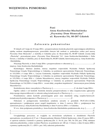 WOJEWODA POMORSKI Gdańsk, dnia 1 lipca 2016 r. PS-IV.431.1.5.2016 Pani Anna Kozłowska-Machalińska „Prywatny Dom Słoneczko” ul. Bysewska 5A, 80-287 Gdańsk Zalecenia pokontrolne W dniach od 5 maja do 10 maja 2016 r. przeprowadzono kontrolę placówki zapewniającej całodobową opiekę osobom niepełnosprawnym, przewlekle chorym lub osobom w podeszłym wieku pod nazwą Prywatny Dom Słoneczko”, z siedzibą w Gdańsku przy ul. Bysewskiej 5A, 80-287 Gdańsk zwanej dalej „Placówką”, prowadzonej przez „Prywatny Dom Słoneczko" S.C. Anna Kozłowska-Machalińska i Zofia Szwarc, z siedzibą w Gdańsku, przy ul. Bysewskiej 5A, 80-287 Gdańsk, kierowanej przez p. Annę Kozłowska-Machalińską. Wizytację Placówki, w dniu 5 maja 2016 r. przeprowadzono w obecności p. [.............................................]* (męża p. Anny Kozłowska-Machalińskiej). Kontrolujący: Mariusz Jandzio, starszy inspektor wojewódzki Wydziału Polityki Społecznej Pomorskiego Urzędu Wojewódzkiego w Gdańsku, na podstawie upoważnienia Wojewody Pomorskiego, nr 113/2016 z 4 maja 2016 r., Lucyna Gostomska, inspektor wojewódzki Wydziału Polityki Społecznej Pomorskiego Urzędu Wojewódzkiego w Gdańsku na podstawie upoważnienia Wojewody Pomorskiego, nr 115/2016 z 4 maja 2016 r. i Jolanta Mazurkiewicz, starszy inspektor wojewódzki Wydziału Polityki Społecznej Pomorskiego Urzędu Wojewódzkiego w Gdańsku na podstawie upoważnienia Wojewody Pomorskiego, nr 114/2016 z 4 maja 2016 r. zwani dalej „zespołem inspektorów”, kierowanym przez Jolantę Mazurkiewicz. Kontrolowany okres: czas pobytu w Placówce p. [.................................................]*, do dnia 5 maja 2016 r. Ogólny zakres i cel kontroli: Kontrola doraźna przeprowadzona w toku rozpatrywania zgłoszenia dotyczącego nieprawidłowości w zakresie usług świadczonych w Placówce p. [..............................................]*. Przedmiotowy zakres kontroli: przestrzeganie praw oraz standardy usług socjalno-bytowych świadczonych przebywającemu w Placówce p. [......................................................]*. Dokonane w postępowaniu kontrolnym ustalenia zawarto w protokóle PS-IV.431.1.5.2016, sporządzonym i podpisanym przez zespół inspektorów w dniu 2 czerwca 2016 r., podpisanym bez zastrzeżeń przez p. Annę Kozłowska-Machalińską w dniu 9 czerwca 2016 r. w Gdańsku. W ww. dniu podpisania protokółu p. Anna Kozłowska-Machalińska poinformowała, że p. [..................]* [............................................................................................................................................... ............................................]*, [............................................................................................................................ ...............................................................]*. Uwzględniając powyższe, ze względu na stwierdzone uchybienia w działalności Placówki sporządzono, na podstawie § 17 ust. 1 Rozporządzenia Ministra Polityki Społecznej z dnia 23 marca 2005 r. w sprawie nadzoru i kontroli w pomocy społecznej (Dz. U. Nr 61, poz. 543, Nr 210, poz. 1750), niniejsze zalecenia pokontrolne, a także wydano Placówce, na podstawie art. 128 ust. 1 Ustawy z dnia 12 marca 2004 r. o pomocy społecznej (Dz. U. z 2015 r. poz. 163), zalecenia pokontrolne. Pokontrolna ocena działalności placówki . I ORGANIZACJA PLACÓWKI. 1. Zezwolenie na prowadzenie Placówki. Placówka prowadzona jest w ramach działalności gospodarczej, zgodnie z art. 67 ust. 1 Ustawy z dnia 12 marca 2004 r. o pomocy społecznej, na podstawie zezwolenia Wojewody Pomorskiego udzielonego decyzją z dnia 27 listopada 2009 r., zmienioną decyzją z dnia 24 stycznia 2011 r. wydaną na czas nieokreślony. Placówka znajduje się na pozycji nr 16 w Rejestrze placówek zapewniających całodobową opiekę osobom niepełnosprawnym, przewlekle chorym lub osobom w podeszłym wieku mających siedzibę w województwie pomorskim. 2. Typ Placówki i liczba miejsc dla mieszkańców. Placówka posiada trzydzieści pięć miejsc przeznaczonych dla osób niepełnosprawnych, osób przewlekle chorych i osób w podeszłym wieku. II USŁUGI BYTOWE. 1. Miejsce pobytu. 1) budynek i otoczenie Placówki: Placówka zapewnia mieszkańcom, zgodnie z art. 68 ust. 4 pkt 1 Ustawy z dnia 2 marca 2004 r. o pomocy społecznej, miejsce pobytu w budynku i jego otoczeniu bez barier architektonicznych. Wejście do Placówki jest możliwe tylko przez dwuskrzydłowa bramę wjazdowa zamykaną na kłódkę; przy bramie zamontowano domofon służący tylko jako dzwonek. Każdorazowe wejście i wyjście z terenu Placówki wymaga otwarcia bramy poprzez rozpięcie kłódki przez personel bezpośrednio przy bramie. Należy zwrócić uwagę, że personel w celu otwarcia bramy musi opuścić budynek Placówki. 2) pokoje mieszkalne: Placówka zapewniała p. [...................................]*, zgodnie z art. 68 ust. 4 pkt 2 ww. Ustawy, miejsce pobytu w [.................................................]* pokoju mieszkalnym na drugiej kondygnacji naziemnej w budynku wielokondygnacyjnym z windą. Pokój zajmowany przez p. [...............................................]* spełniał wszystkie wymagania dotyczące powierzchni użytkowej, osobowego przeznaczenia i wyposażenia określone w art. 68 ust. 4 pkt 3 lit. a-c i art. 68 ust. 4a ww. Ustawy. 3) warunki sanitarne: Placówka, zapewnia mieszkańcom, zgodnie z art. 68 ust. 5 pkt 3 ww. Ustawy, jedną łazienkę dla nie więcej niż pięciu osób i jedną toaletę dla nie więcej niż czterech osób, wyposażone w uchwyty ułatwiające osobom mniej sprawnym korzystanie z tych pomieszczeń. Obok pokoju zajmowanego przez p. [......................................]* znajduje się, ogólnodostępna łazienka wyposażona w natrysk, umywalkę, miskę sedesową oraz uchwyty ułatwiające osobom niepełnosprawnym korzystanie z tego pomieszczenia. 2. W