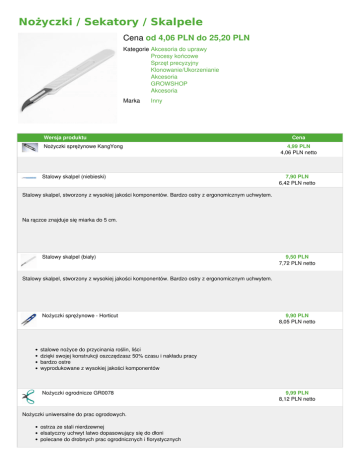 Nożyczki / Sekatory / Skalpele Cena od 4,06 PLN do 25,20 PLN Kategorie Akcesoria do uprawy Procesy końcowe Sprzęt precyzyjny Klonowanie/Ukorzenianie Akcesoria GROWSHOP Akcesoria Marka Inny Wersja produktu Cena Nożyczki sprężynowe KangYong 4,99 PLN 4,06 PLN netto Stalowy skalpel (niebieski) 7,90 PLN 6,42 PLN netto Stalowy skalpel, stworzony z wysokiej jakości komponentów. Bardzo ostry z ergonomicznym uchwytem. Na rączce znajduje się miarka do 5 cm. Stalowy skalpel (biały) 9,50 PLN 7,72 PLN netto Stalowy skalpel, stworzony z wysokiej jakości komponentów. Bardzo ostry z ergonomicznym uchwytem. Nożyczki sprężynowe - Horticut 9,90 PLN 8,05 PLN netto stalowe nożyce do przycinania roślin, liści dzięki swojej konstrukcji oszczędzasz 50% czasu i nakładu pracy bardzo ostre wyprodukowane z wysokiej jakości komponentów Nożyczki ogrodnicze GR0078 Nożyczki uniwersalne do prac ogrodowych. ostrza ze stali nierdzewnej elsatyczny uchwyt latwo dopasowujący się do dłoni polecane do drobnych prac ogrodnicznych i florystycznych 9,99 PLN 8,12 PLN netto Powered by TCPDF (www.tcpdf.org) Nożyczki sprężynowe z uchwytem na palec 11,91 PLN 9,68 PLN netto Długość - 10cm Odkręcane ostrza ułatwiające czyszczenie Nożyczki precyzyjne Leef Kleen 26,51 PLN 21,55 PLN netto Leef Kleen precyzyjne Nożyczki. Praktyczne i trwałe, pozwalają na łatwe cięcie, wykończenie i utrzymanie roślin w ogrodzie. Cechy: Cienkie ostrza zapewniają wysoką precyzję cięcia. Ergonomiczny kształt pozwala na wygodny chwyt. Ostrze ze stali nierdzewnej o wysokiej jakości. Wysokiej jakości sprężyna zwiększa szybkość i wydajność. Nożyczki ogrodnicze do Bonzai CIS 31,00 PLN 25,20 PLN netto Są to nożyczki z cienką końcówką, idealne do bardzo precyzyjnego manicure roślin. Zapewniają dostęp do najtrudniejszych Łatwy chwyt dzięki swoim dużymi uchwytami, unikając skurcze po dłuższym przycinanie lub manicure. Galeria
