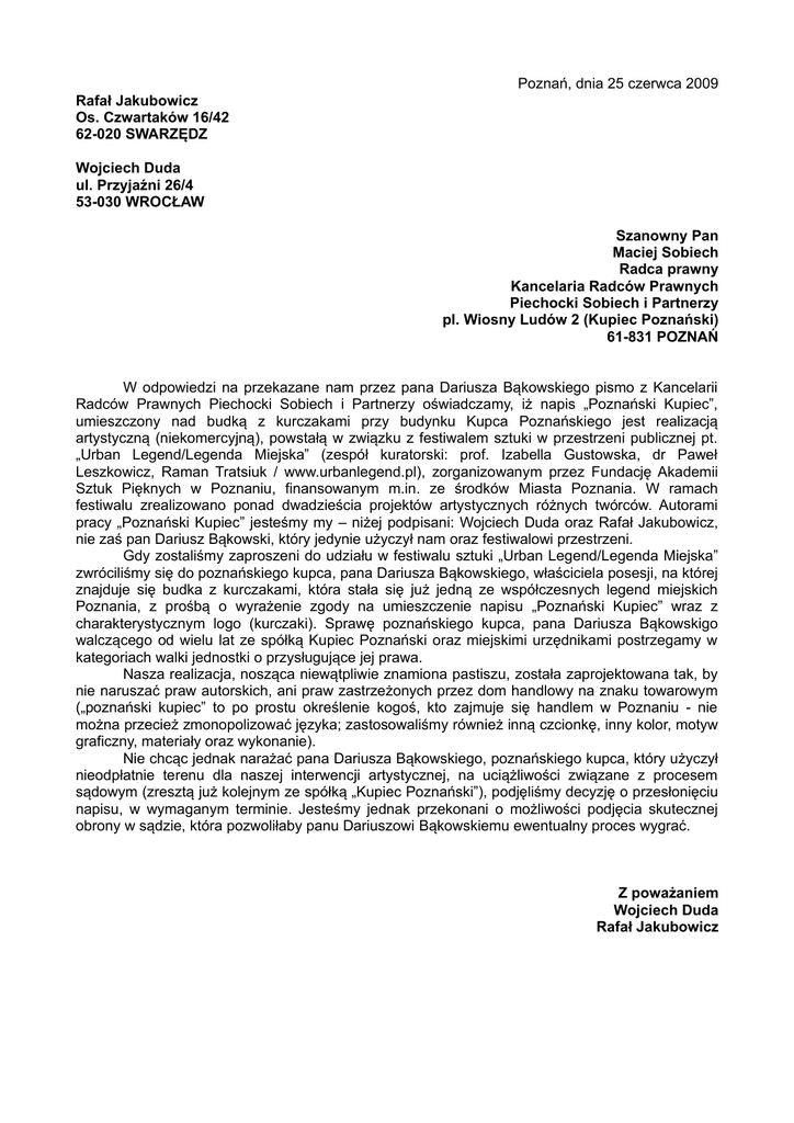 Poznań, dnia 25 czerwca 2009 Rafał Jakubowicz Os. Czwartaków 16/42 62-020 SWARZĘDZ Wojciech Duda ul. Przyjaźni 26/4 53-030 WROCŁAW Szanowny Pan Maciej Sobiech Radca prawny Kancelaria Radców Prawnych Piechocki Sobiech i Partnerzy pl. Wiosny Ludów 2 (Kupiec Poznański) 61-831 POZNAŃ W odpowiedzi na przekazane nam przez pana Dariusza Bąkowskiego pismo z Kancelarii Radców Prawnych Piechocki Sobiech i Partnerzy oświadczamy, iż napis „Poznański Kupiec”, umieszczony nad budką z kurczakami przy budynku Kupca Poznańskiego jest realizacją artystyczną (niekomercyjną), powstałą w związku z festiwalem sztuki w przestrzeni publicznej pt. „Urban Legend/Legenda Miejska” (zespół kuratorski: prof. Izabella Gustowska, dr Paweł Leszkowicz, Raman Tratsiuk / www.urbanlegend.pl), zorganizowanym przez Fundację Akademii Sztuk Pięknych w Poznaniu, finansowanym m.in. ze środków Miasta Poznania. W ramach festiwalu zrealizowano ponad dwadzieścia projektów artystycznych różnych twórców. Autorami pracy „Poznański Kupiec” jesteśmy my – niżej podpisani: Wojciech Duda oraz Rafał Jakubowicz, nie zaś pan Dariusz Bąkowski, który jedynie użyczył nam oraz festiwalowi przestrzeni. Gdy zostaliśmy zaproszeni do udziału w festiwalu sztuki „Urban Legend/Legenda Miejska” zwróciliśmy się do poznańskiego kupca, pana Dariusza Bąkowskiego, właściciela posesji, na której znajduje się budka z kurczakami, która stała się już jedną ze współczesnych legend miejskich Poznania, z prośbą o wyrażenie zgody na umieszczenie napisu „Poznański Kupiec” wraz z charakterystycznym logo (kurczaki). Sprawę poznańskiego kupca, pana Dariusza Bąkowskigo walczącego od wielu lat ze spółką Kupiec Poznański oraz miejskimi urzędnikami postrzegamy w kategoriach walki jednostki o przysługujące jej prawa. Nasza realizacja, nosząca niewątpliwie znamiona pastiszu, została zaprojektowana tak, by nie naruszać praw autorskich, ani praw zastrzeżonych przez dom handlowy na znaku towarowym („poznański kupiec” to po prostu określenie kogoś, kto zajmuje się handlem w Poznaniu - nie można przecież zmonopolizować języka; zastosowaliśmy również inną czcionkę, inny kolor, motyw graficzny, materiały oraz wykonanie). Nie chcąc jednak narażać pana Dariusza Bąkowskiego, poznańskiego kupca, który użyczył nieodpłatnie terenu dla naszej interwencji artystycznej, na uciążliwości związane z procesem sądowym (zresztą już kolejnym ze spółką „Kupiec Poznański”), podjęliśmy decyzję o przesłonięciu napisu, w wymaganym terminie. Jesteśmy jednak przekonani o możliwości podjęcia skutecznej obrony w sądzie, która pozwoliłaby panu Dariuszowi Bąkowskiemu ewentualny proces wygrać. Z poważaniem Wojciech Duda Rafał Jakubowicz