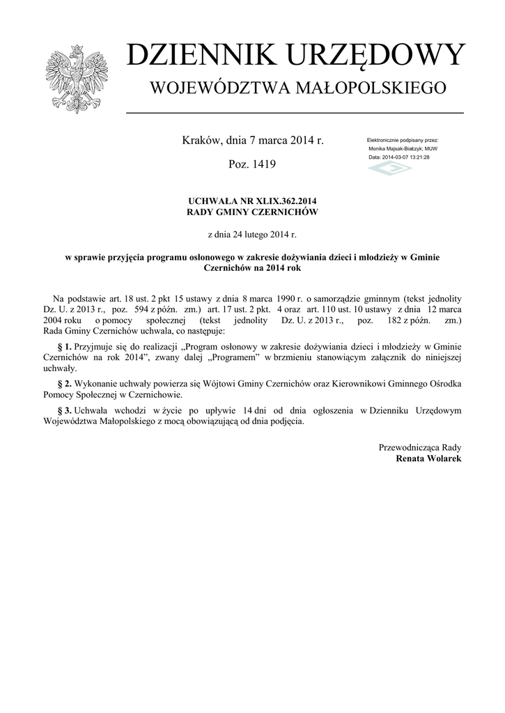 DZIENNIK URZĘDOWY WOJEWÓDZTWA MAŁOPOLSKIEGO Kraków, dnia 7 marca 2014 r. Elektronicznie podpisany przez: Monika Majsak-Białczyk; MUW Poz. 1419 Data: 2014-03-07 13:21:28 UCHWAŁA NR XLIX.362.2014 RADY GMINY CZERNICHÓW z dnia 24 lutego 2014 r. w sprawie przyjęcia programu osłonowego w zakresie dożywiania dzieci i młodzieży w Gminie Czernichów na 2014 rok Na podstawie art. 18 ust. 2 pkt 15 ustawy z dnia 8 marca 1990 r. o samorządzie gminnym (tekst jednolity Dz. U. z 2013 r., poz. 594 z późn. zm.) art. 17 ust. 2 pkt. 4 oraz art. 110 ust. 10 ustawy z dnia 12 marca 2004 roku o pomocy społecznej (tekst jednolity Dz. U. z 2013 r., poz. 182 z późn. zm.) Rada Gminy Czernichów uchwala, co następuje: § 1. Przyjmuje się do realizacji „Program osłonowy w zakresie dożywiania dzieci i młodzieży w Gminie Czernichów na rok 2014”, zwany dalej „Programem” w brzmieniu stanowiącym załącznik do niniejszej uchwały. § 2. Wykonanie uchwały powierza się Wójtowi Gminy Czernichów oraz Kierownikowi Gminnego Ośrodka Pomocy Społecznej w Czernichowie. § 3. Uchwała wchodzi w życie po upływie 14 dni od dnia ogłoszenia w Dzienniku Urzędowym Województwa Małopolskiego z mocą obowiązującą od dnia podjęcia. Przewodnicząca Rady Renata Wolarek Dziennik Urzędowy Województwa Małopolskiego –2– Poz. 1419 Załącznik do Uchwały Nr XLIX.362.2014 Rady Gminy Czernichów z dnia 24 lutego 2014 r. PROGRAM OSŁONOWY DOŻYWIANIA DZIECI I MŁODZIEŻY W GMINIE CZERNICHÓW NA ROK 2014 1. Podstawa prawna i uzasadnienie realizacji programu Podstawę prawną dla wdrożenia programu stanowią art. 17 ust. 2 pkt. 4 oraz art. 110 ust. 10 ustawy z dnia 12 marca 2004 roku o pomocy społecznej (tekst jednolity Dz. U. z 2013 r., poz. 182 z późn. zm.). Program osłonowy w zakresie dożywiania adresowany w szczególności do: 1) dzieci do czasu podjęcia nauki w szkole podstawowej, 2) uczniów do czasu ukończenia szkoły ponadgimnazjalnej, pochodzących z rodzin zamieszkujących na terenie gminy Czernichów. Opracowanie i wdrożenie programu osłonowego w zakresie dożywiania jest jedną z form wsparcia dla dzieci i młodzieży z rodzin problemowych, jakie będzie stosowała gmina Czernichów w związku z wejściem w życie od 1 stycznia 2014 roku uchwały Nr 221 Rady Ministrów z dnia 10 grudnia 2013 roku w sprawie ustanowienia wieloletniego programu wspierania finansowego gmin w zakresie dożywiania „Pomoc państwa w zakresie dożywiania” na lata 2014-2020 (M. P. z 2013 r. Nr 221). Wspomniana wyżej uchwała zmienia dotychczasowe zasady finansowania pomocy w zakresie dożywiania. Uchwała stanowi szczególny rodzaj procedury opisującej wsparcie finansowe gmin w realizacji zadania „dożywianie”, definiując jednocześnie kryteria jakie muszą spełniać gminy do uzyskania dofinansowania do zadań własnych. Wymienione w treści uchwały nr 221 Rady Ministrów warunki uznane będą za spełnione jeśli gmina obejmie dożywianiem osoby spełniające warunki otrzymania pomocy wskazane w ustawie z dnia 12 marca 2004 roku o pomocy społecznej oraz spełniające kryterium dochodowe w wysokości 150% kryterium, o którym mowa w art. 8 ust. 1 ustawy o pomocy społecznej. W treści uchwały Rady Ministrów uwzględniono też możliwość finansowania dożywiania dzieci i młodzieży wywodzącej się z rodzin, które nie spełniają kryterium dochodowego określonego w przepisach o pomocy społecznej, o ile gmina uchwali program osłonowy adresowany do tej grupy mieszkańców. Z uwagi na to, że w gminie Czernichów od kilku lat udzielana jest pomoc w formie dożywiania również dzieciom z rodzin, w których dochód przekracza ustawowe kryterium i występują szczególnie uzasadnione powody dla zastosowanie tego rodzaju wsparcia zasadne jest wdrożenie programu osłonowego w zakresie dożywiania dzieci i młodzieży. Program osłonowy w zakresie dożywiania wpisuje się w Gminną Strategię Rozwiązywania Problemów Społecznych Gminy Czernichów, w cel strategiczny nr 4 – propagowanie prawidłowego wzorca funkcjonowania rodziny oraz eliminowanie patologii oraz cel operacyjny jakim jest wsparcie rodzin finansowe, rzeczowe i w naturze mające na celu zaspokojenie podstawowych potrzeb życiowych oraz jest zgodny z założeniami polityki społecznej na szczeblu powiatu, regionu i kraju. 2. Diagnoza społeczna Zgodnie z diagnozą społeczną zawartą w Gminnej Strategii Rozwiązywania Problemów Społecznych Gminy Czernichów większość osób/rodzin korzystających z pomocy społecznej utrzymuje się z dochodów uzyskiwanych z prac dorywczych, dochodów z gospodarstw rolnych oraz dochodów z pracy na podstawie umowy cywilno – prawnej. Dochody te są niewielkie, co przekłada się na niski poziom ich życia. Trudności rodzin potęguje bezrobocie, niezaradność, choroby i niepełnosprawność oraz inne problemy ograniczające dzieciom i młodzieży możliwość prawidłowego rozwoju. Dziennik Urzędowy Województwa Małopolskiego –3– Poz. 1419 Rodziny doświadczające trudności życiowych korzystają ze świadczeń pomocy społecznej. Problemy dotyczą nie tylko rodzin najuboższych, lecz także rodzin posiadających dochody, lecz borykających się z innymi problemami, które uniemożliwiają zapewnienie stosownych warunków do opieki i wychowania dzieci i młodzieży. W rodzinach niespełniających kryteriów określonych w przepisach o pomocy społecznej, z których dzieci korzystały z dożywiania na przestrzeni minionych lat, obserwowano zróżnicowane problemy, w tym szczególnie: a) zaniedbania opiekuńcze, b) samotne wychowywanie dziecka, c) uzależnienia, d) brak prawidłowych wzorców żywienia rodziny, e) długa nieobecność rodziców w domu w ciągu dnia, f) inne powody. Sporadycznie występowały także inne powody uzasadniające konieczność udzielenie wsparcia w formie dożywiania. 3. Cel programu Celem programu osłonowego w zakresie dożywiania jest „Zapewni