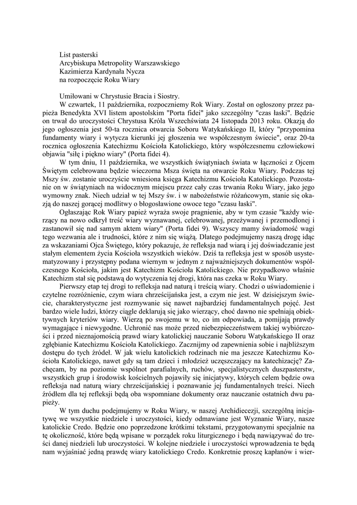 List pasterski Arcybiskupa Metropolity Warszawskiego Kazimierza Kardynała Nycza na rozpoczęcie Roku Wiary Umiłowani w Chrystusie Bracia i Siostry. W czwartek, 11 października, rozpoczniemy Rok Wiary. Został on ogłoszony przez papieŜa Benedykta XVI listem apostolskim "Porta fidei" jako szczególny "czas łaski". Będzie on trwał do uroczystości Chrystusa Króla Wszechświata 24 listopada 2013 roku. Okazją do jego ogłoszenia jest 50-ta rocznica otwarcia Soboru Watykańskiego II, który "przypomina fundamenty wiary i wytycza kierunki jej głoszenia we współczesnym świecie", oraz 20-ta rocznica ogłoszenia Katechizmu Kościoła Katolickiego, który współczesnemu człowiekowi objawia "siłę i piękno wiary" (Porta fidei 4). W tym dniu, 11 października, we wszystkich świątyniach świata w łączności z Ojcem Świętym celebrowana będzie wieczorna Msza święta na otwarcie Roku Wiary. Podczas tej Mszy św. zostanie uroczyście wniesiona księga Katechizmu Kościoła Katolickiego. Pozostanie on w świątyniach na widocznym miejscu przez cały czas trwania Roku Wiary, jako jego wymowny znak. Niech udział w tej Mszy św. i w naboŜeństwie róŜańcowym, stanie się okazją do naszej gorącej modlitwy o błogosławione owoce tego "czasu łaski". Ogłaszając Rok Wiary papieŜ wyraŜa swoje pragnienie, aby w tym czasie "kaŜdy wierzący na nowo odkrył treść wiary wyznawanej, celebrowanej, przeŜywanej i przemodlonej i zastanowił się nad samym aktem wiary" (Porta fidei 9). Wszyscy mamy świadomość wagi tego wezwania ale i trudności, które z nim się wiąŜą. Dlatego podejmujemy naszą drogę idąc za wskazaniami Ojca Świętego, który pokazuje, Ŝe refleksja nad wiarą i jej doświadczanie jest stałym elementem Ŝycia Kościoła wszystkich wieków. Dziś ta refleksja jest w sposób usystematyzowany i przystępny podana wiernym w jednym z najwaŜniejszych dokumentów współczesnego Kościoła, jakim jest Katechizm Kościoła Katolickiego. Nie przypadkowo właśnie Katechizm stał się podstawą do wytyczenia tej drogi, która nas czeka w Roku Wiary. Pierwszy etap tej drogi to refleksja nad naturą i treścią wiary. Chodzi o uświadomienie i czytelne rozróŜnienie, czym wiara chrześcijańska jest, a czym nie jest. W dzisiejszym świecie, charakterystyczne jest rozmywanie się nawet najbardziej fundamentalnych pojęć. Jest bardzo wiele ludzi, którzy ciągle deklarują się jako wierzący, choć dawno nie spełniają obiektywnych kryteriów wiary. Wierzą po swojemu w to, co im odpowiada, a pomijają prawdy wymagające i niewygodne. Uchronić nas moŜe przed niebezpieczeństwem takiej wybiórczości i przed nieznajomością prawd wiary katolickiej nauczanie Soboru Watykańskiego II oraz zgłębianie Katechizmu Kościoła Katolickiego. Zacznijmy od zapewnienia sobie i najbliŜszym dostępu do tych źródeł. W jak wielu katolickich rodzinach nie ma jeszcze Katechizmu Kościoła Katolickiego, nawet gdy są tam dzieci i młodzieŜ uczęszczający na katechizację? Zachęcam, by na poziomie wspólnot parafialnych, ruchów, specjalistycznych duszpasterstw, wszystkich grup i środowisk kościelnych pojawiły się inicjatywy, których celem będzie owa refleksja nad naturą wiary chrześcijańskiej i poznawanie jej fundamentalnych treści. Niech źródłem dla tej refleksji będą oba wspomniane dokumenty oraz nauczanie ostatnich dwu papieŜy. W tym duchu podejmujemy w Roku Wiary, w naszej Archidiecezji, szczególną inicjatywę we wszystkie niedziele i uroczystości, kiedy odmawiane jest Wyznanie Wiary, nasze katolickie Credo. Będzie ono poprzedzone krótkimi tekstami, przygotowanymi specjalnie na tę okoliczność, które będą wpisane w porządek roku liturgicznego i będą nawiązywać do treści danej niedzieli lub uroczystości. W kolejne niedziele i uroczystości wprowadzenia te będą nam wyjaśniać jedną prawdę wiary katolickiego Credo. Konkretnie proszę kapłanów i wier- nych świeckich, aby w kaŜdej parafii po homilii była chwila ciszy, do której zachowania zachęca i daje przykład papieŜ Benedykt XVI. Podejmijmy wtedy refleksję nad usłyszanym Słowem BoŜym, a następnie, siedząc, z uwagą wysłuchajmy odczytywanego wprowadzenia. Następnie celebrans zachęci nas do wyznania wiary. Niech to będzie dla nas ta szczególna okazja do regularnej refleksji nad wiarą, jak i do jej autentycznego wyznania. W powyŜszej inicjatywie, oprócz poszukiwania zrozumienia treści wiary, pojawia się i drugi wymiar naszego formacyjnego działania w tym roku. Jest nim celebrowanie i przeŜywanie wiary. Albowiem, jak uczy papieŜ "nawet najlepsza znajomość treści, w które naleŜy wierzyć, nie wystarcza" (Porta fidei 10). Konieczna jest bowiem łaska. Nie moŜemy zapominać, Ŝe wiara jest darem Boga, czyli łaską, do przyjęcia której naleŜy się przygotować, którą trzeba otwartym i czystym sercem przyjąć i której naleŜy strzec, ale przede wszystkim w której naleŜy wzrastać. Dlatego nieodzownym elementem naszego Ŝycia duchowego jest wiara celebrowana w liturgii. To tu bowiem, szczególnie w sakramentach, doświadczamy najpełniejszego obdarowania łaską. Troska o wiarę, to przede wszystkim troska o tę łaskę u siebie i drugich. Samo gromadzenie się na wspólną modlitwę, szczególnie liturgię, jest juŜ manifestacją naszej wiary. JednakŜe nasze wspólne jej wyznawanie na liturgii, to duŜo więcej niŜ przypomnienie sobie jej podstawowych treści. Jest to wspólnotowe opowiedzenie się po stronie wiary i jednocześnie uroczyste zobowiązanie się przed Bogiem i braćmi do sumiennego jej praktykowania. Właśnie owo praktykowanie wiary, to trzeci wymiar naszego zaangaŜowania w tym roku. PapieŜ przypomina nam, Ŝe wiara wyraŜa się świadectwem (por. Porta fidei 10). Dla chrześcijanina podstawowym kryterium myślenia i działania jest "wiara, która działa przez miłość"(Ga 5, 6). Pierwszym przejawem chrześcijańskiej miłości