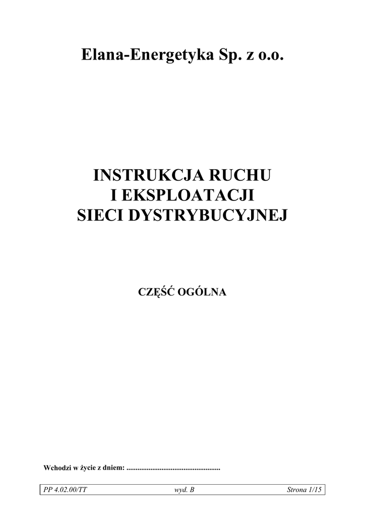 Elana-Energetyka Sp. z o.o. INSTRUKCJA RUCHU I EKSPLOATACJI SIECI DYSTRYBUCYJNEJ CZĘŚĆ OGÓLNA Wchodzi w Ŝycie z dniem: ................................................... PP 4.02.00/TT wyd. B Strona 1/15 ZINTEGROWANY SYSTEM ZARZĄDZANIA „Elana-Energetyka” Spółka z o.o. Indeks : PP 4.02.00/TT I N S T R U K C J R O B O C Z E Komórka organizacyjna Tytuł : Wydział Elektryczny E Instrukcja ruchu i eksploatacji systemu Dystrybucyjnego Elana-Energetyka Sp. z o.o. Część Pierwsza Ogólna Wydanie: B Stron :15 Egz. Nr : Data : 24.05.2012 r. Zatwierdził: Prezes Zarządu Marek Szmytkowski Zaopiniowali: Specjalista Działu Rozwoju i Nadzoru Robót Specjalista ds. BHP Henryk Sitkowski Specjalista ds. Umów i Rozliczeń Kierownik Wydziału Elektrycznego Specjalista ds. Elektroenergetycznych Stanowisko Ireneusz Najderek Opracowali: Czynność Jacek Sobesto Andrzej Ślizak Marek Dejewski Imię i nazwisko Podpis UŜytkownicy dokumentu: uŜytkownicy systemu dystrybucyjnego. Lp. Data Punkt, którego dotyczy zmiana 1 2 3 PP 4.02.00/TT REJESTR ZMIAN TEKSTU Szczegółowe Podstawa Podpis osoby Podpisy osób Podpis oznakowanie wprowadze wprowadzają opiniujących osoby miejsca nia zmiany -cej zmianę zmianę zatwierdzawprowadzonej jącej zmianę zmiany 4 5 6 7 8 wyd. B Strona 2/15 AKTUALIZACJA INSTRUKCJI Lp. Potwierdzenie aktualności instrukcji na rok PP 4.02.00/TT wyd. B Data aktualizacji Podpis z imienną pieczątką Strona 3/15 SPIS TREŚCI 1. Podstawa prawna ...................................................................................................5 2. Cel ..........................................................................................................................6 3. Zakres ....................................................................................................................8 4. Słownik Pojęć i Definicji..........................................................................................9 5. Dokumenty związane ...........................................................................................15 6. Telefony alarmowe ...............................................................................................15 7. Dokumentowanie..................................................................................................15 8. Zapisy ...................................................................................................................15 PP 4.02.00/TT wyd. B Strona 4/15 1. PODSTAWA PRAWNA 1.1. Instrukcja ruchu i eksploatacji systemu dystrybucyjnego Elana-Energetyka Sp. z o.o. (dalej „IRiESD”) opracowana została przez OSDn Elana-Energetyka Sp. z o.o. na podstawiae art. 9g ust.1 Ustawy Prawo energetyczne. 1.2. IRiESD spełnia wymagania: a/ zawarte w krajowych aktach prawnych, w szczególności w ustawie Prawo energetyczne oraz wydanych na jej podstwie aktach wykonawczych, b/ wynikające z koncesji OSDn na przesyłanie energii elektrycznej, c/ wynikające ze standardów bezpieczeństwa i niezawodności pracy systemu elektroenergetycznego. 1.3. IRiESD składa się z następujących części: a/ IRiESD część ogólna, b/ IRiESD część techniczne, c/ IRiESD bilansowanie systemu. 1.4. IRiESD jest regulaminem w rozumieniu art. 384 $ 1 Kodeksu cywilnego. 1.5. IRiESD sporządzona została w języku polskim i ta wersja językowa jest obowiązująca. Inne wersje językowe mają charakter tylko informacyjny. PP 4.02.00/TT wyd. B Strona 5/15 2. CEL Celem instrukcji jest podanie sposobu postępowania personelu w czasie eksploatacji, aby zapewnić wysoką niezawodność zasilania eksploatowanej sieci elektroenergetycznej przedsiębiorstwa Elana-Energetyka Sp. z o.o. i połączonych z nią sieci i instalacji elektroenergetycznych innych podmiotów prawnych oraz zapewnić bezpieczeństwo obsługujących ją pracowników poprzez: a/ ustalenie zasad organizacyjnych eksploatacji urządzeń elektroenergetycznych, b/ ustalenie zakresu praw, obowiązków i odpowiedzialności personelu związanego z dozorem i obsługą urządzeń , c/ ułatwienie zapoznania się personelowi eksploatacji z systemem elektroenergetycznym Zakładu, d/ podanie sposobu postępowania w normalnych i awaryjnych warunkach ruchu, e/ ułatwienie personelowi eksploatacyjnemu utrzymania ciągłości właściwą ocenę stanu technicznego i właściwą obsługi urządzeń w tej sieci, ruchu poprzez f/ podanie środków zmierzających do zapewnienia bezpieczeństwa przy obsłudze czynnych urządzeń elektroenergetycznych, g/ prowadzenie ruchu sieciowego w sieci dystrybucyjnej w sposób efektywny, z zachowaniem wymaganej niezawodności dostarczania energii elektrycznej i jakości jej dostarczania oraz we współpracy z operatorem systemu przesyłowego poprzez OSDp, zgodnie z art. 9c ust 3a ustawy Prawo Energetyczne, h/ eksploatację, konserwację i remonty sieci dystrybucyjnej w sposób gwarantujący niezawodność funkcjonowania systemu dystrybucyjnego, i/ zapewnienie rozbudowy sieci dystrybucyjnej, a tam gdzie ma to zastosowanie, rozbudowy połączeń międzysystemowych w obszarze swego działania, j/ współpracę z innymi operatorami systemów elektroenergetycznych lub przedsiębiorstwami energetycznymi w celu zapewnienia spójności działania systemów elektroenergetycznych i skoordynowania ich rozwoju, a takŜe niezawodnego oraz efektywnego funkcjonowania tych systemów, k/ dysponowanie mocą jednostek wytwórczych przyłączonych do sieci dystrybucyjnej, z wyłączeniem jednostek wytwórczych o mocy osiągalnej równej 50 MW lub wyŜszej, przyłączonych do koordynowanej sieci 110 kV, l/ dostarczanie uŜytkownikom sieci i operatorom innych systemów elektroenergetycznych, z którymi system jest połączony, informacji o warunkach świadczenia usług dystrybucji energii elektrycznej oraz zarządzaniu siecią, niezbędnych do uzyskania dostępu do sieci dystrybucyjnej i korzystania z tej sieci; m/ umoŜliwienie realizacji umów sprzedaŜy energii elektrycznej zawartyc