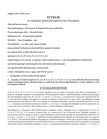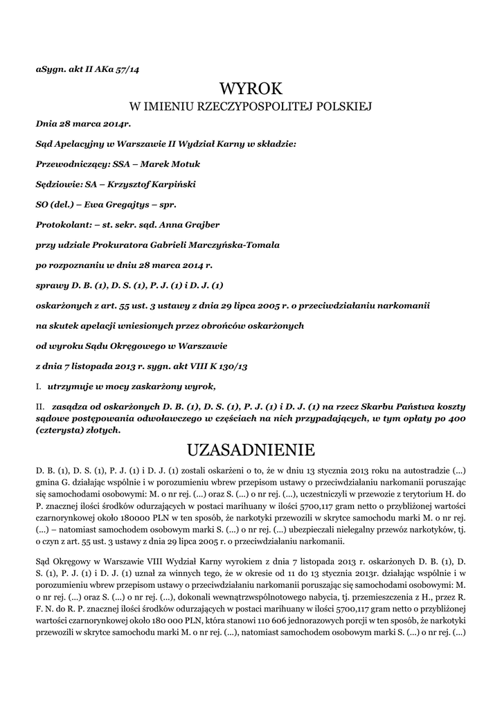 aSygn. akt II AKa 57/14 WYROK W IMIENIU RZECZYPOSPOLITEJ POLSKIEJ Dnia 28 marca 2014r. Sąd Apelacyjny w Warszawie II Wydział Karny w składzie: Przewodniczący: SSA – Marek Motuk Sędziowie: SA – Krzysztof Karpiński SO (del.) – Ewa Gregajtys – spr. Protokolant: – st. sekr. sąd. Anna Grajber przy udziale Prokuratora Gabrieli Marczyńska-Tomala po rozpoznaniu w dniu 28 marca 2014 r. sprawy D. B. (1), D. S. (1), P. J. (1) i D. J. (1) oskarżonych z art. 55 ust. 3 ustawy z dnia 29 lipca 2005 r. o przeciwdziałaniu narkomanii na skutek apelacji wniesionych przez obrońców oskarżonych od wyroku Sądu Okręgowego w Warszawie z dnia 7 listopada 2013 r. sygn. akt VIII K 130/13 I. utrzymuje w mocy zaskarżony wyrok, II. zasądza od oskarżonych D. B. (1), D. S. (1), P. J. (1) i D. J. (1) na rzecz Skarbu Państwa koszty sądowe postępowania odwoławczego w częściach na nich przypadających, w tym opłaty po 400 (czterysta) złotych. UZASADNIENIE D. B. (1), D. S. (1), P. J. (1) i D. J. (1) zostali oskarżeni o to, że w dniu 13 stycznia 2013 roku na autostradzie (...) gmina G. działając wspólnie i w porozumieniu wbrew przepisom ustawy o przeciwdziałaniu narkomanii poruszając się samochodami osobowymi: M. o nr rej. (...) oraz S. (...) o nr rej. (...), uczestniczyli w przewozie z terytorium H. do P. znacznej ilości środków odurzających w postaci marihuany w ilości 5700,117 gram netto o przybliżonej wartości czarnorynkowej około 180000 PLN w ten sposób, że narkotyki przewozili w skrytce samochodu marki M. o nr rej. (...) – natomiast samochodem osobowym marki S. (...) o nr rej. (...) ubezpieczali nielegalny przewóz narkotyków, tj. o czyn z art. 55 ust. 3 ustawy z dnia 29 lipca 2005 r. o przeciwdziałaniu narkomanii. Sąd Okręgowy w Warszawie VIII Wydział Karny wyrokiem z dnia 7 listopada 2013 r. oskarżonych D. B. (1), D. S. (1), P. J. (1) i D. J. (1) uznał za winnych tego, że w okresie od 11 do 13 stycznia 2013r. działając wspólnie i w porozumieniu wbrew przepisom ustawy o przeciwdziałaniu narkomanii poruszając się samochodami osobowymi: M. o nr rej. (...) oraz S. (...) o nr rej. (...), dokonali wewnątrzwspólnotowego nabycia, tj. przemieszczenia z H., przez R. F. N. do R. P. znacznej ilości środków odurzających w postaci marihuany w ilości 5700,117 gram netto o przybliżonej wartości czarnorynkowej około 180 000 PLN, która stanowi 110 606 jednorazowych porcji w ten sposób, że narkotyki przewozili w skrytce samochodu marki M. o nr rej. (...), natomiast samochodem osobowym marki S. (...) o nr rej. (...) ubezpieczali nielegalny przewóz narkotyków i zostali zatrzymani na autostradzie (...) gmina G., tj. zbrodni z art. 55 ust. 3 ustawy z dnia 29 lipca 2005 r. o przeciwdziałaniu narkomanii i za tę zbrodnię na podstawie art. 55 ust. 3 ustawy z dnia 29 lipca 2005 r. o przeciwdziałaniu narkomanii wymierzył kary: - oskarżonemu D. B. (1) 4 lat pozbawienia wolności, - oskarżonemu D. S. (1) 4 lat pozbawienia wolności, - oskarżonemu P. J. (1) 4 lat pozbawienia wolności, - oskarżonemu D. J. (1) 5 lat pozbawienia wolności. Sąd, na podstawie art. 63 § 1 kk, na poczet wymierzonych oskarżonym kar pozbawienia wolności zaliczył okresy zatrzymania i tymczasowego aresztowania od dnia 13 stycznia do 7 listopada 2013 r. uznając w tym zakresie karę za wykonaną a na podstawie art. 70 ust. 1 ustawy z dnia 29 lipca 2005 roku o przeciwdziałaniu narkomanii orzekł przepadek na rzecz Skarbu Państwa dowodów rzeczowych opisanych w wykazie (...) (...) (...) pod pozycją (...). Rozstrzygając w przedmiocie kosztów postępowania sąd, powołując się na treść art. 624 § 1 kpk, obciążył nimi Skarb Państwa. Apelacje od wyroku wnieśli obrońcy oskarżonych. Obrońca oskarżonego D. J. (1) zaskarżył wyrok w całości i powołując się na treść art. 427 § 2 kpk i art. 438 pkt 2 kpk rozstrzygnięciu sądu pierwszej instancji zarzucił naruszenie przepisów postępowania, które miało wpływ na treść orzeczenia w postaci: 1) obrazy art. 193 § 1 kpk oraz art. 7 kpk poprzez samodzielne rozstrzygnięcie przez Sąd wiadomości specjalnych, które miały istotne znaczenie dla rozstrzygnięcia, a w konsekwencji niezgodne z zasadami doświadczenia życiowego i logiki uznanie, że samochody marek M. i S. (...) podróżowały razem w niewielkiej odległości na podstawie odczytów stacji (...); 2) art. 2 § 2 kpk, art. 4 kpk, art. 5 § 2 kpk, art. 7 kpk wobec naruszenia zasad swobodnej oceny dowodów poprzez niezgodne z zasadami doświadczenia życiowego i logiki uznanie, iż samochody musiały pokonać tożsamą trasę jedynie na podstawie kwitów opłat na autostradzie w miejscowościach L. oraz S., podczas gdy Sąd wyraźnie wskazał, iż w samochodzie S. (...) znaleziono dodatkowo kwity z miejscowości N., T./G.-N., T.-T., których nie znaleziono w samochodzie marki M.; 3) art. 2 § 2 kpk. art. 4 kpk. art. 5 § 2 kpk. art. 7 kpk wobec naruszenia zasad swobodnej oceny dowodów poprzez niezgodne z zasadami doświadczenia życiowego i logiki uznanie, iż wyjaśnienia D. B. (1) wskazują na udział współoskarżonych w zarzucanym im przestępstwie, w szczególności poprzez uznanie, iż D. B. (1) dopasował swoją wersję wydarzeń do wyjaśnień współoskarżonych; 4) art. 2 § 2 kpk. art. 4 kpk. art. 5 § 2 kpk, art. 7 kpk wobec naruszenia zasad swobodnej oceny dowodów poprzez niezgodne z zasadami doświadczenia życiowego i logiki uznanie za okoliczność obciążającą domysłów świadka D. B. (1), że współoskarżeni mogli dotknąć worków z substancją odurzającą; 5) art. 2 § 2 kpk. art. 4 kpk. art. 5 § 2 kpk, art. 7 kpk wobec naruszenia zasad swobodnej oceny dowodów poprzez niezgodne z zasadami doświadczenia życiowego i logiki uznanie, że skoro z paragonów fiskalnych wynika, że tankowane były dwa pojazdy to na pewno drugim tankowanym pojazdem był samochód prowadzony przez D. B. (1); 6) art. 2 § 2 kpk. art. 4 kpk, art. 5 