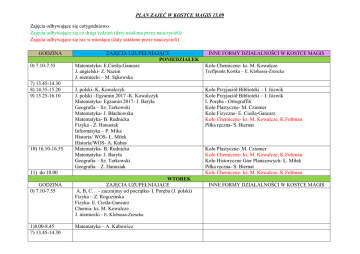 PLAN ZAJĘĆ W KOSTCE MAGIS 15.09 Zajęcia odbywające się cotygodniowo Zajęcia odbywające się co drugi tydzień (daty ustalone przez nauczycieli) Zajęcia odbywające się raz w miesiącu (daty ustalone przez nauczycieli) GODZINA 0) 7.10-7.55 7) 13.45-14.30 8) 14.35-15.20 9) 15.25-16.10 10) 16.10-16.55 ZAJĘCIA UZUPEŁNIAJĄCE PONIEDZIAŁEK Matematyka- E.Cieśla-Gancarz J. angielski- Z. Nazim J. niemiecki – M. Sękowska J. polski- K. Kowalczyk J. polski –Egzamin 2017 -K. Kowalczyk Matematyka- Egzamin 2017- J. Baryła Geografia – Sz. Tarkowski Matematyka- J. Błachowska Matematyka- B. Rudnicka Fizyka - Z. Hanusiak Informatyka – P. Mika Historia/ WOS- Ł. Miłek Historia/WOS- A. Kubas Matematyka- B. Rudnicka Matematyka- J. Baryła Geografia – Sz. Tarkowski Geografia – Z. Hanusiak 11) do 18.00 GODZINA 0) 7.10-7.55 1)8.00-8.45 7) 13.45-14.30 WTOREK ZAJĘCIA UZUPEŁNIAJĄCE A, B, C… - zacznijmy od początku- I. Poręba (J. polski) Fizyka – Z. Rogozińska Fizyka- E. Cieśla-Gancarz Chemia- ks. M. Kowalcze J. niemiecki - E. Klobassa-Zrencka Matematyka – A. Kubowicz INNE FORMY DZIAŁALNOŚCI W KOSTCE MAGIS Koło Chemiczne- ks. M. Kowalcze Treffpunkt Kostka – E. Klobassa-Zrencka Koło Przyjaciół Biblioteki – I. Józwik Koło Przyjaciół Biblioteki – I. Józwik I. Poręba - Ortograffiti Koło Plastyczne- M. Cziomer Koło Fizyczne- E. Cieśla-Gancarz Koło Chemiczne- ks. M. Kowalcze, K.Foltman Piłka ręczna- S. Biernat Koło Plastyczne- M. Cziomer Koło Chemiczne- ks. M. Kowalcze, K.Foltman Koło Historyczne Gier Planszowych- Ł. Miłek Piłka ręczna- S. Biernat Koło Chemiczne- ks. M. Kowalcze, K.Foltman INNE FORMY DZIAŁALNOŚCI W KOSTCE MAGIS 8) 14.35-15.20 9) 15.25-16.10 J. polski –Egzamin 2017 -A. Szefer-Walas J. polski -A. Zdanek Chemia- P. Wantuch Chemia- Egzamin 2017- K. Foltman J. niemiecki –Egzamin 2017- A. Krupa Historia / WOS - Egzamin 2017- Ł. Miłek Historia / WOS– A. Kubas K. Kowalczyk – Koło Młodego Dziennikarza (w tym 1 w miesiącu Kostka Smaku i 1 w miesiącu w piątki warsztaty dziennikarskie w Radiu Pryzmat) Koło Fizyczne – A. Błaut Koło J. niemiecki – M.Michalik Koło J. angielski –P. Gorgoń-Fultyn „Najlepsza książka świata” - M. Michalik Koło Teatralne „Dwie Maski Kostki”- A. Korczak Koło Podróżnicze /Koło Geograficzne – Sz. Tarkowski Koło J. niemiecki- A.Krupa /do 16.25/ „Spotkania z historią” Ł. Miłek. A. Kubas Koszykówka- E. Sadłoń Koło Teatralne „Dwie Maski Kostki”- A. Korczak, A. Pietrzyk J. polski –Egzamin 2017 -A. Szefer-Walas J. polski -A. Zdanek J. polski -K. Kowalczyk Chemia- K. Foltman Fizyka- A. Błaut Fizyka –Egzamin 2017 – A. Błaut Informatyka- P. Mika J. niemiecki/ J. angielski – M. Michalik J. niemiecki - A. Krupa/do 16.25/ J. niemiecki – M. Sękowska Historia- D. Muller WF – J. Ilnicka 10) 16.10-16.55 GODZINA Koło Teatralne „Dwie Maski Kostki”- A. Korczak, A. Pietrzyk Koło Podróżnicze/ Koło Geograficzne – Sz. Tarkowski Koszykówka- E. Sadłoń INNE FORMY DZIAŁALNOŚCI W KOSTCE MAGIS ZAJĘCIA UZUPEŁNIAJĄCE ŚRODA 0) 7.10-7.55 7) 13.45-14.30 8) 14.35-15.20 9) 15.25-16.10 10) 16.10-16.55 Informatyka- P. Mika Historia/ WOS – A. Kubas EDB- J. Ilnicka J. polski -A. Zdanek Matematyka- Egzamin 2017- J. Baryła J. angielski- Egzamin 2017 –P. Gorgoń-Fultyn J. niemiecki – Egzamin 2017- E. Klobassa-Zrencka J. polski –Egzamin 2017 – I. Poręba „Cogito”(J. polski)- I.Poręba Koło Biologiczne – M. Ślimak „Wiem więcej” /Chemia/- K. Foltman Koło Techniczne – Z. Hanusiak Koło J.angielski – Z. Nazim Siatkówka- S. Biernat Siatkówka- S. Biernat GODZINA 0) 7.10-7.55 7) 13.45-14.30 8) 14.35-15.20 9) 15.25-16.10 Zajęcia Techniczne – Z. Hanusiak J. angielski –P. Gorgoń-Fultyn J. niemiecki – Egzamin 2017- E. Klobassa-Zrencka ZAJĘCIA UZUPEŁNIAJĄCE CZWARTEK Fizyka – Z. Rogozińska Matematyka- Egzamin 2017- J. Błachowska Matematyka- Egzamin 2017- J. Błachowska Biologia – M. Ślimak J. angielski –P. Gorgoń-Fultyn Biologia- Egzamin 2017 – M. Ślimak 10) 16.10-16.55 GODZINA 0) 7.10-7.55 1) 8.00-8.45 7) 13.45- 14.30 8) 14.35-15.20 9) 15.25-16.10 ZAJĘCIA UZUPEŁNIAJĄCE PIĄTEK J. polski -A. Szefer-Walas Matematyka- A. Kubowicz J. angielski- Egzamin 2017 –Z. Nazim J. niemiecki – M. Sękowska Biologia/Geografia – P. Wantuch J. angielski –Z. Nazim J. niemiecki /J. angielski – M. Michalik INNE FORMY DZIAŁALNOŚCI W KOSTCE MAGIS Cheerleaders- E. Sadłoń „Ortograffiti” – A. Korczak Cheerleaders- E. Sadłoń Piłka nożna- J. Ilnicka Koło Ogrodnicze – P. Wantuch Koło Chemiczne- ks. M. Kowalcze Polonistyczne SOS- A. Korczak Koło Ogrodnicze – P. Wantuch Piłka nożna- J. Ilnicka Polonistyczne SOS- A. Korczak INNE FORMY DZIAŁALNOŚCI W KOSTCE MAGIS Koło Przyjaciół Biblioteki – I. Józwik Koło Przyjaciół Biblioteki – I. Józwik Koło Matematyczne- E.Janda Zespół wokalno-instrumentalny, chór “Kostka” –A. Skoczek (do godz.16.30) Koło Fotograficzne- P. Mika Gimnastyka sportowa- S. Barszcz 10) 16.10-16.55 11) 17.00-17.45 Matematyka- E. Janda Matematyka- A. Kubowicz Koło Fotograficzne- P. Mika „Najlepsza książka świata” - M. Michalik Gimnastyka sportowa- S. Barszcz Koło Fotograficzne- P. Mika 12) do 18.30 INNE • • • • • • Gimnastyka sportowa- S. Barszcz Koło Fotograficzne- P. Mika Projekt z okazji 5. Roku Jubileuszowego Szkoły - „Kultura na 5” – 1 raz w miesiącu zaplanowane wyjścia do instytucji kulturalnych - A. Szefer-Walas, A. Zdanek, I. Poręba. /Terminy uzależnione od aktualnych ofert./ „Muzealna sobota” – 1 raz w miesiącu zwiedzanie muzeów w Krakowie- D. Muller Fizyka na Uniwersytecie Jagiellońskim - Z. Rogozińska (środa godz. 15.oo-18.oo). Zajęcia rozpoczynają się w maju 2017r. Indywidualne konsultacje: Wanda Matias – pedagog, Agnieszka Baran – psycholog, Iwona Pasławska-Smęder pedagog, psychoterapeuta, Joanna Sztuka - terminy ustalane i