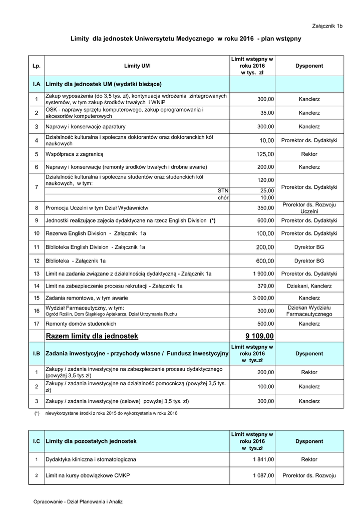 Załącznik 1b Limity dla jednostek Uniwersytetu Medycznego w roku 2016 - plan wstępny Lp. Limit wstępny w roku 2016 w tys. zł Limity UM Dysponent I.A Limity dla jednostek UM (wydatki bieżące) 1 2 Zakup wyposażenia (do 3,5 tys. zł), kontynuacja wdrożenia zintegrowanych systemów, w tym zakup środków trwałych i WNiP OSK - naprawy sprzętu komputerowego, zakup oprogramowania i akcesoriów komputerowych 300,00 Kanclerz 35,00 Kanclerz 300,00 Kanclerz 10,00 Prorektor ds. Dydaktyki 3 Naprawy i konserwacje aparatury 4 Działalność kulturalna i społeczna doktorantów oraz doktoranckich kół naukowych 5 Współpraca z zagranicą 125,00 Rektor 6 Naprawy i konserwacje (remonty środków trwałych i drobne awarie) 200,00 Kanclerz Działalność kulturalna i społeczna studentów oraz studenckich kół naukowych, w tym: 120,00 7 STN chór 25,00 10,00 Prorektor ds. Dydaktyki 8 Promocja Uczelni w tym Dział Wydawnictw 350,00 Prorektor ds. Rozwoju Uczelni 9 Jednostki realizujące zajęcia dydaktyczne na rzecz English Division (*) 600,00 Prorektor ds. Dydaktyki 10 Rezerwa English Division - Załącznik 1a 100,00 Prorektor ds. Dydaktyki 11 Biblioteka English Division - Załącznik 1a 200,00 Dyrektor BG 12 Biblioteka - Załącznik 1a 600,00 Dyrektor BG 13 Limit na zadania związane z działalnością dydaktyczną - Załącznik 1a 14 Limit na zabezpieczenie procesu rekrutacji - Załącznik 1a 15 Zadania remontowe, w tym awarie 16 17 Wydział Farmaceutyczny, w tym: Ogród Roślin, Dom Śląskiego Aptekarza, Dział Utrzymania Ruchu Remonty domów studenckich Razem limity dla jednostek I.B 1 2 Zadania inwestycyjne - przychody własne / Fundusz inwestycyjny Zakupy / zadania inwestycyjne na zabezpieczenie procesu dydaktycznego (powyżej 3,5 tys.zł) Zakupy / zadania inwestycyjne na działalność pomocniczą (powyżej 3,5 tys. zł) 3 Zakupy / zadania inwestycyjne (celowe) powyżej 3,5 tys. zł) (*) niewykorzystane środki z roku 2015 do wykorzystania w roku 2016 1 900,00 379,00 3 090,00 Prorektor ds. Dydaktyki Dziekani, Kanclerz Kanclerz 300,00 Dziekan Wydziału Farmaceutycznego 500,00 Kanclerz 9 109,00 Limit wstępny w roku 2016 w tys.zł Dysponent 200,00 Rektor 100,00 Kanclerz 300,00 Kanclerz I.C Limity dla pozostałych jednostek Limit wstępny w roku 2016 w tys.zł 1 Dydaktyka kliniczna i stomatologiczna 1 841,00 Rektor 2 Limit na kursy obowiązkowe CMKP 1 087,00 Prorektor ds. Rozwoju Opracowanie - Dział Planowania i Analiz Dysponent