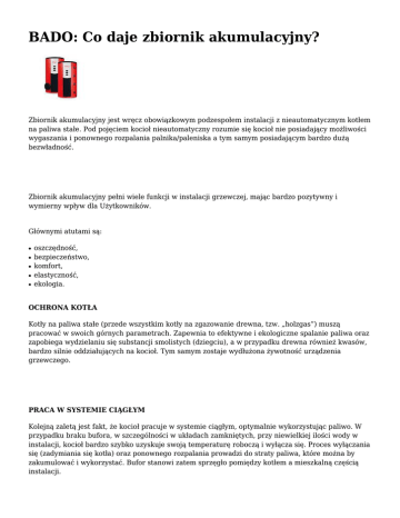 BADO: Co daje zbiornik akumulacyjny? Zbiornik akumulacyjny jest wręcz obowiązkowym podzespołem instalacji z nieautomatycznym kotłem na paliwa stałe. Pod pojęciem kocioł nieautomatyczny rozumie się kocioł nie posiadający możliwości wygaszania i ponownego rozpalania palnika/paleniska a tym samym posiadającym bardzo dużą bezwładność. Zbiornik akumulacyjny pełni wiele funkcji w instalacji grzewczej, mając bardzo pozytywny i wymierny wpływ dla Użytkowników. Głównymi atutami są: ● ● ● ● ● oszczędność, bezpieczeństwo, komfort, elastyczność, ekologia. OCHRONA KOTŁA Kotły na paliwa stałe (przede wszystkim kotły na zgazowanie drewna, tzw. „holzgas”) muszą pracować w swoich górnych parametrach. Zapewnia to efektywne i ekologiczne spalanie paliwa oraz zapobiega wydzielaniu się substancji smolistych (dziegciu), a w przypadku drewna również kwasów, bardzo silnie oddziałujących na kocioł. Tym samym zostaje wydłużona żywotność urządzenia grzewczego. PRACA W SYSTEMIE CIĄGŁYM Kolejną zaletą jest fakt, że kocioł pracuje w systemie ciągłym, optymalnie wykorzystując paliwo. W przypadku braku bufora, w szczególności w układach zamkniętych, przy niewielkiej ilości wody w instalacji, kocioł bardzo szybko uzyskuje swoją temperaturę roboczą i wyłącza się. Proces wyłączania się (zadymiania się kotła) oraz ponownego rozpalania prowadzi do straty paliwa, które można by zakumulować i wykorzystać. Bufor stanowi zatem sprzęgło pomiędzy kotłem a mieszkalną częścią instalacji. BRAK PRĄDU W przypadku braku prądu a tym samym braku odbioru ciepła z kotła istnieje realne zagrożenie zagotowaniem się wody w urządzeniu. Nowoczesne kotły CO posiadają wbudowaną w wymiennik spiralę chłodzącą. Wszystkie kotły montowane po 12.06.2009 roku w układach zamkniętych musza wręcz takową posiadać. W przypadku przegrzania, kocioł zostanie jednak schłodzony, a ciepło wraz z wodą wylane do kanalizacji. W przypadku bufora ciepło zostanie zakumulowane w zbiorniku i oddane do instalacji, kiedy tylko ruszy pompa obiegowa. Dodatkowo po włączeniu prądu, instalacja zacznie działać w kilka minut, gdyż nie jest konieczne rozpalanie kotła - energia jest przecież zakumulowana w buforze. W przypadku jego braku, Użytkownik najpierw musi rozpalić kocioł, nagrzać całą instalację aby wreszcie ciepło pojawiło się w mieszkaniu. CIEPŁO O PORANKU Kolejną zaletą poprawnie dobranego zbiornika akumulacyjnego jest dostępność ciepła w mieszkaniu już we wczesnych godzinach porannych, bez konieczności wychodzenia z łóżka i rozpalania kotła. Inteligentne sterowanie rozpocznie rozładowywanie bufora nad ranem, a bufor zostanie ponownie naładowany, kiedy Użytkownicy będą juz "na nogach". C.W.U. Dodatkowo w przypadku posiadania zbiornika akumulacyjnego z przepływową wężownicą c.w.u., nie ma potrzeby kupowania oraz instalowania bojlera na ciepłą wodę. Rozwiązanie to gwarantuje oszczędność miejsca, pieniędzy oraz zapewnia większe bezpieczeństwo i ochronę zdrowia dla domowników przed bakteriami typu legionella. WIELE WYTWORNIKÓW CIEPŁA Ostatnią zaletą, o której należy wspomnieć jest możliwość połączenia wielu różnych wytworników ciepła - w szczególności kotła na paliwa stałe z instalacją solarną. KONTAKT BADO E-mail: [email protected] WWW: www.bado.com.pl Tel.: 0-32 728 13 28