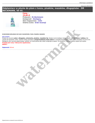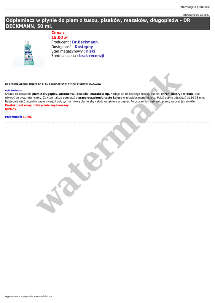 Informacje o produkcie Utworzono 09-03-2017 Odplamiacz w płynie do plam z tuszu, pisaków, mazaków, długopisów - DR BECKMANN, 50 ml. Cena : 15,00 zł Producent : Dr.Beckmann Dostępność : Dostępny Stan magazynowy : niski Średnia ocena : brak recenzji er m ar k DR.BECKMANN ODPLAMIACZ DO PLAM Z DŁUGOPISÓW, TUSZU, PISAKÓW, MAZAKÓW Opis Produktu: Środek do usuwania plam z długopisu, atramentu, pisaków, mazaków itp. Nadaje się do każdego rodzaju tkanin, chroni kolory i włókna. Nie używać do dywanów i skóry. Zawsze należy pamiętać o przeprowadzeniu testu koloru w niewidocznym miejscu. Polać plamę odczekać ok.10-15 min. Następnie użyć ręcznika papierowego i położyć na mokrą plamę aby całość wsiąknęła w papier. Po osuszeniu i zebraniu plamy wyprać jak zwykle. Produkt jest nowy i fabrycznie zapakowany. NIEMCY w at Pojemność: 50 ml. Wygenerowano w programie www.oscGold.com