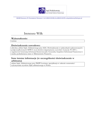 00-030 Warszawa, Pl. Powstańców Warszawy 1, tel. (022) 26 24 054, fax (022) 26 24 074, [email protected] Ireneusz Wilk Wykształcenie: wyższe Doświadczenie zawodowe: adwokat, arbiter Sądu Arbitrażowego przy KIG. Doświadczenie w jednostkach nadzorowanych i podporządkowanych MSWiA m.in dyrektor departamentu zezwoleń i koncesji. W 2001 r. organizował instytucję informacji finansowej jako Generalny Inspektor Informacji Finansowej w randze podsekretarza stanu w Ministerstwie Finansów. Inne istotne informacje (w szczególności doświadczenie w arbitrażu) arbiter Sądu Arbitrażowego przy PKPP Lewiatan, specjalizacja w zakresie uznawania i wykonywania wyroków Sądu arbitrażowego w Polsce