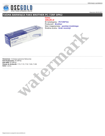 Informacje o produkcie Utworzono 09-03-2017 TAŚMA BARWIĄCA FAKS BROTHER PC-72RF OPK2 Cena : 109,05 zł er m ar k Nr katalogowy : PC72RFYJ1 Producent : Brother Stan magazynowy : poniżej średniego Średnia ocena : brak recenzji w at Gwarancja: 3 miesiące gwarancji fabrycznej Kod Producenta: PC72RFYJ1 Kod OEM: PC72RFYJ1 Pasuje do drukarek:: T-72, T-74, T-76, T-104, T-106 Kolor: czarny Wygenerowano w programie www.oscGold.com