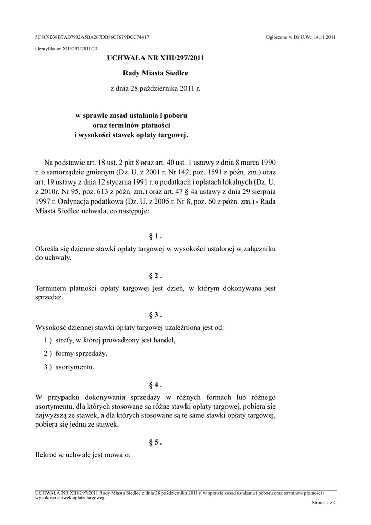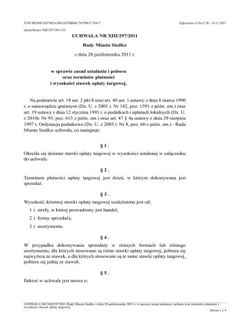 5C8C9B38B7AD7902A5BA267DB86C7679DCC74417 Ogłoszono w Dz.U.W.: 14.11.2011 identyfikator XIII/297/2011/23 UCHWAŁA NR XIII/297/2011 Rady Miasta Siedlce z dnia 28 października 2011 r. w sprawie zasad ustalania i poboru oraz terminów płatności i wysokości stawek opłaty targowej. Na podstawie art. 18 ust. 2 pkt 8 oraz art. 40 ust. 1 ustawy z dnia 8 marca 1990 r. o samorządzie gminnym (Dz. U. z 2001 r. Nr 142, poz. 1591 z późn. zm.) oraz art. 19 ustawy z dnia 12 stycznia 1991 r. o podatkach i opłatach lokalnych (Dz. U. z 2010r. Nr 95, poz. 613 z późn. zm.) oraz art. 47 § 4a ustawy z dnia 29 sierpnia 1997 r. Ordynacja podatkowa (Dz. U. z 2005 r. Nr 8, poz. 60 z późn. zm.) - Rada Miasta Siedlce uchwala, co następuje: §1. Określa się dzienne stawki opłaty targowej w wysokości ustalonej w załączniku do uchwały. §2. Terminem płatności opłaty targowej jest dzień, w którym dokonywana jest sprzedaż. §3. Wysokość dziennej stawki opłaty targowej uzależniona jest od: 1 ) strefy, w której prowadzony jest handel, 2 ) formy sprzedaży, 3 ) asortymentu. §4. W przypadku dokonywania sprzedaży w różnych formach lub różnego asortymentu, dla których stosowane są różne stawki opłaty targowej, pobiera się najwyższą ze stawek, a dla których stosowane są te same stawki opłaty targowej, pobiera się jedną ze stawek. §5. Ilekroć w uchwale jest mowa o: _________________________________________________________________________________________________________________________ UCHWAŁA NR XIII/297/2011 Rady Miasta Siedlce z dnia 28 października 2011 r. w sprawie zasad ustalania i poboru oraz terminów płatności i wysokości stawek opłaty targowej. Strona 1 z 4 5C8C9B38B7AD7902A5BA267DB86C7679DCC74417 Ogłoszono w Dz.U.W.: 14.11.2011 1 ) sprzedaży ze stałych stoisk handlowych - rozumie się przez to sprzedaż prowadzoną w obiektach budowlanych lub ich częściach oraz w tymczasowych obiektach budowlanych lub w ich częściach, z wyłączeniem budynków i budynków mieszkalnych jednorodzinnych lub ich części, w rozumieniu przepisów prawa budowlanego, 2 ) sprzedaży z ruchomych stoisk handlowych - rozumie się przez to sprzedaż prowadzoną ze stoisk, które mogą być codziennie usuwane po zakończeniu działalności, 3 ) sprzedaży z pojazdu lub z zespołu pojazdów - rozumie się przez to sprzedaż prowadzoną z wszelkiego rodzaju i typu pojazdów lub zespołów pojazdów, w rozumieniu przepisów prawa o ruchu drogowym, 4 ) miejscach wyznaczonych - rozumie się przez to targowiska komunalne oraz targowiska prywatne, których właściciele zawarli z Miastem Siedlce umowę na prowadzenie targowiska i pobór inkasa oraz miejsca organizacji imprez określonych w § 7. 5 ) handlu prowadzonym poza miejscami wyznaczonymi – rozumie się przez to wszelką sprzedaż prowadzoną poza miejscami określonymi w pkt 4 oraz poza budynkami lub ich częściami. §6. Ustala się podział Miasta Siedlce na strefy: 1 ) strefa I – targowiska położone w obszarze ograniczonym ulicami Floriańska, 3 Maja, Wojska Polskiego, Józefa Piłsudskiego, 10 Lutego, Cmentarna, bp Ignacego Świrskiego, Tadeusza Kościuszki, z zastrzeżeniem pkt 2), 2 ) strefa Ia – handel prowadzony poza miejscami wyznaczonymi w obszarze ograniczonym ulicami Floriańska, 3 Maja, Wojska Polskiego, Józefa Piłsudskiego, 10 Lutego, Cmentarna, bp Ignacego Świrskiego, Tadeusza Kościuszki, 3 ) strefa II – targowiska położone na pozostałym obszarze Miasta Siedlce, z zastrzeżeniem pkt 4), 4 ) zestrefa IIa - handel prowadzony poza miejscami wyznaczonymi na pozostałym obszarze Miasta Siedlce, _________________________________________________________________________________________________________________________ UCHWAŁA NR XIII/297/2011 Rady Miasta Siedlce z dnia 28 października 2011 r. w sprawie zasad ustalania i poboru oraz terminów płatności i wysokości stawek opłaty targowej. Strona 2 z 4 5C8C9B38B7AD7902A5BA267DB86C7679DCC74417 Ogłoszono w Dz.U.W.: 14.11.2011 §7. Zwalnia się z opłaty targowej sprzedaż dokonywaną na imprezach o charakterze charytatywnym lub promujących miasto i jego kulturę, kulturę fizyczną, sport, zdrowie i edukację, idee samorządności oraz Unię Europejską, a także na festynach organizowanych na terenach stanowiących własność Miasta Siedlce, pod warunkiem, że z tytułu ich zajęcia na sprzedaż organizatorzy uiścili na rzecz Miasta Siedlce opłatę z tytułu dzierżawy - przez okres nie dłuższy niż 7 dni. §8. Zarządza się pobór opłaty targowej w drodze inkasa. §9. 1 ) Terminem płatności dla inkasentów opłaty targowej jest 7 dzień miesiąca następującego po miesiącu, w którym opłata targowa została pobrana przez inkasenta. 2 ) Inkasenci wpłacają pobraną opłatę targową na rachunek Urzędu Miasta Siedlce lub w kasie Urzędu Miasta Siedlce. § 10 . Na inkasentów do poboru opłaty targowej wyznacza się: Regionalna Izba Obrachunkowa Uchwałą Nr XIII/297/2011 z dnia 28.10.2011 orzekła o nieważności paragrafu 10. 1 ) zarządzających targowiskami stanowiącymi własność komunalną, 2 ) właścicieli targowisk, którzy wyrazili zgodę na pobór inkasa na targowiskach stanowiących własność prywatną, 3 ) Przedsiębiorstwo Handlowo - Usługowe PA-KO S.C. Kozioł Bogusław, Partyka Władysława, ul. 11 Listopada 42, 08 - 110 Siedlce podczas kiermaszy, jarmarków, targów, aukcji i wystaw, na targowiskach prywatnych, w stosunku do których właściciele nie wyrazili zgody na bycie inkasentami na targowisku stanowiącym ich własność oraz handlu poza miejscami wyznaczonymi, z zastrzeżeniem § 7. § 11 . Ustala się miesięczne wynagrodzenie za inkaso: 1 ) w przypadku targowisk stanowiących własność komunalną - 60% wpływów (brutto) z tytułu opłaty targowej, z tym że dla targowicy zwierzęcej przy ul. Targowej 25% wpływów (brutto), _____________________________________________________________________________________