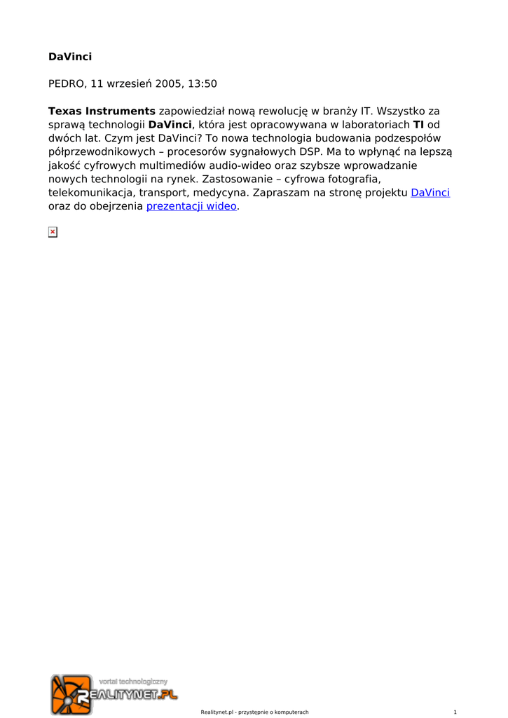 DaVinci PEDRO, 11 wrzesień 2005, 13:50 Texas Instruments zapowiedział nową rewolucję w branży IT. Wszystko za sprawą technologii DaVinci, która jest opracowywana w laboratoriach TI od dwóch lat. Czym jest DaVinci? To nowa technologia budowania podzespołów półprzewodnikowych – procesorów sygnałowych DSP. Ma to wpłynąć na lepszą jakość cyfrowych multimediów audio-wideo oraz szybsze wprowadzanie nowych technologii na rynek. Zastosowanie – cyfrowa fotografia, telekomunikacja, transport, medycyna. Zapraszam na stronę projektu DaVinci oraz do obejrzenia prezentacji wideo. Realitynet.pl - przystępnie o komputerach 1
