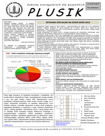 Szkolny nieregularnik dla wszystkich PLUSIK Dzień dobry, dzisiejsze wydanie „Plusika” to wydanie specjalne – ekologiczne. Pojawia się już od kilku lat z okazji Dnia Ziemi. W tym roku główną, przewodnią myślą obchodów Dnia Ziemi jest energia odnawialna. Dlatego też zamieszczamy dziś materiały z wiadomościami wyszperanymi w Internecie, a związanymi z tymże tematem. Naszym własnym „wkładem” w dzisiejsze wydanie są krzyżówki ekologiczne dotyczące pojęć związanych z energią odnawialną. Poszalała sobie klasa VC. Życzę Wam miłej lektury. Jolanta Makuch PS Nagrodę za rozwiązanie krzyżówek świątecznych – czekoladowego zająca – wylosował Paweł Ladowski z klasy IV C. Nr 5/2014/2015 Rok siedemnasty WYDANIE SPECJALNE NA DZIEŃ ZIEMI 2015 Odnawialne źródła energii to takie, których wykorzystywanie nie wiąże się z ich całkowitym zanikiem, brakiem, ponieważ ich zasób odnawia się w krótkim czasie lub w ogóle się nie wyczerpuje. Takimi źródłami są: wiatr, promieniowanie słoneczne, fale morskie, energia ciepła wnętrza ziemi – energia geotermalna. Energii odnawialnej nie należy mylić z energią przyjazną dla środowiska naturalnego, gdyż instalacje do jej produkcji mogą (choć nie muszą) powodować szkody ekologiczne. Odnawialne źródła energii w 2013 roku zaspokajały 8,9% zapotrzebowania ludzkości na energię. Uwzględniając dodatkowo ok. 9% użycia przez tradycyjne opalanie drewnem i innego typu biomasą, wskaźnik ten wyniósł ok. 19%. Od początku XXI wieku rosną światowe inwestycje w odnawialne źródła energii. Przeciwieństwem odnawialnych są nieodnawialne źródła energii, czyli takie , których zasoby odtwarzają się bardzo powoli bądź wcale: ropa naftowa, węgiel, gaz ziemny i pierwiastki promieniotwórcze np. uran. Ok. 81% energii dla ludzkości pochodzi ze spalania paliw kopalnych. Powoduje to zanieczyszczenie środowiska, globalne ocieplenie, wyczerpywanie się zasobów. W Polsce odnawialne źródła energii zaspokajają około 4,2% zapotrzebowania na energię. Głównymi źródłami są: biomasa (2%), m. in. drewno /w tym pelety, zrębki, wióry, słoma, biogaz, biopaliwa, wiatr (1,4%) oraz hydroenergetyka czyli elektrownie wodne (0,6%). Dzisiaj zużywamy znacznie więcej energii niż jeszcze sto lat temu. Spalamy więc o wiele więcej węgla, gazu i ropy niż kiedykolwiek dotąd. A dziś wiemy już, że pewnego dnia złoża tych surowców się skończą. Jeśli nie ograniczymy ich wydobycia, może stać się to nawet już za kilkadziesiąt lat. Oszczędzanie energii stało się więc obowiązkiem każdego mieszkańca Ziemi. Pięć złotych zasad oszczędzania energii elektrycznej: WYMIEŃ ŻARÓWKI NA ENERGOOSZCZĘDNE Zużywają 5 krotnie mniej energii i są trwalsze niż zwykłe. Wymiana żarówki żarowej na świetlówkę energooszczędną pozwala zaoszczędzić 80% energii. GAŚ NIEPOTRZEBNE ŚWIATŁO Tam gdzie Cię nie ma, nie musi być jasno. UŻYWAJ SPRZĘTU AGD MĄDRZE Lodówkę ustaw z dala od źródeł ciepła, z możliwością wentylacji, nie wkładaj do niej nic gorącego. Zmywarkę i pralkę włączaj gdy są pełne. ZMIEŃ SPRZĘT AGD NA EKONOMICZNY Nowoczesne lodówki zużywają 4 razy mniej energii niż modele sprzed 30 lat. WYŁACZAJ NIEUŻYWANE URZĄDZENIA Komputery, ładowarki, drukarki telewizory czy radia marnują mnóstwo energii w trybie czuwania. Wyłączanie trybu czuwania urządzeń (tzw. stand by). Wiele urządzeń pochłania więcej prądu w trybie czuwania , niż kiedy z nich rzeczywiście korzystamy. Dużą wagę zwracamy na świadome korzystanie z oświetlenia. Już ponad połowa mieszkańców Polski, oszczędzających energię pamięta o tym, aby gasić światło. Prawie 40% ankietowanych używa świetlówek energooszczędnych. RWE zwraca również uwagę, że w Polsce racjonalniej korzystamy ze sprzętów elektrycznych 31% Polaków wyłącza z gniazdka nieużywane w danej chwili urządzenia. Najczęściej pamiętamy o wyłączaniu z trybu czuwania telewizorów (82%), rzadziej laptopów i komputerów (52%.). Wciąż jednak tylko co dziesiąty Polak oszczędza energię elektryczną inwestując w energooszczędne urządzenia. Wśród posiadaczy określonych kategorii sprzętów, największą popularnością są stosunkowo nowe, energooszczędne: telewizory (68%), pralki (65%), laptopy (49%) oraz czajniki (49%). Zdecydowanie mniejszą popularnością cieszą się natomiast energooszczędne: zmywarki oraz kuchenki elektryczne. WWW.rwe.pl 1 2 3 4 5 6 7 Wiadomości pochodzą ze stron: WWW.optimalenergy.pl WWW.ekologia.pl 1. Od niej mleko 2. Gaz z biomasy 3. Kwiat o czerwonych płatkach 4. Pomieszczenie lwa w Zoo 5. Mała trawa 6. Zwierzę leśne 7. Okrywa ciało Patrycja Skrobas, Wika Góźdź, Ola Boras, Klaudia Matyjaszek, VC Plusik, szkolny nieregularnik dla wszystkich, nr 5/2014/2015, 23 IV 2015 r. KRZYŻÓWKI EKOLOGICZNE VC 1 1 1 2 2 3 3 4 4 5 5 6 2 3 4 5 6 6 7 7 7 1. Nocny wypoczynek 2. Typ antylopy 3. W tabletkach lub w zastrzykach 4. Lód na rzece 5. Był nim Shrek 6. Rude zwierzę 7. Dumny ptak Michał Gruszka, VC 1. 2. 3. 4. Pustynna jaszczurka Inaczej przyroda Ten, kto dba o przyrodę Można do niego wpaść przy drodze 5. Młody lasek 6. Jeden z wielu na farmie wiatrowej 7. Popularna nazwa robinii Olga Jagła-Izdebska, VC 1 1. Umożliwia odbiór programów TV 2. Do sprawdzania daty 3. Naprawia kontakty 4. To co nas otacza 5. Pozyskiwany z odpadów 6. Nasza planeta 7. Produkuje czystą energię Małgosia Mendel, VC 1 2 2 3 3 1 2 5 5 3 6 6 4 1. Drzewo liściaste 2. Dawny młyn 3. Drzewo iglaste 4. Uprawiamy tam warzywa 5. Tamuje wodę 6. Zmagazynowane towary Chiara Anania, Magda Palik, VC 7 5 1. Np. dąb, sosna, lipa 2. Do kąpieli 3. Może być kiszony 4. Przetwarza energię wiatru 5. Gaz pozyskiwany z odpadów 6. Część silnika 7. Wakacyjna pora Klaudia Widz, Kasia Kolasa, VC 6 7 1. 2. 3. 4. 5. 6. 7. 4 4 Naprawia prąd Roślina o wielu zastosowaniach Ciek wod