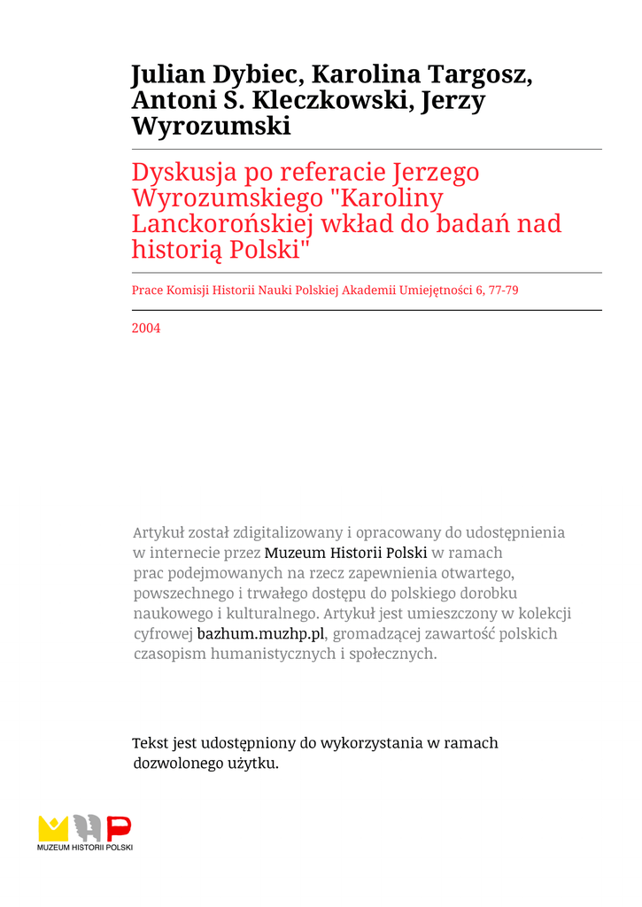 Julian Dybiec, Karolina Targosz, Antoni S. Kleczkowski, Jerzy Wyrozumski Dyskusja po referacie Jerzego Wyrozumskiego "Karoliny Lanckorońskiej wkład do badań nad historią Polski" Prace Komisji Historii Nauki Polskiej Akademii Umiejętności 6, 77-79 2004 Karoliny Lanckorońskiej wkład do badań nad historią Polski 77 zastosowanie języka angielskiego. W ydawnictwo akt Nuncjatury Apostol skiej w Polsce wraca więc w całości do PAU. Fundacja Lanckorońskich będzie je finansować. Nawiązujemy nie do naszych dawnych około 1000stronicowych tomów, ale kontynuujemy i będziemy kontynuować spójny i przejrzysty program, z formą edytorską włącznie, O. Henryka Damiana Wojtyski. Karolina Lanckorońska mówiła do mnie parokrotnie, że jej Institutům Historicum Romae była to namiastka pozbawionej możliwości działania PAU. Niezupełnie tak było, skoro Instytut powstał w 1945 r., kiedy PAU właśnie podnosiła się z wojennego upadku. W pewnym sensie miała przecież rację. To AU i PAU wykazała wielką troskę o stworzenie bazy materiałowej dla badań nad naszą przeszłością, inaczej mówiąc - o wy dawnictwa źródłowe. Bez tego wysiłku nasza historiografia tkwiłaby gdzieś na poziomie infantylizmu naukowego. W tym zakresie sama Karolina Lanckorońska i jej Instytut są rzeczywiście kontynuatorami idei naszej Akademii. Z kolei PAU podjęła kontynuację dorobku Instytutu i tu krąg troski o humanistykę polską szczęśliwie się zamyka. W artykule Trzecia droga Karli Lech Kalinowski przytoczył słowa Karoliny Lanckorońskiej, które wypowiedziała przy okazji wręczenia jej W ielkiego Krzyża Orderu Odrodzenia Polski: „Komu raz Parki złożyły ideał życiowy do kołyski, ten już do końca bez tego ideału żyć nie potrafi. Moją ziemską boginią jest nauka polska"15. Jest to najlepsza syntetyczna charakterystyka Karoliny Lanckorońskiej i jej bogatej działalności na polu nauki. D yskusja po referacie Jerzego W yrozum skiego: Karoliny Lanckorońskiej wkład do badań nad historią Polski Julian Dybiec: Pan Profesor W yrozumski podkreślił, że wydawnictwa źródłowe Karo liny Lanckorońskiej są największymi dotychczas opracowaniami tego typu. Chciałbym dodać, że były to również wydawnictwa bardzo wyczekiwane przez Polaków. Należy przypomnieć wysiłki z przełomu XVIII i XIX w. Albertrandiego, który jeździł po Europie, po Włoszech, Francji i zbierał materiały do takiego wydawnictwa. Potem Towarzystwo Historyczno-Li terackie w Paryżu i emigranci, którzy wokół niego się skupili, kopiowali 15 L. Kalinowski, Trzecia droga Karli, „Tygodnik Powszechny" 1996, nr 38, s. 8. Wypowiedź tę przypomniała T. Chynczewska-Hennel, Profesor Karolina Lanckorońska. Jubileusz 100 lat urodzin, [w:] Barok. Historia - Literatura - Sztuka, V /2 (10), 1998, s. 11-16. 78 JERZY WYROZUMSKI w sposób dość dyletancki i chałupniczy różne akta w Londynie i Paryżu po to, aby je zachować i kiedyś wydać. Wreszcie relacje nuncjuszów spisywał też Rykaczewski. Później podejmowała takie wysiłki Akademia Umiejętności, ale dysponowała małymi środkami na ten cel. Dopiero Karolinie Lanckorońskiej udało się na wielką skalę uruchomić to wydaw nictwo, wyprzedzając tym wiele państw, np. Rosję, która po udostępnieniu archiwów watykańskich zorganizowała ekspedycję, ale jednak tak dużo materiałów nie wydała. Ta seria dotycząca nuncjatur jest bardzo interesująca i czyta się ją jak literackie opracowanie, czasem niemal jak powieść kryminalną. Jeden z nuncjuszy pisze w swej relacji, jak po przyjeździe do Polski chciał złożyć wizytę prymasowi, ten jednakże go nie przyjął wyjaśniając, że jest chory. Tymczasem po przybyciu nuncjusza do pałacu biskupiego okazało się, że prymas w najlepsze ucztuje. Był on pogniewany na W atykan i nie chciał z nuncjuszem rozmawiać, a w pałacu lokuje go w jakiejś niemal służ bówce, tak że nuncjusz m usi szukać mieszkania na mieście. To są nie tylko niezwykle ważne dla historii i kultury Polski źródła, ale też materiały bardzo ciekawe. Moim zdaniem ta seria źródeł dotycząca nuncjatur jest najwartościowsza. „Antem urale" było właściwie czasopismem, które miało o historii Polski - ale nie tylko Polski - inform ow ać w językach międzynarodowych. Prace tam zamieszczane były bardzo zróżnicowane, były na przykład materiały dotyczące stosunków polsko-francuskich z okresu powstania styczniowego, ale też ukazywały się tylko kom pilacje prac polskich publikowane w ję zykach obcych. Pod tym względem ta seria była bardzo wartościowa. Podkreślił Pan Profesor w pływ ojca na działalność historyczną Karoliny Lanckorońskiej. W ydaje mi się, że wpływ ten był szczególnie duży w pra cach pani Karoliny z historii sztuki. Przed laty czytałem opublikowane zapiski Lanckorońskiego z podróży i oglądania zabytków sztuki w połu dniowej Franqi i północnych W łoszech. Gdy czyta się prace pani Karoliny z historii sztuki, to wyraźnie w nich widać wpływ ojca na jej spojrzenie na zabytki sztuki. Należy jeszcze podkreślić, że takie wydawnictwa źródłowe zwykle wydawane były przez państw a, np. przez Francję na początku XX w., tymczasem tutaj takie m onum entalne wydawnictwa podjęte zostały przez indywidualnego mecenasa. Pierwszy raz zetknąłem się z panią Lanckorońską przed około 10 laty dzięki tej audycji radiowej, w której relacjonowała o swych kontaktach z Krügerem. Krüger nie przypuszczał, że ona przeżyje i jako osobie już właściwie martwej opow iadał o zamordowaniu profesorów we Lwowie. W tym wywiadzie radiow ym opowiadała o tym więcej, niż potem zamie ściła we wspomnieniach. Karoliny Lanckorońskiej wkład do badań nad historią Polski 79 Karolina Targosz: Uważam, że referat Pana Profesora winien być opublikowany, bo daje bardzo ważne podsumowanie prac podejmowanych przez Karolinę Lanckorońską. Ja nie miał