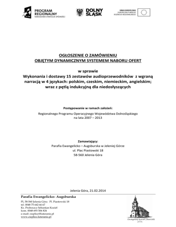 OGŁOSZENIE O ZAMÓWIENIU OBJĘTYM DYNAMICZNYM SYSTEMEM NABORU OFERT w sprawie Wykonania i dostawy 15 zestawów audioprzewodników z wgraną narracją w 4 językach: polskim, czeskim, niemieckim, angielskim; wraz z pętlą indukcyjną dla niedosłyszących Postępowanie w ramach założeń: Regionalnego Programu Operacyjnego Województwa Dolnośląskiego na lata 2007 – 2013 Zamawiający: Parafia Ewangelicko – Augsburska w Jeleniej Górze ul. Plac Piastowski 18 58-560 Jelenia Góra Jelenia Góra, 21.02.2014 Parafia Ewangelicko- Augsburska PL 58-560 Jelenia Góra Pl. Piastowski 18 tel. 0048 75 642 66 67 Ks. Proboszcz Sebastian Kozieł kom. 0048 693 506 824 e-mail: [email protected] www.cieplice.luteranie.pl Ewangelicki Kościół Zbawiciela 1777r. I. Część ogólna 1. Zamawiający: a. Nazwa i adres Beneficjenta/Zamawiającego: Parafia Ewangelicko – Augsburska w Jeleniej Górze ul. Plac Piastowski 18 58-560 Jelenia Góra tel./fax.: 75 7510106 email: [email protected] b. Osoba upoważniona do kontaktu w sprawie zamówienia: Ksiądz Sebastian Kozieł - Proboszcz 2. Projekt: a. Tytuł realizowanego projektu: „Uatrakcyjnienie turystyczne uzdrowiska Cieplice poprzez renowację XVIII – wiecznego zespołu obiektów parafii Ewangelicko – Augsburskiej w Jeleniej Górze”, b. Numer projektu: RPDS.06.01.00-02-009/13, c. Wartość projektu: 2 510 962,22 zł, w tym kwota dofinansowania 1 575 011,43 zł d. Okres realizacji projektu: IV kwartał 2010 – IV kwartał 2014, e. Projekt współfinansowany jest ze środków Unii Europejskiej – Europejskiego Funduszu Rozwoju Regionalnego, Regionalnego Programu Operacyjnego dla Województwa Dolnośląskiego na lata 2007-2013 (RPO WD). II. Specyfikacja zamówienia 1. Opis przedmiotu zamówienia: - - a. dostawa 12 sztuk audio przewodników o następujących parametrach minimalnych: wytrzymała obudowa z utwardzanego ABS, odporna na upadki i udary wbudowana pamięć o pojemności zapewniającej możliwość wgrania minimum 20 godzin nagrań obsługa wielu języków odtwarzanie skompresowanych plików dźwiękowych wbudowany głośniczek wysokiej jakości ergonomiczna budowa umożliwiająca wygodny odsłuch z wbudowanego głośniczka podczas długotrwałego zwiedzania (bez konieczności podnoszenia ramienia ręki). łącze typu Jack 3,5mm do podpięcia pętli indukcyjnej lub słuchawek smycz do powieszenia na szyi klawiatura: odporna na zalanie i zanieczyszczenie (nie dopuszcza się klawiatur dotykowych), funkcje: wybór języka, wybór eksponatu (0-9), regulacja poziomu głośności, odtwarzanie/pauza. Klawisze funkcyjne o wymiarach nie mniejszych niż 10mm x 10mm, czytelne opisy klawiszy numerycznych (czcionka o wielkości 20-22 pkt.). sygnalizacja niskiego poziomu baterii i odtwarzania plików Parafia Ewangelicko- Augsburska PL 58-560 Jelenia Góra Pl. Piastowski 18 tel. 0048 75 642 66 67 Ks. Proboszcz Sebastian Kozieł kom. 0048 693 506 824 e-mail: [email protected] www.cieplice.luteranie.pl Ewangelicki Kościół Zbawiciela 1777r. - - zasilanie: 2 x baterie AA z utrudnionym dostępem przez użytkownika (blokada komory baterii). Audio przewodnik powinien charakteryzować się niskim poborem prądu zapewniającym możliwość odsłuchania minimum 250 godzin nagrań bez konieczności wymiany baterii. w zestawie z urządzeniem trzy komplety baterii alkaicznych AA (w tym jeden zamontowany w audio przewodniku) brak zewnętrznych, łatwo dostępnych łącz programowania i ładowania brak możliwości łatwego skopiowania danych z audio przewodników. - b. dostawa 3 sztuk audio przewodników o następujących parametrach minimalnych: wytrzymała obudowa z utwardzanego ABS, odporna na upadki i udary wbudowana pamięć o pojemności zapewniającej możliwość wgrania minimum 20 godzin nagrań obsługa wielu języków odtwarzanie skompresowanych plików dźwiękowych wbudowany głośniczek wysokiej jakości ergonomiczna budowa umożliwiająca wygodny odsłuch z wbudowanego głośniczka podczas długotrwałego zwiedzania (bez konieczności podnoszenia ramienia ręki). łącze typu Jack 3,5mm do podpięcia pętli indukcyjnej lub słuchawek smycz do powieszenia na szyi klawiatura: odporna na zalanie i zanieczyszczenie (nie dopuszcza się klawiatur dotykowych), funkcje: wybór języka, wybór eksponatu (0-9), regulacja poziomu głośności, odtwarzanie/pauza. Klawiatura przystosowana dla osób niedowidzących. Klawisze funkcyjne o wymiarach nie mniejszych niż 10mm x 10mm, opisy klawiszy numerycznych (0-9) w kontrastowych kolorach (czarne opisy na żółtym tle), duże cyfry (czcionka o wielkości 20-22 pkt.) wytłoczenie na klawiszu z numerem „5”. sygnalizacja niskiego poziomu baterii i odtwarzania plików zasilanie: 2 x baterie AA z utrudnionym dostępem przez użytkownika (blokada komory baterii). Audio przewodnik powinien charakteryzować się niskim poborem prądu zapewniającym możliwość odsłuchania minimum 250 godzin nagrań bez konieczności wymiany baterii. w zestawie z urządzeniem trzy komplety baterii alkaicznych AA (w tym jeden zamontowany w audio przewodniku) brak zewnętrznych, łatwo dostępnych łącz programowania i ładowania brak możliwości łatwego skopiowania danych z audio przewodników. - c. dostawa 1 sztuk pętli indukcyjnych dla niedosłyszących o następujących parametrach: przystosowana do wygodnego noszenia na szyi złącze typu jack 3,5 mm - - - d. wykonanie nagrań lektorskich na podstawie dostarczonych przez zamawiającego materiałów opracowanych w językach polskim, czeskim, angielskim, niemieckim. Nagrania powinny być wykonane w studiu nagraniowym z udziałem profesjonalnych lektorów native speaker. Przewidywany czas nagrań 17 minut w każdym języku. Parafia Ewangelicko- Augsburska PL 58-560 Jelenia Góra Pl. Piastowski 18 tel. 0048 75 642 66 67 Ks. Proboszcz Sebastian Kozieł kom. 0048 693 506 824 e-mail: [email protected] www.cieplice.luteranie.pl Ewangelicki Kościół Zbawiciela 1777r. Wykonawca powinie