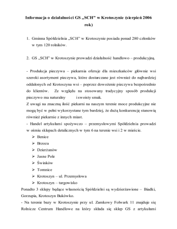 Informacja o działalności GS „SCH” w Krotoszynie (sierpień 2006 rok) 1. Gminna Spółdzielnia „SCH” w Krotoszynie pos iada ponad 280 członków w tym 120 rolników. 2. GS „SCH” w Krotoszynie prowadzi działalność handlowo – produkcyjną. - Produkcja pieczywa – piekarnia oferuje dla mieszkańców głównie wsi szeroki asortyment pieczywa, które dostarczane jest również do najbardziej oddalonych od Krotoszyna wsi – poprzez dowożenie pieczywa bezpośrednio do klientów. Ze względu na stosowany tradycyjny sposób produkcji pieczywo ma naturalny i swoisty smak. Z uwagi na znaczną ilość piekarni na naszym terenie moce produkcyjne nie mogą być w pełni wykorzystane tym bardziej, że dużą konkurencję stanowią również piekarnie z innych miast. - Handel artykułami spożywczo – przemysłowymi Spółdzielnia prowadzi w ośmiu sklepach detalicznych w tym 6 na terenie wsi i 2 w mieście. Benice Brzoza Dzierżanów Jasne Pole Świnków Tomnice Krotoszyn – ul. Przemysłowa Krotoszyn – targowisko Ponadto 3 sklepy będące własnością Spółdzielni są wydzierżawione – Biadki, Gorzupia, Krotoszyn Bukówko. - Na terenie bazy w Krotoszynie przy ul. Zamkowy Folwark 11 znajduje się Rolnicze Centrum Handlowe na który składa się sklep GS z artykułami metalowo – technicznymi, koncentratami, dodatkami paszowymi, sprzętem ogrodniczym. Sklep Agromy z Wrocławia w którym sprzedawane są części do maszyn i maszyny oraz nowo otwarty sklep ze środkami ochrony roślin firmy Blending ze Zdun. - Gminna Spółdzielnia jest właścicielem dwóch baz obrotu rolnego w Krotoszynie i Orpiszewie. Baza w Orpiszewie od 2002 roku jest wydzierżawiona firmie „Remek” a baza w Krotoszynie została wydzierżawiona w lipcu 2006 roku firmie Blending ze Zdun. W wydzierżawionych bazach dzierżawcy prowadzą tą samą działalność co prowadziła Spółdzielnia. Rolnicy oraz mieszkańcy wsi i nie tylko mogą zaopatrzyć się w nawozy mineralne, pasze treściwe, materiały budowlane, opał a także sprzedać złom. W bieżącym roku Spółdzielnia prowadziła skup rzepaku skupiono 928,05 ton. Skup prowadzony był do Zakładów Tłuszczowych w Szamotułach. Rzepak jest dość dobrej jakości a plon oceniamy na ok. 30 g/ha. Kontraktację i sprzedaż nasion pod zbiory 2007 roku prowadzi firma Blending dla WZT ADM Szamotuły. W lipcu 2005 roku GS „SCH” Krotoszyn powołała do życia Krotoszyńską Spółdzielnię Producentów Wołowiny „Krot – Agro” jako grupę żywca wołowego. Grupa na dzień dzis iejszy jest grupą formalnie zarejestrowaną przez Urząd Marszałkowski w Poznaniu. Grupa zrzesza 96 producentów głównie z terenu gminy Krotoszyn. W 2006 roku grupa skupi ok. 800 sztuk bydła. GS „SCH” prowadzi obs ługę administracyjno – księgową oraz udziela pomocy finansowej (bez tej pomocy grupa by nie powstała), skup bydła na rzecz grupy prowadzi firma „Tadex” z Tomnic. 3. W bieżącym roku na Walnym Zgromadzeniu podjęto decyzję o wypłacie udziałów, które zostały w 1993 roku zwaloryzowane. Do dnia dzisiejszego wypłacono 62.667 zł 73 członkom.