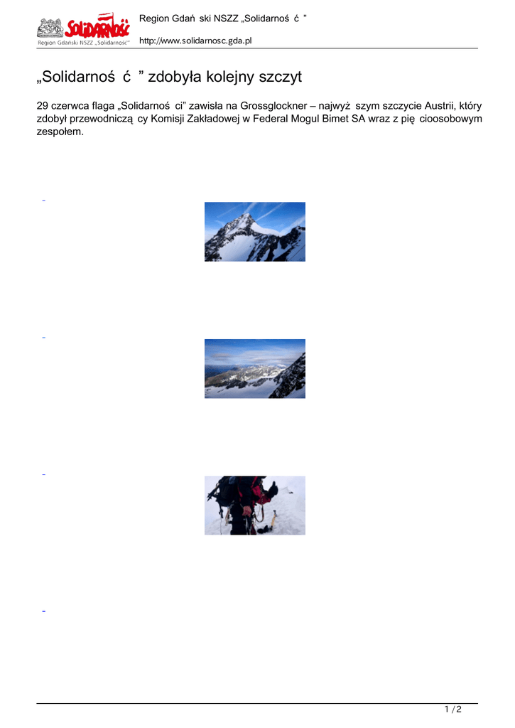 Region Gda ski NSZZ „Solidarno http://www.solidarnosc.gda.pl „Solidarno zdobyła kolejny szczyt 29 czerwca flaga „Solidarno ci zawisła na Grossglockner ‒ najwy szym szczycie Austrii, który zdobył przewodnicz cy Komisji Zakładowej w Federal Mogul Bimet SA wraz z pi cioosobowym zespołem. 1/2 Region Gda ski NSZZ „Solidarno http://www.solidarnosc.gda.pl Grossglockner wchodzi w skład tak zwanej Korony Europy ‒ najwy szych szczytów pa stw europejskich. Jest najwy szym szczytem Austrii o wysoko ci 3798 metrów nad poziomem morza, a tak e drugim szczytem Alp pod wzgl dem wybitno ci (wysoko od podstawy góry do szczytu, w przypadku Grossglockner jest to 2800 metrów). Wchodzi w skład Glocknergruppe, podgrupy górskiej Wysokich Taurów, cz ci Alp Centralnych. Wznosi si ponad lodowcem Pasterze. Na uwag zasługuje charakterystyczny kształt przypominaj cego piramid szczytu ‒ składaj si na niego dwa wierzchołki ‒ Grossglockner oraz Kleinglockner, które rozdziela mała, w ska przeł cz nazywana Glocknerscharte. Na szczycie znajduje si krzy zwany cesarskim (Kaiserkreuz) o masie 350 kilogramów, który został ustawiony w 25. rocznic lubu Franciszka Józefa I z El biet Wittelsbach nazywan Sissi. 29 czerwca obok niego zawisła flaga „Solidarno ci . - Góry to moja pasja. Jestem szcz liwy, e udało mi si wej na gór , która liczy prawie 4000 m n.p.m. Jest to mój rekord, ale i dobry pocz tek zdobywania gór wysokich. W przyszło ci planuj kolejne wyprawy, m.in. na Mont Blanc ‒ najwy szy szczyt Starego Kontynentu. B d tam zabierał nasz flag ‒ zapowiada Paweł Dziwosz. To ju drugi w tym roku szczyt, na którym zawisła flaga „Solidarno ci . Liczymy na kolejne! 2/2 Powered by TCPDF (www.tcpdf.org)